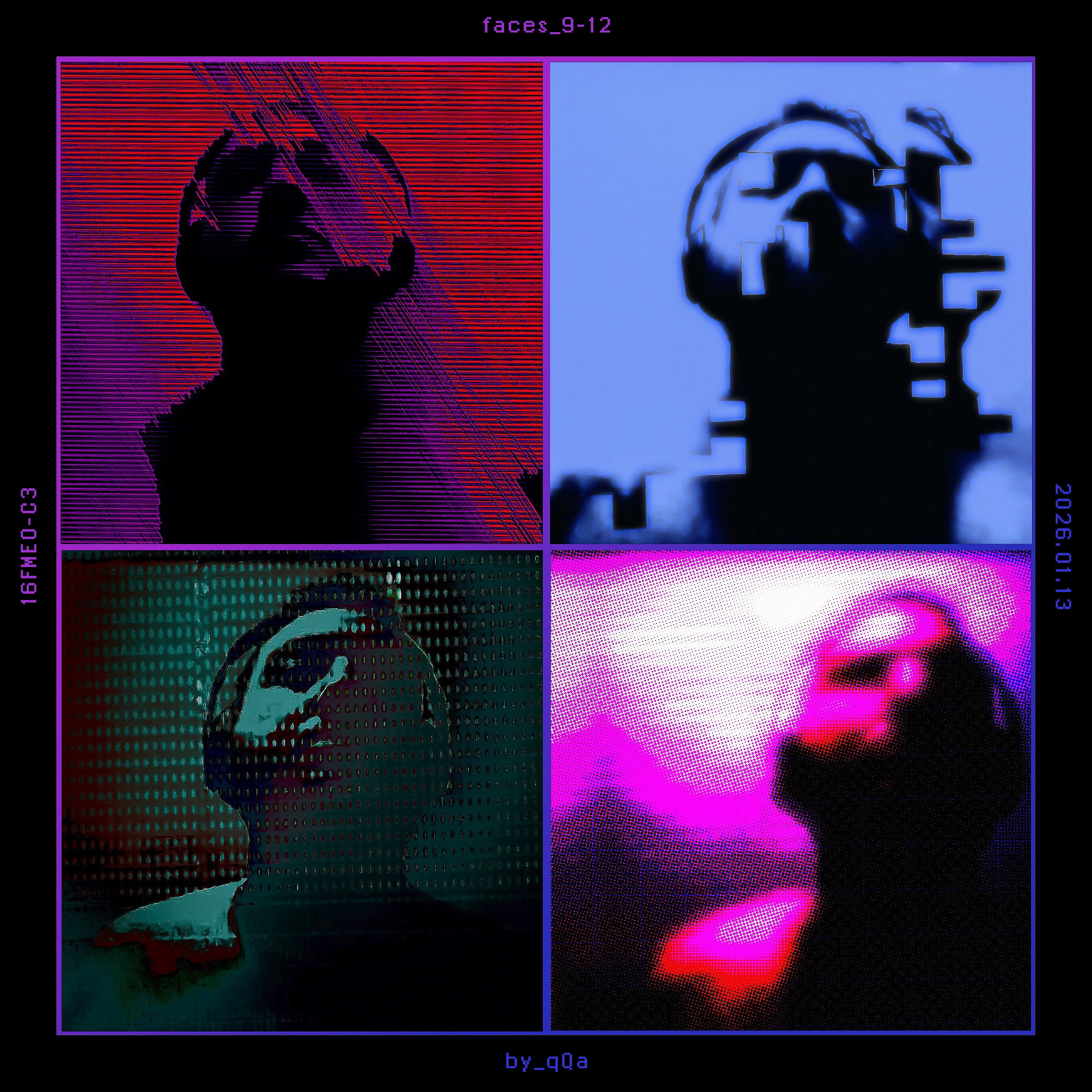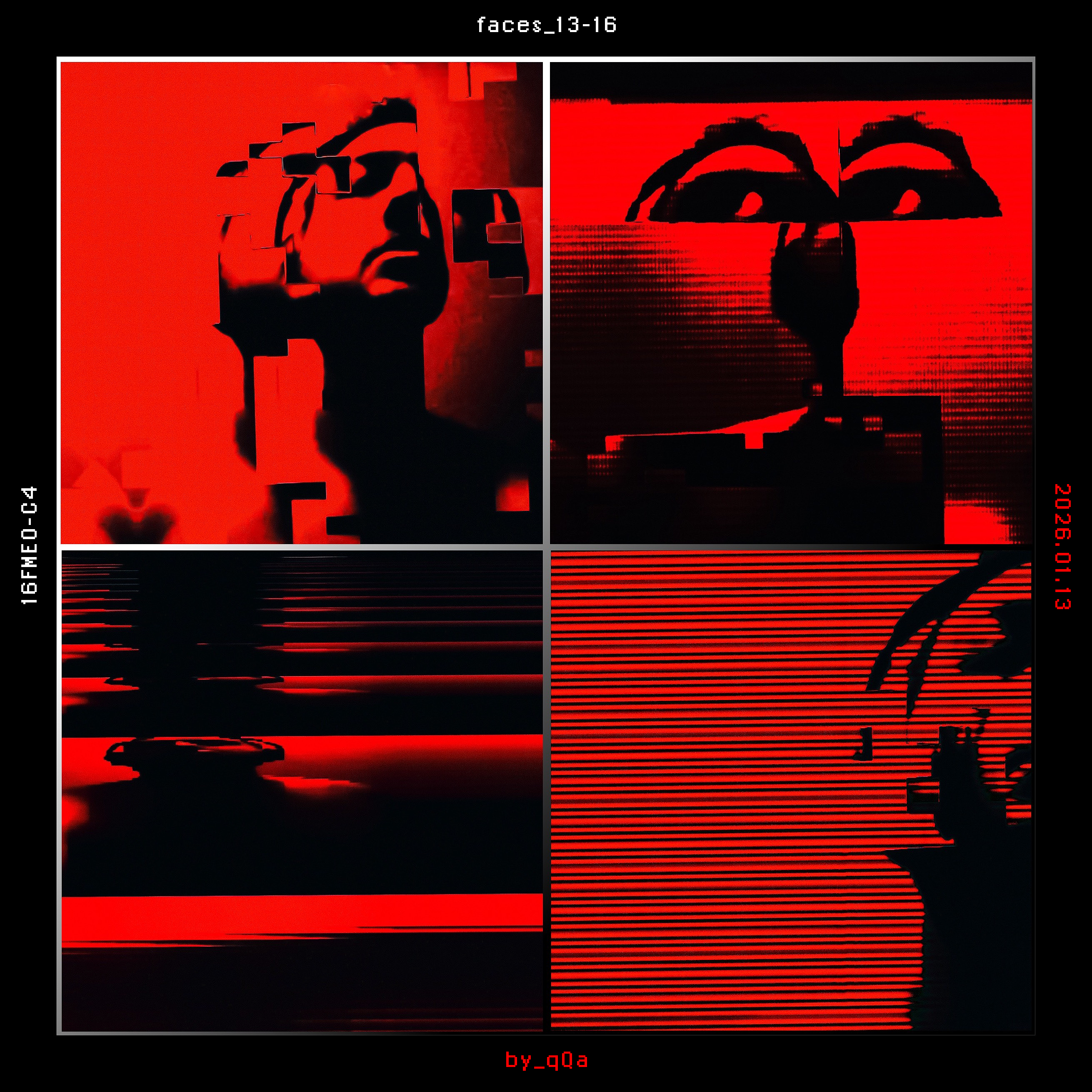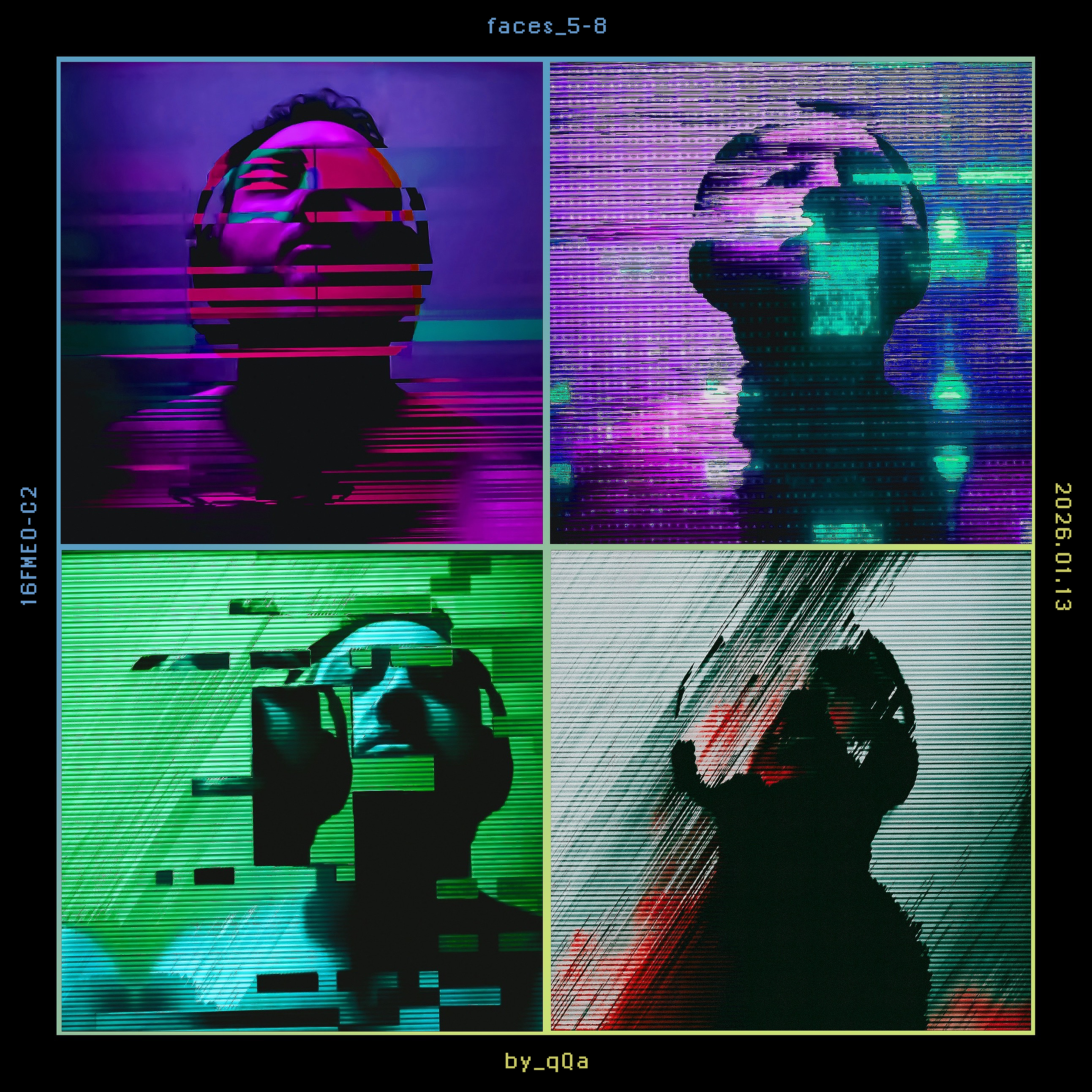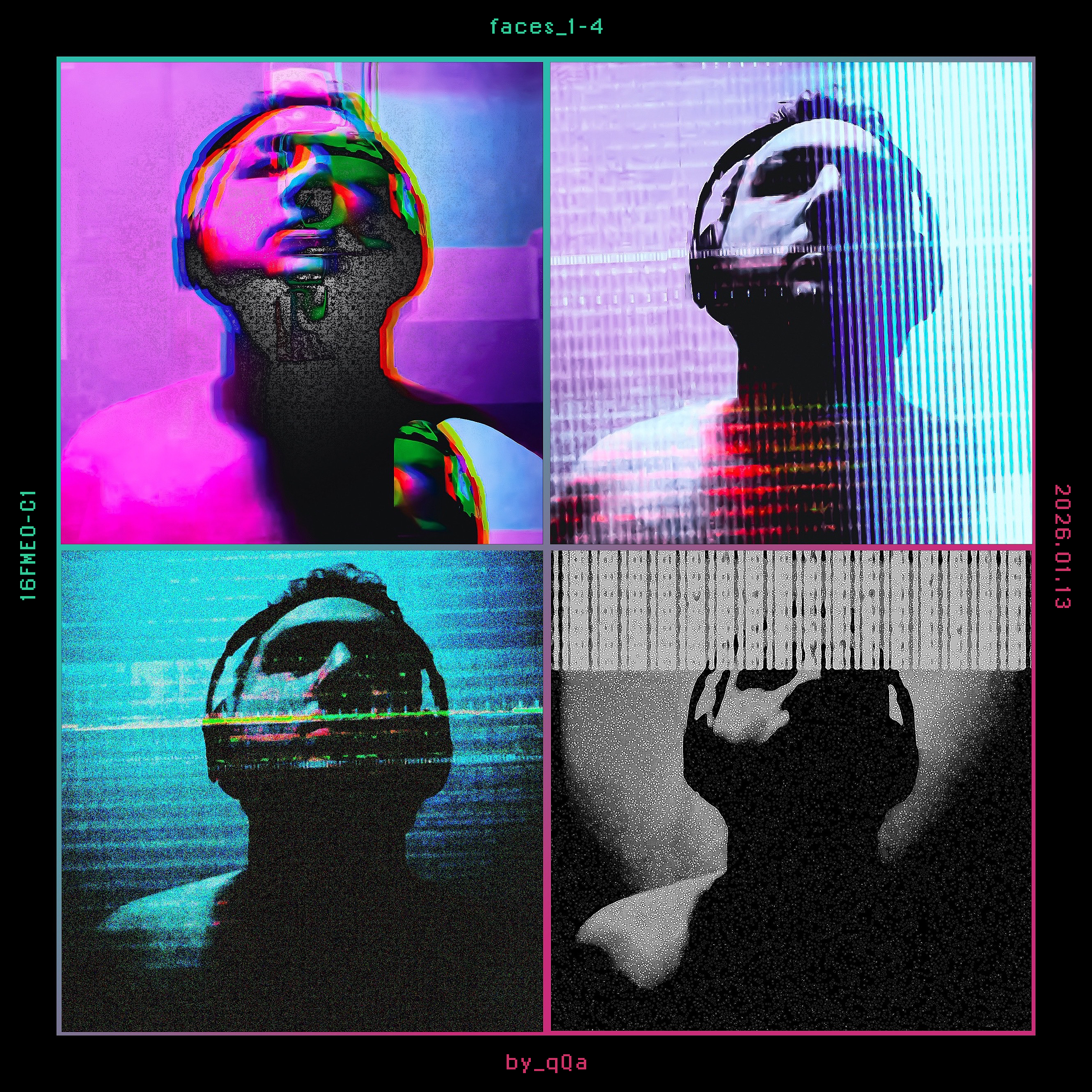Low resolution self-videography stills with fractured digital overlay.