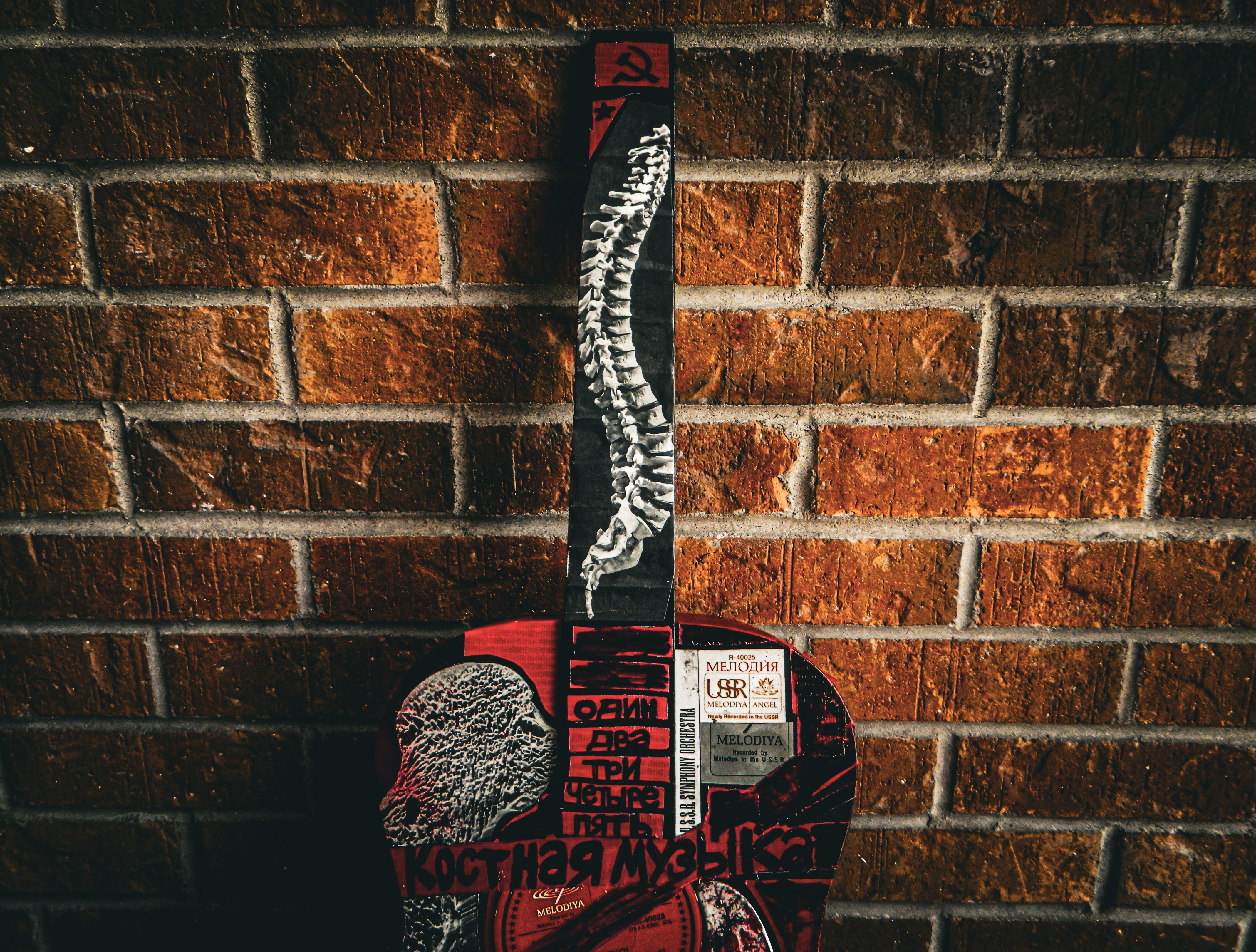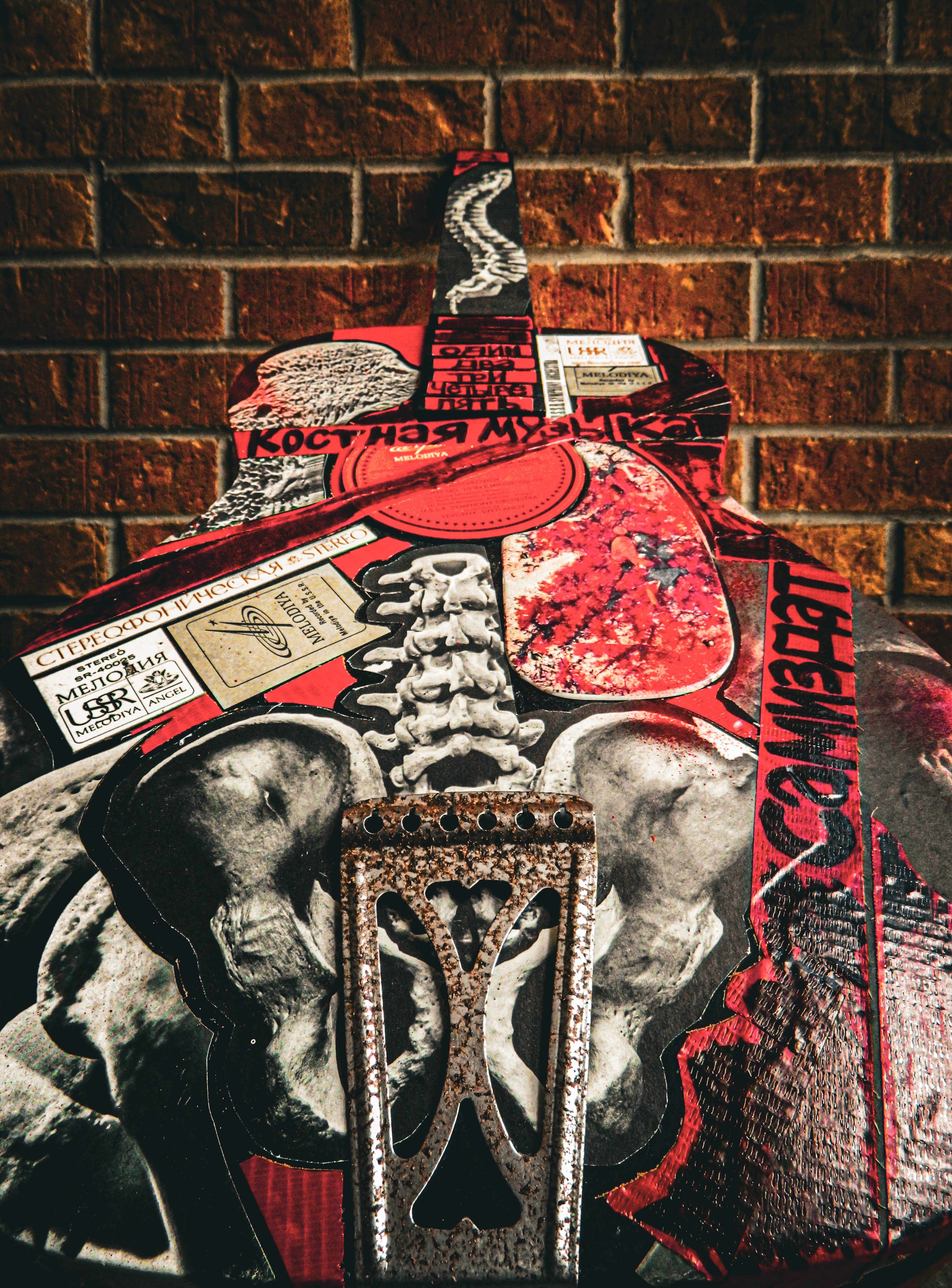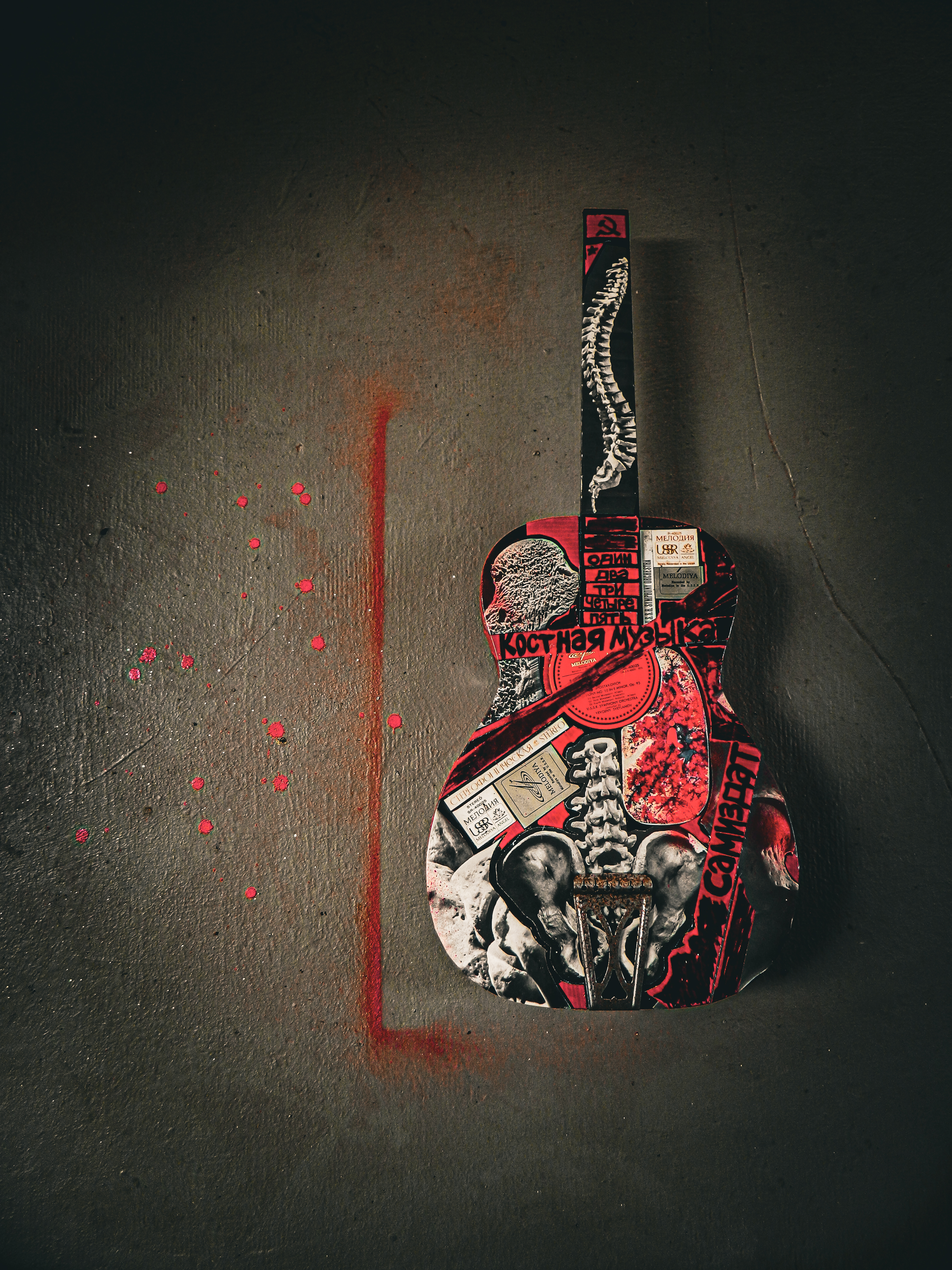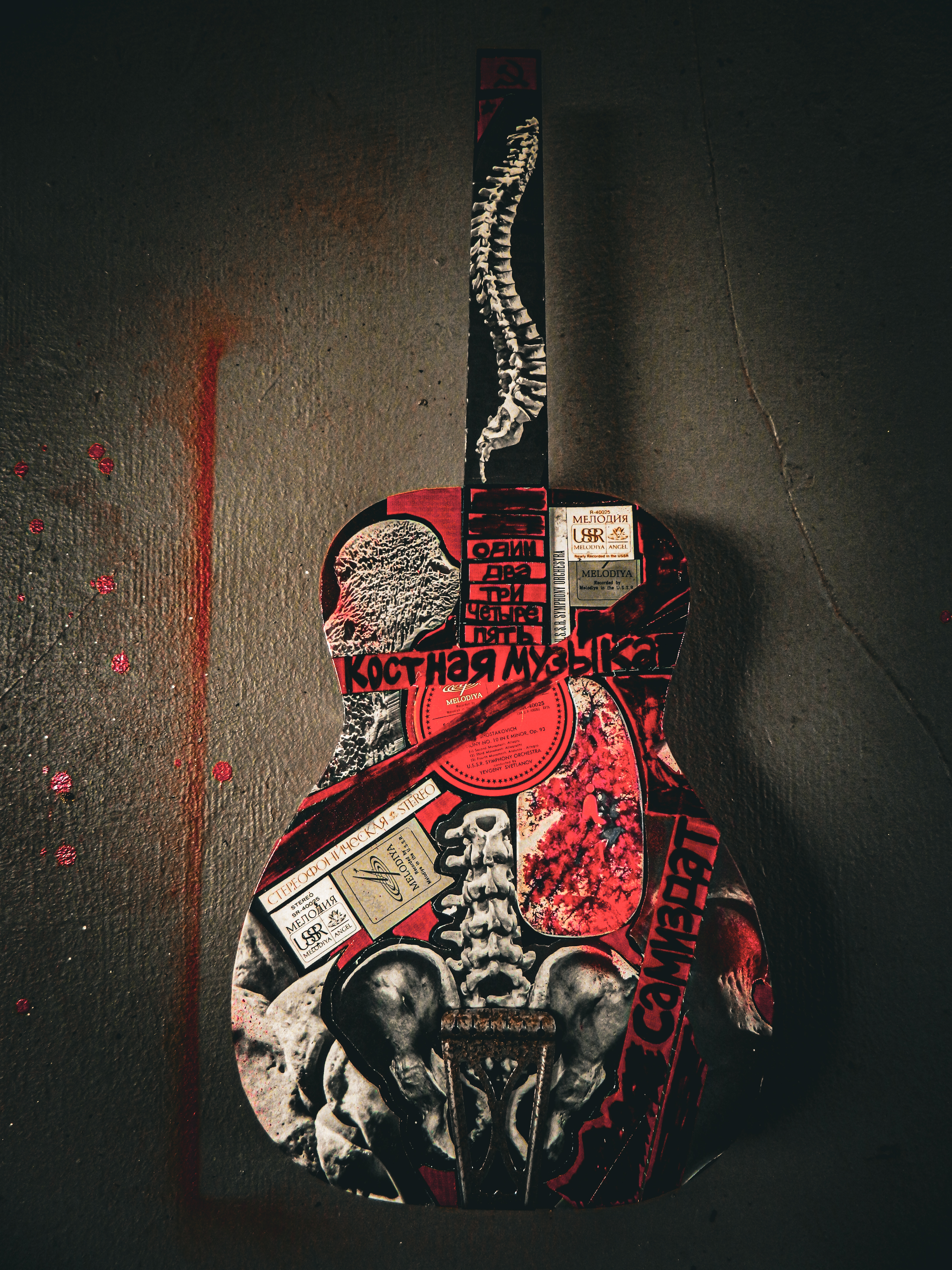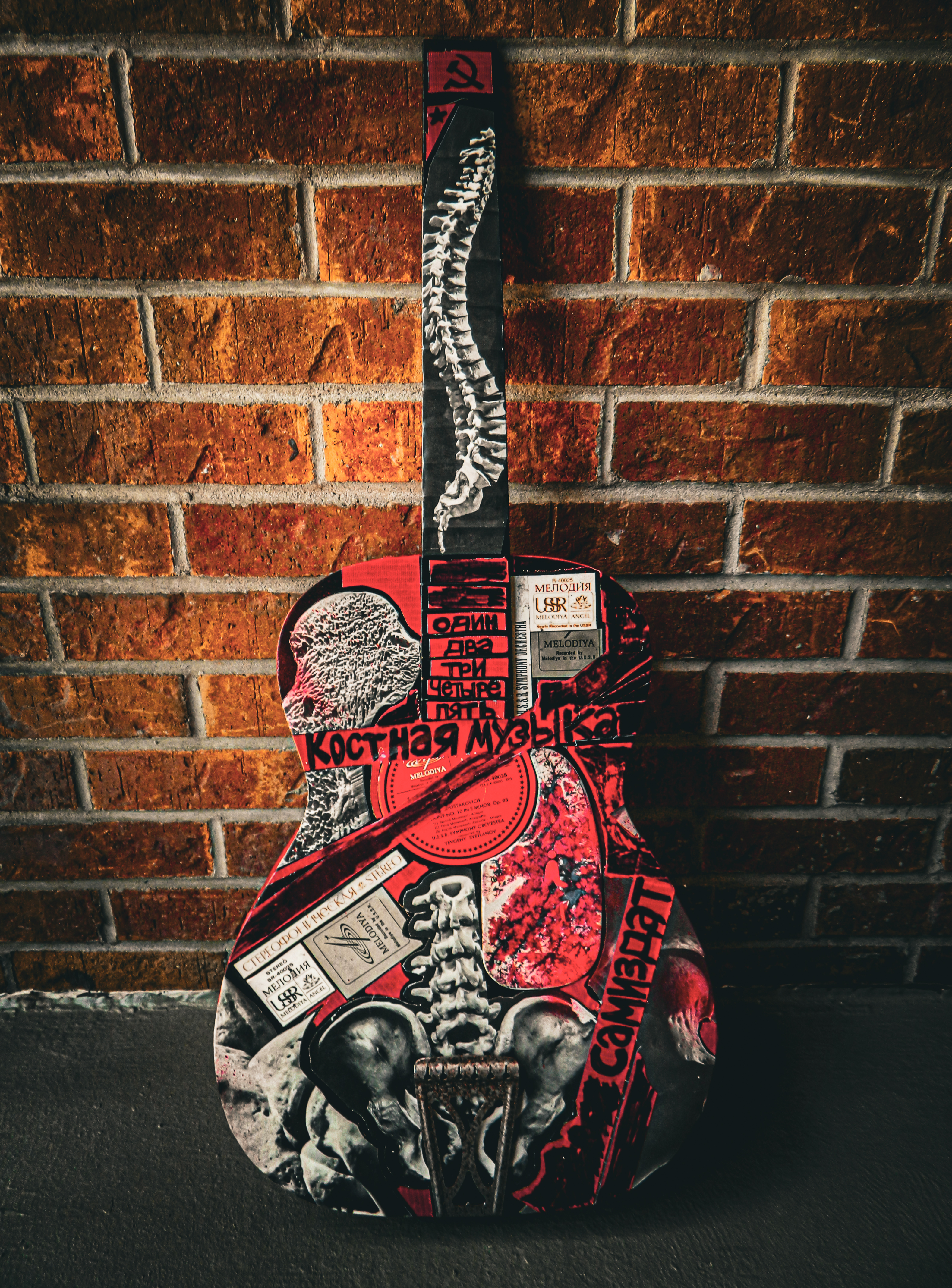 Ink, spray paint, duct tape, vintage skeletal photos, and vintage USSR records on a vintage acoustic guitar.