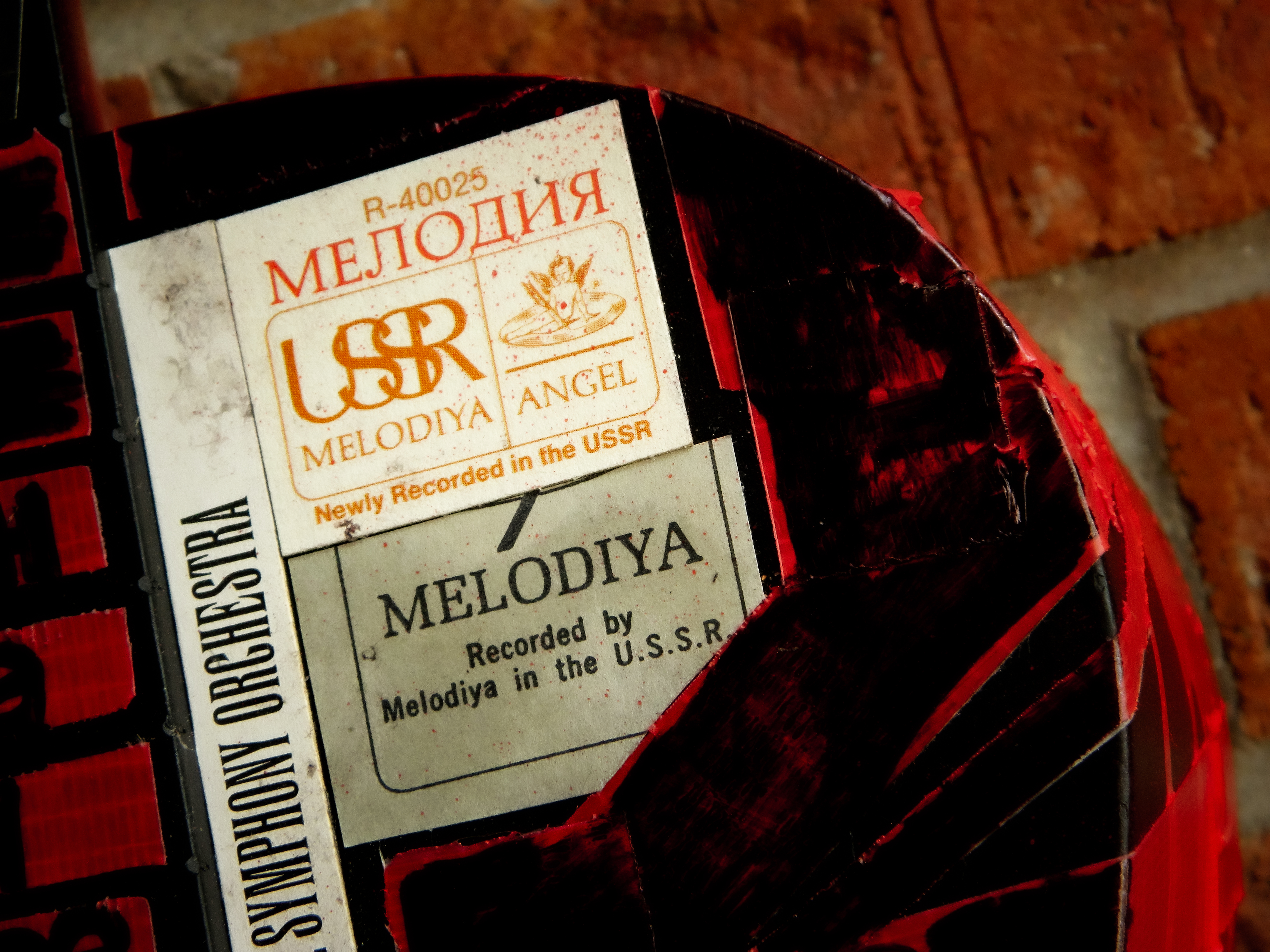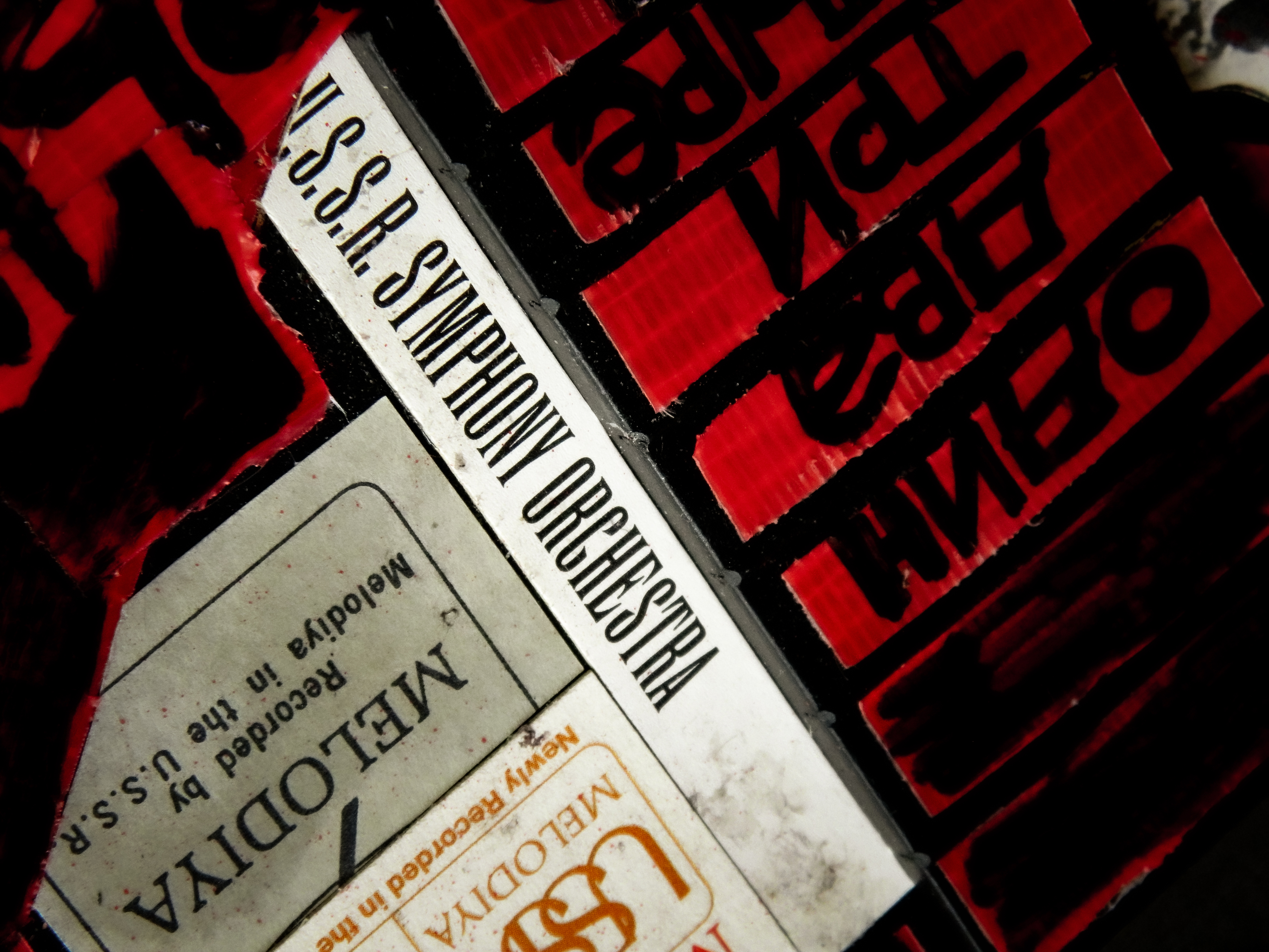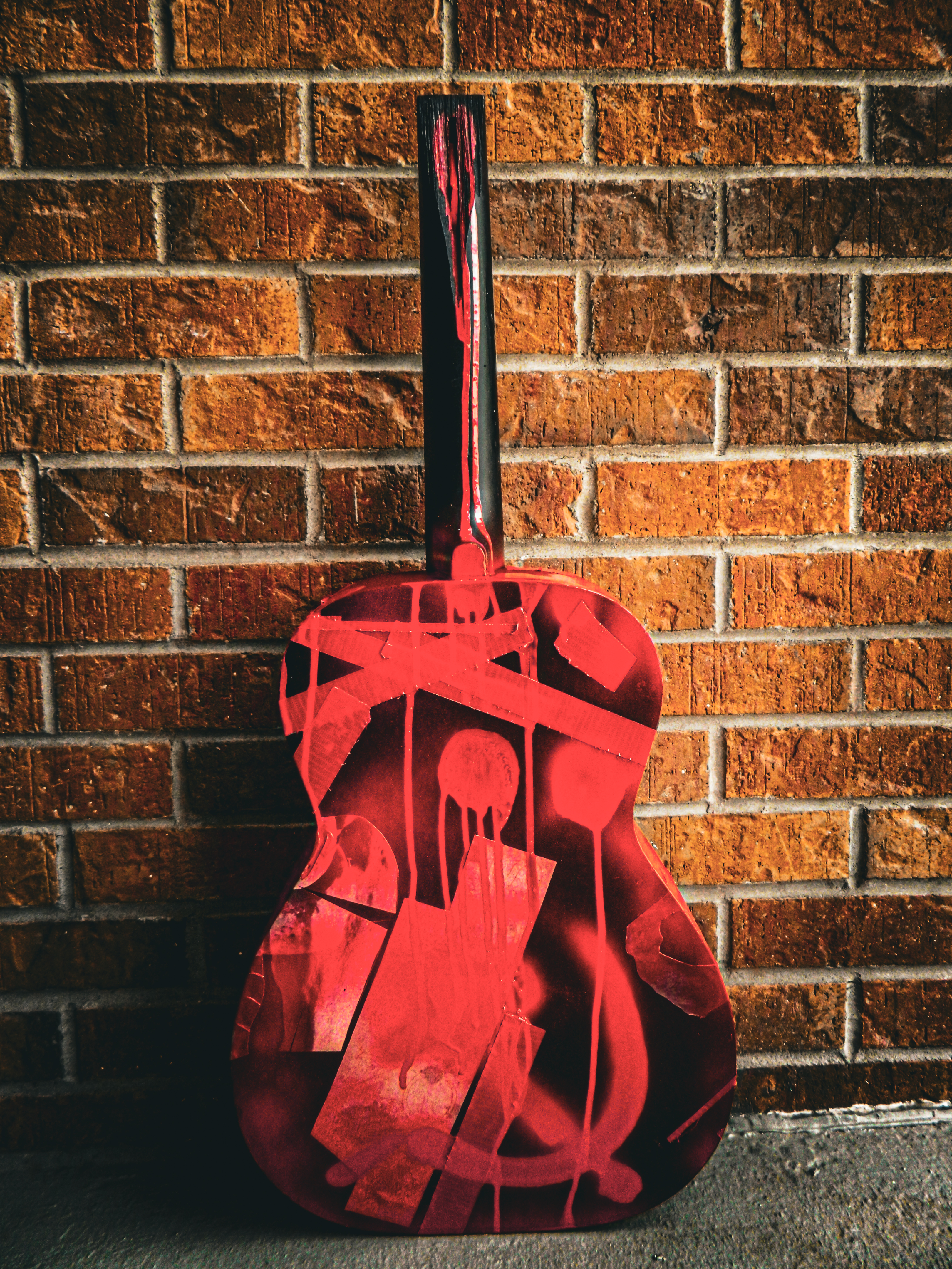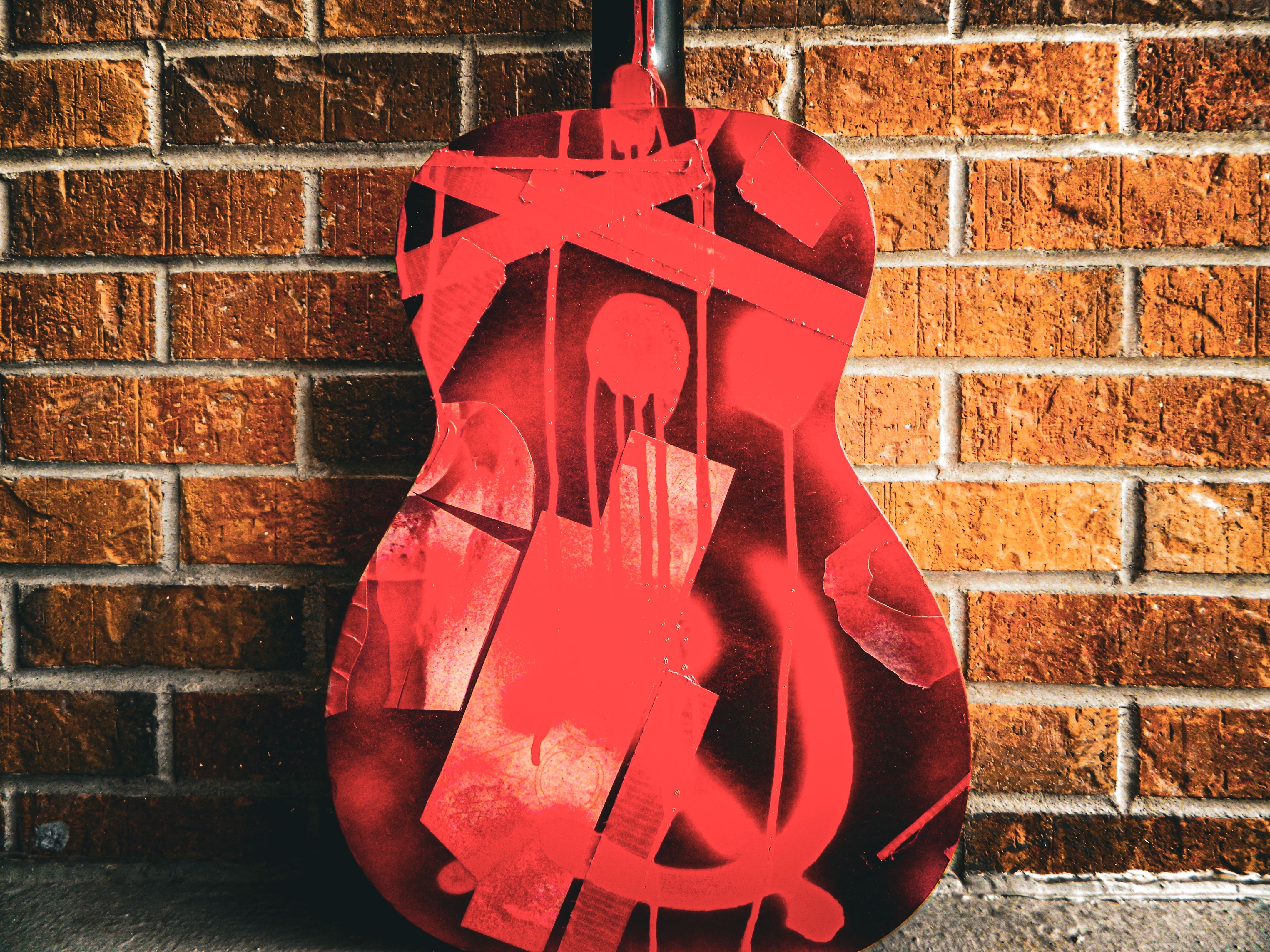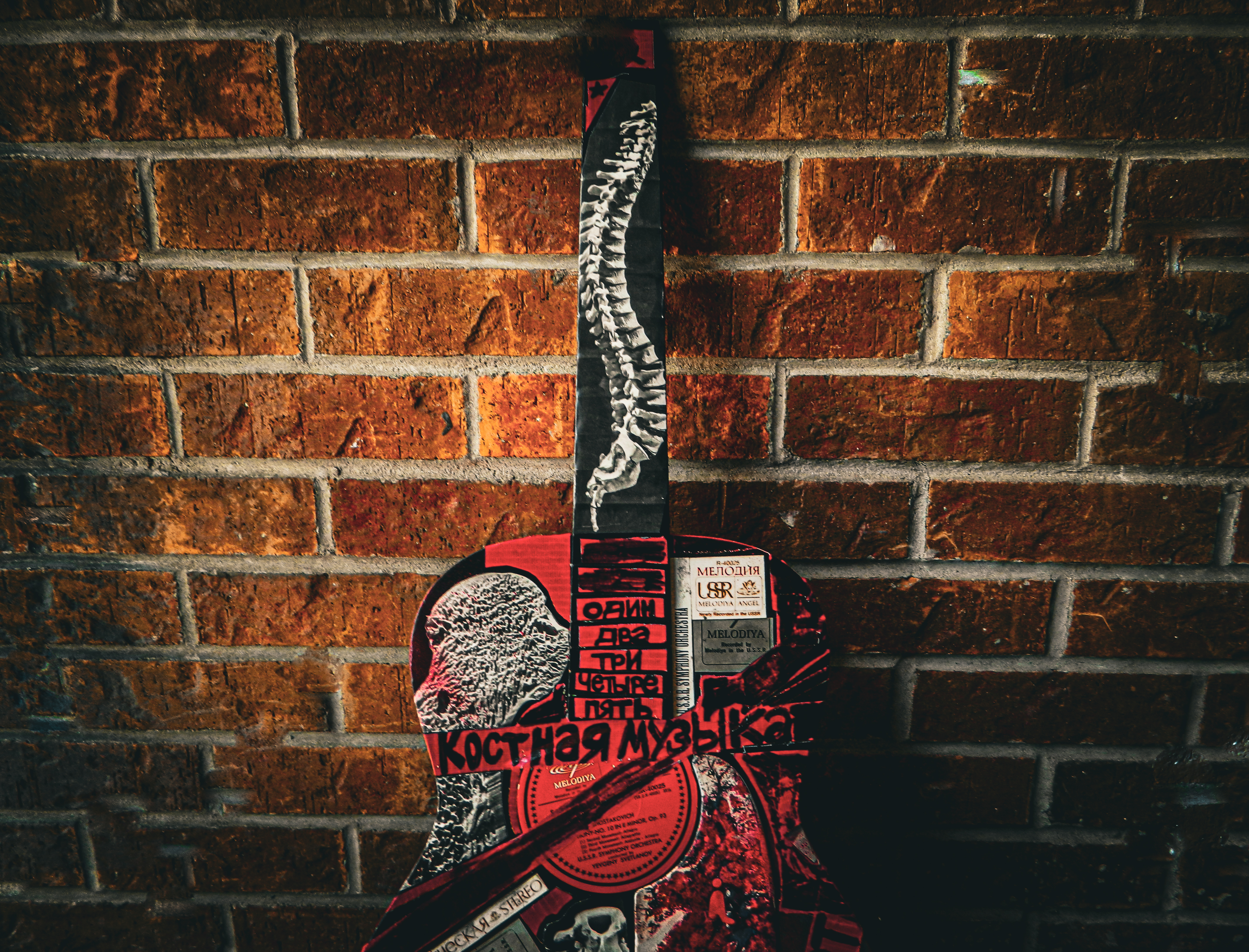 Ink, spray paint, duct tape, vintage skeletal photos, and vintage USSR records on a vintage acoustic guitar.