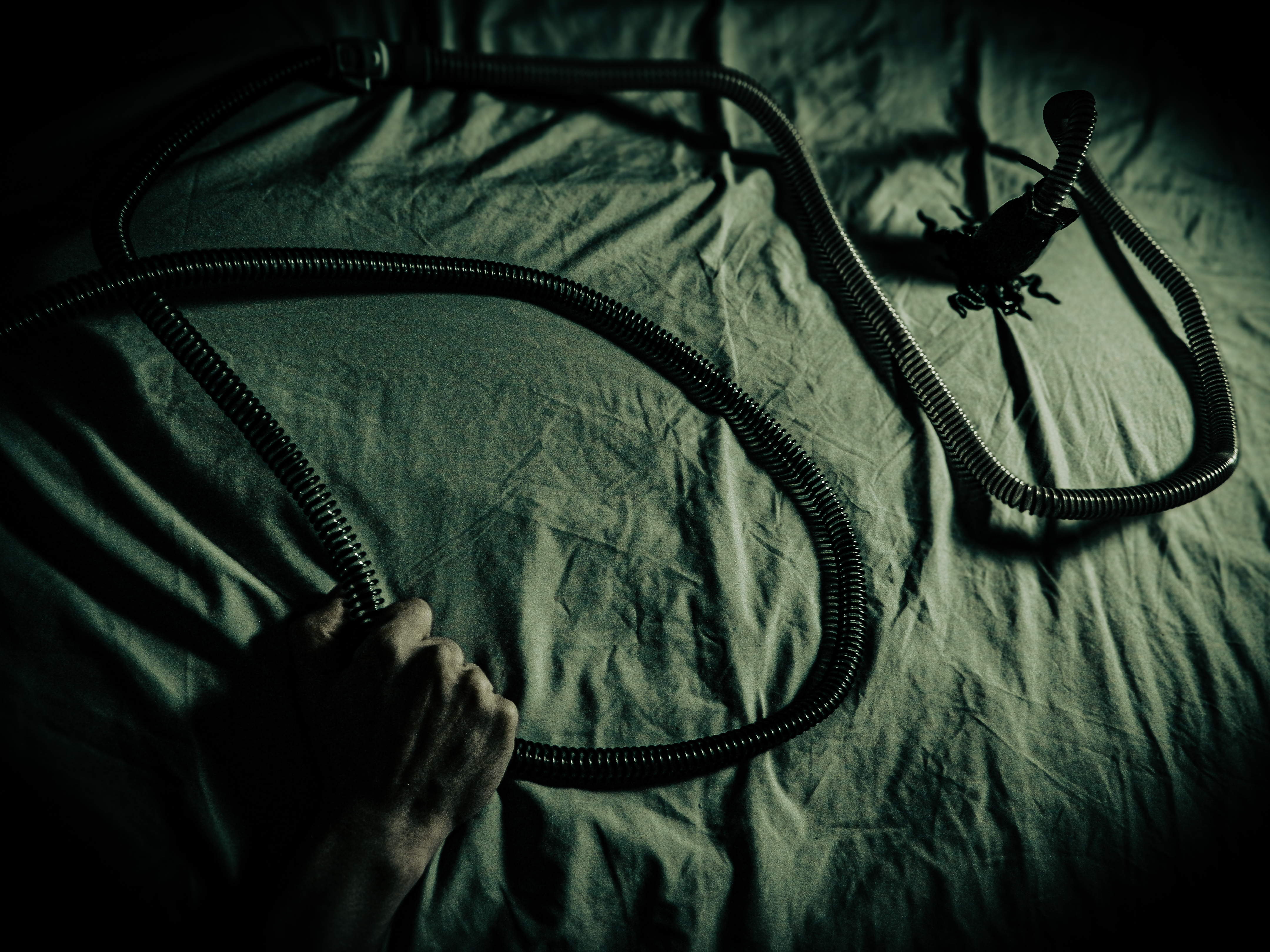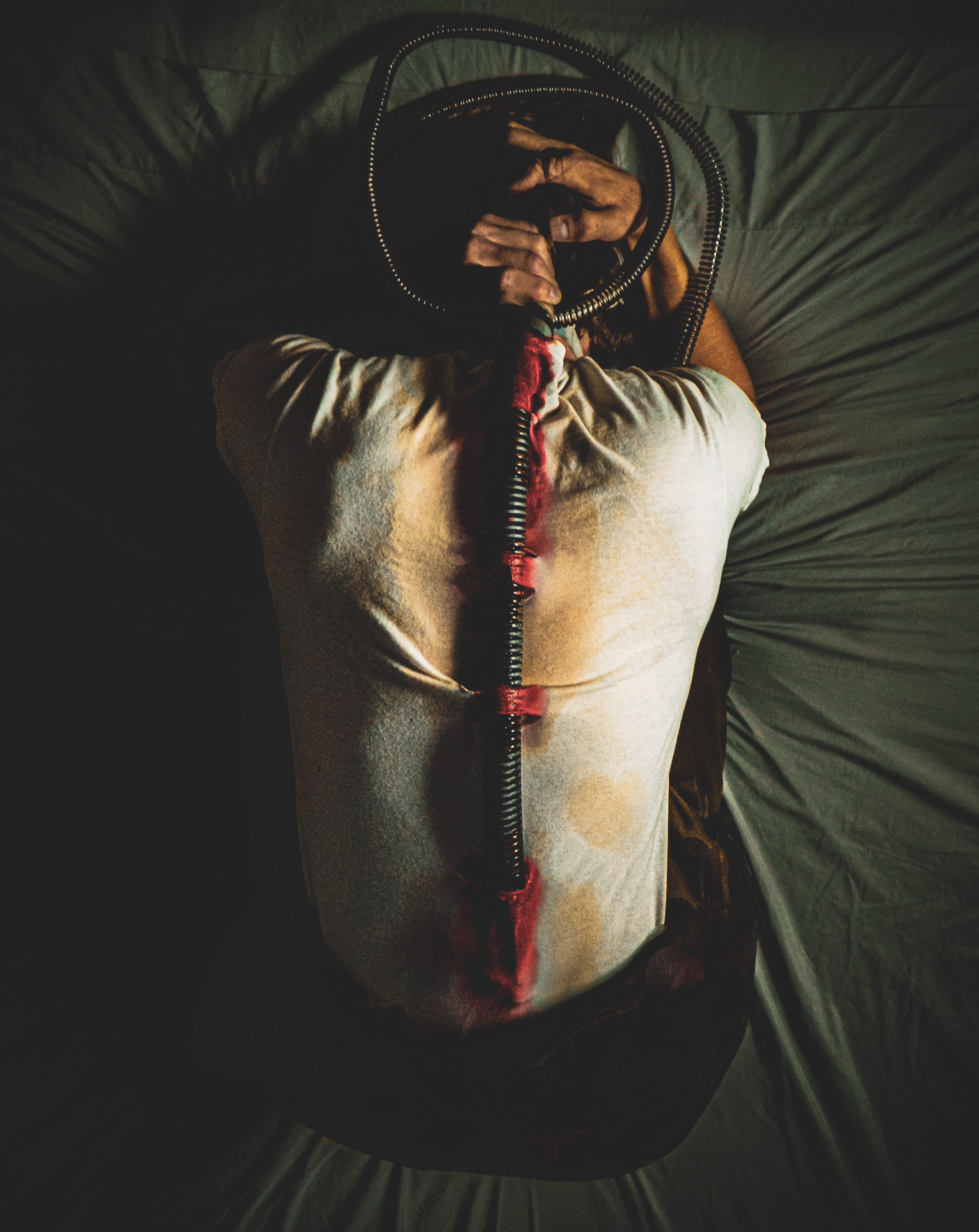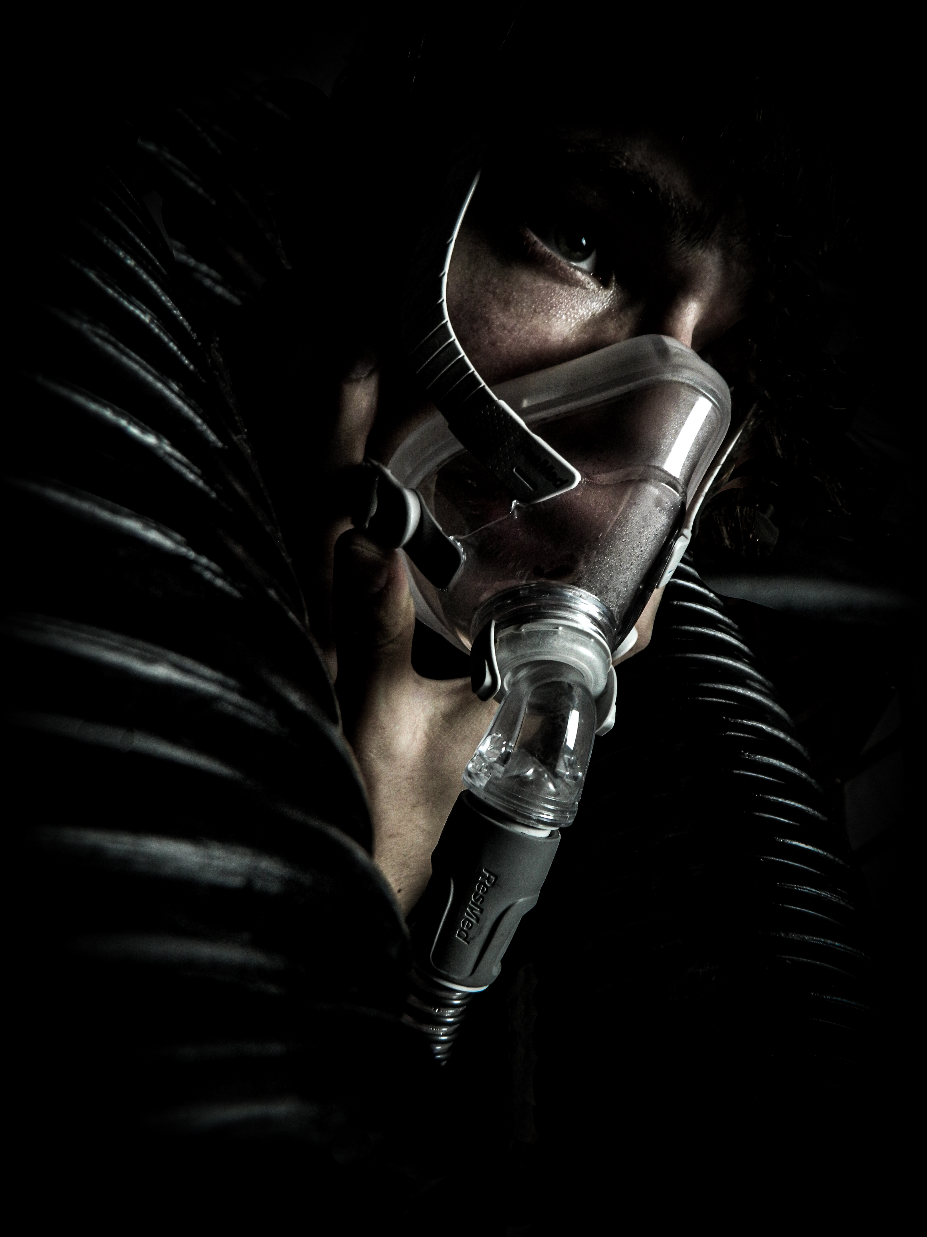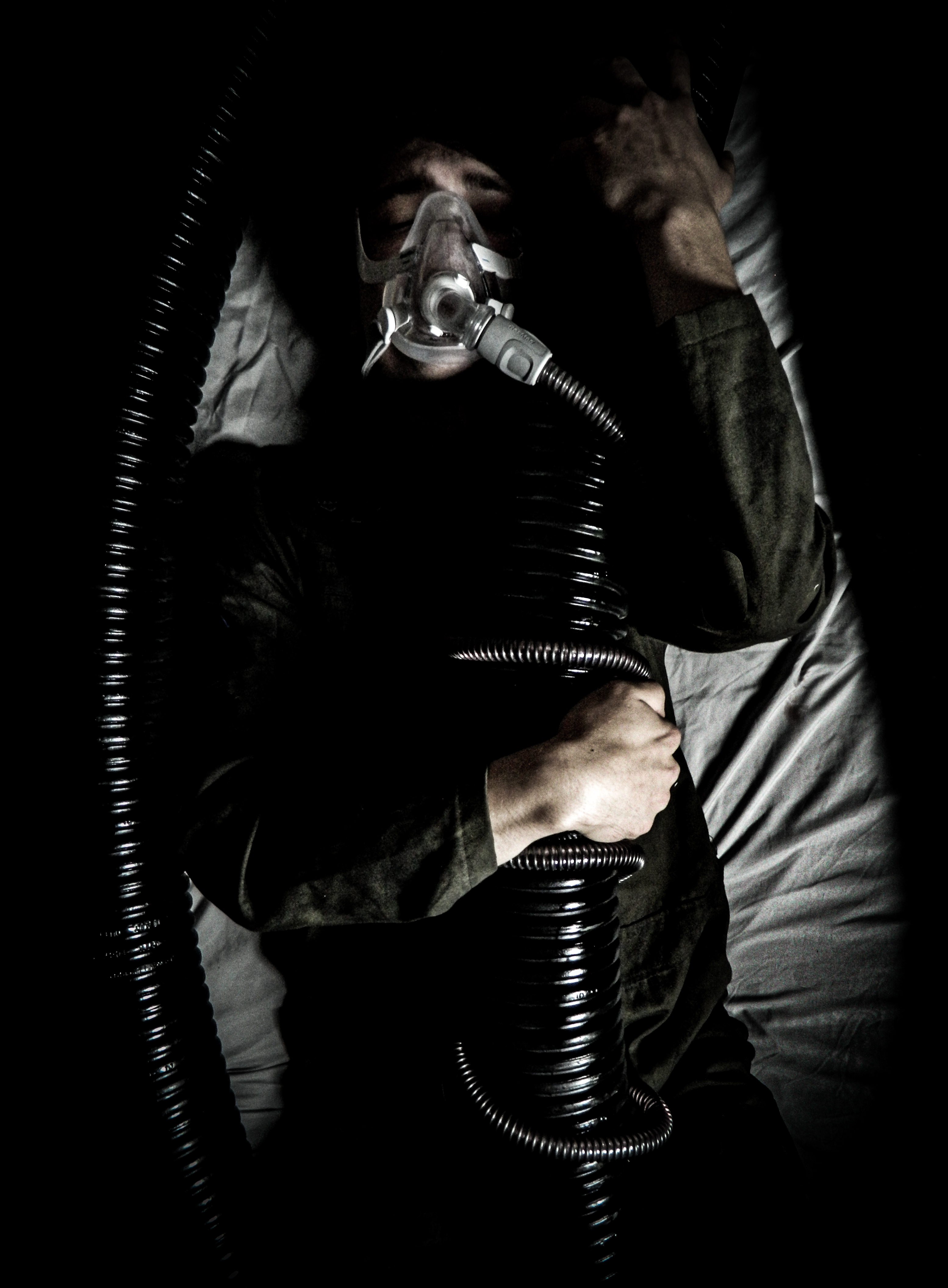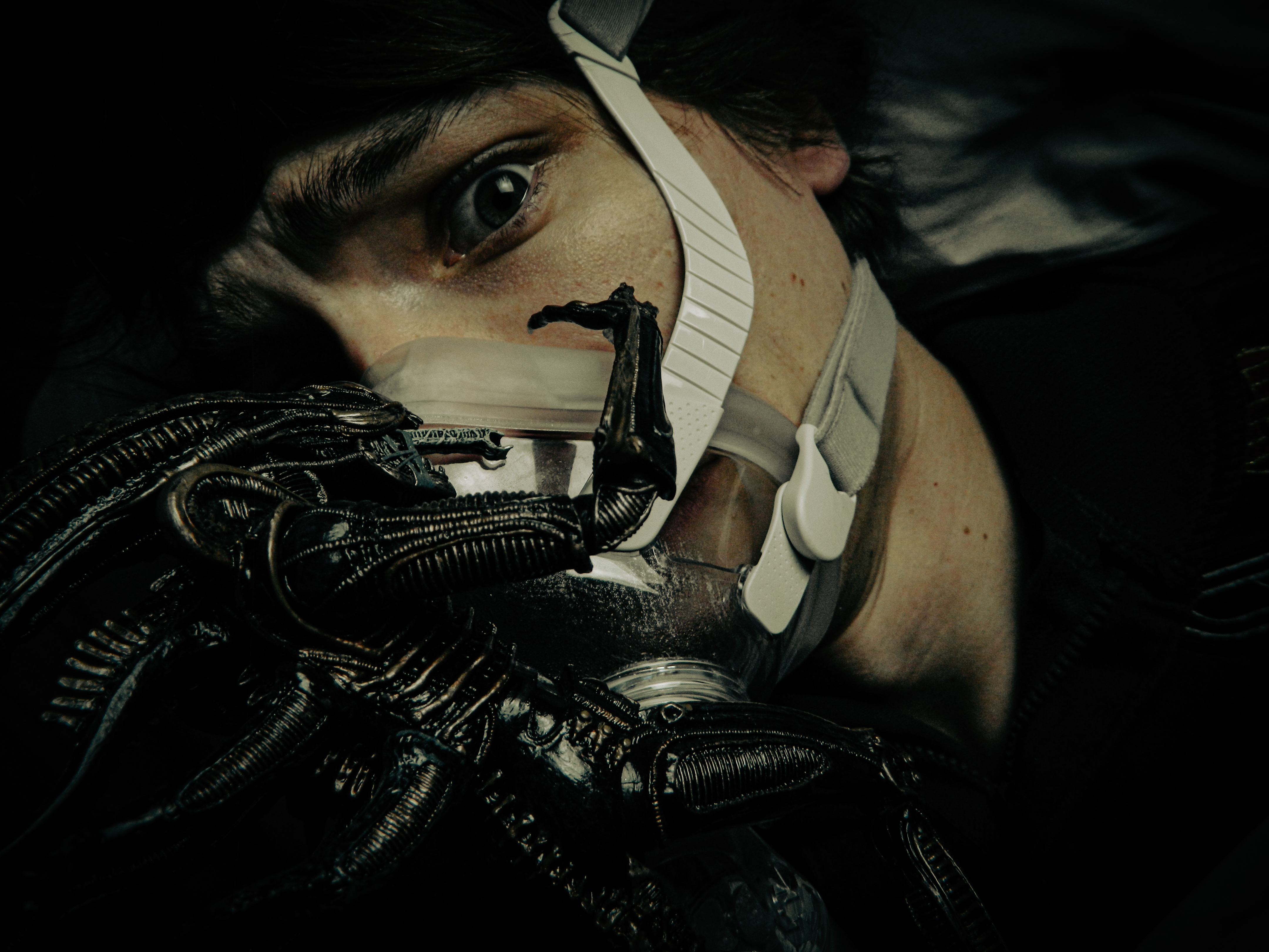 “Ever since I was diagnosed with severe obstructive sleep apnea, I couldn’t help but draw parallels between the organic texture of my CPAP machine and the biomechanics of H.R. Giger’s work, namely, his work on Ridley Scott’s Alien (1979), a frequent bedtime movie of mine. Having spent many a night unable to breathe, only to then be secured to this bizarre face apparatus, I felt the marriage of themes produced a clear outline for a conceptual scene: a portait of an exhausted victim whose nightmare takes the form of smothering, strangulation, and the bodily invasion of some alien entity.”