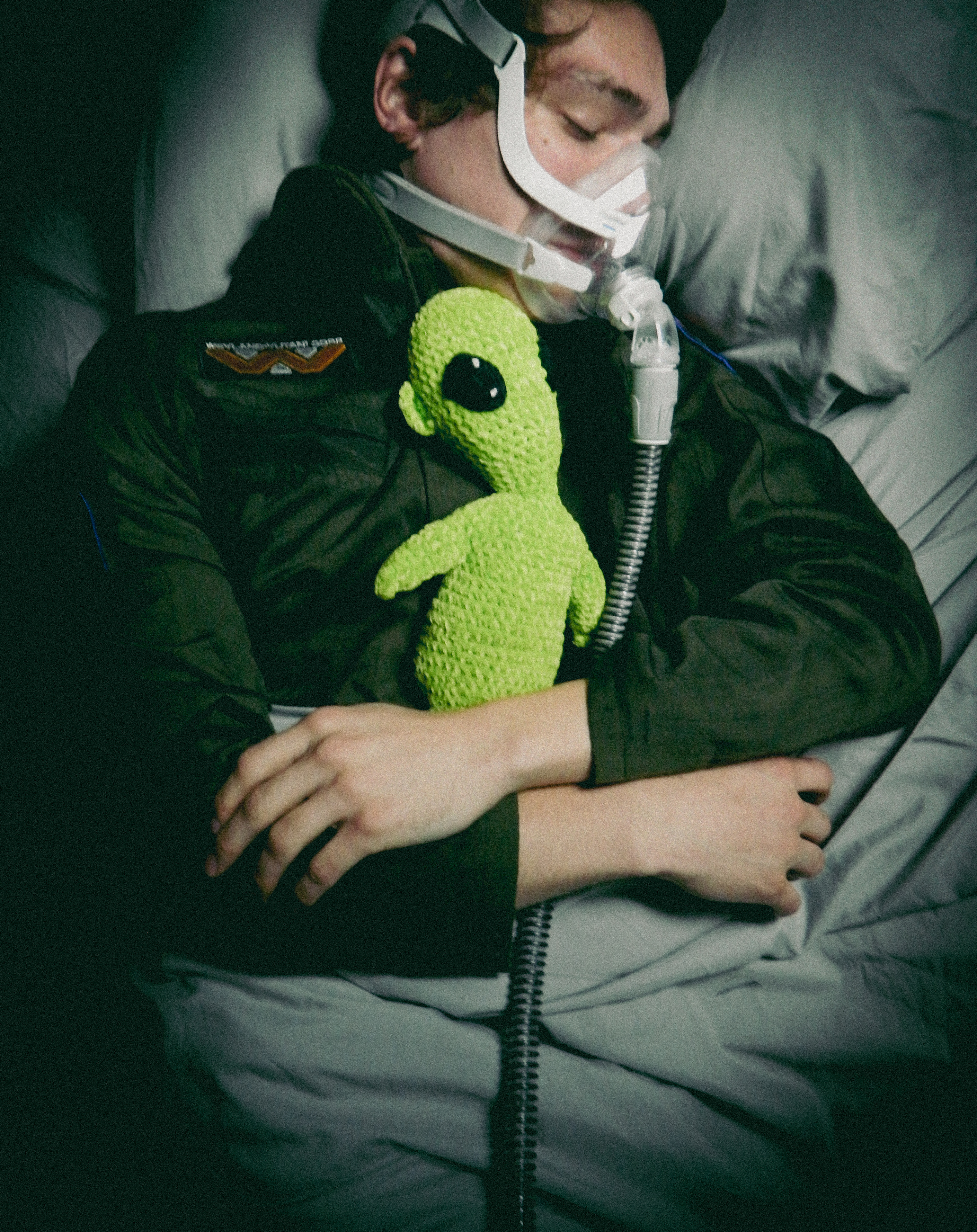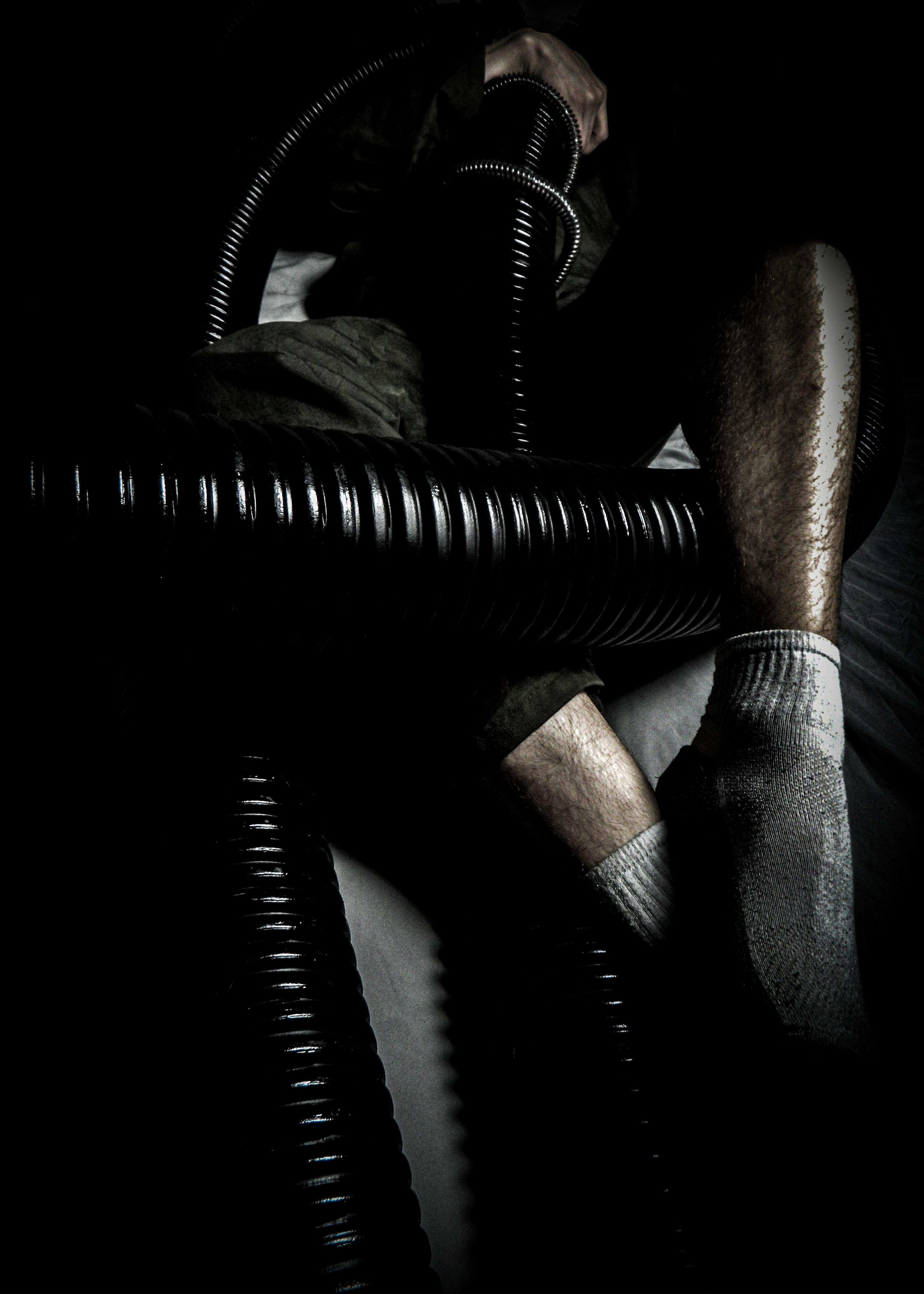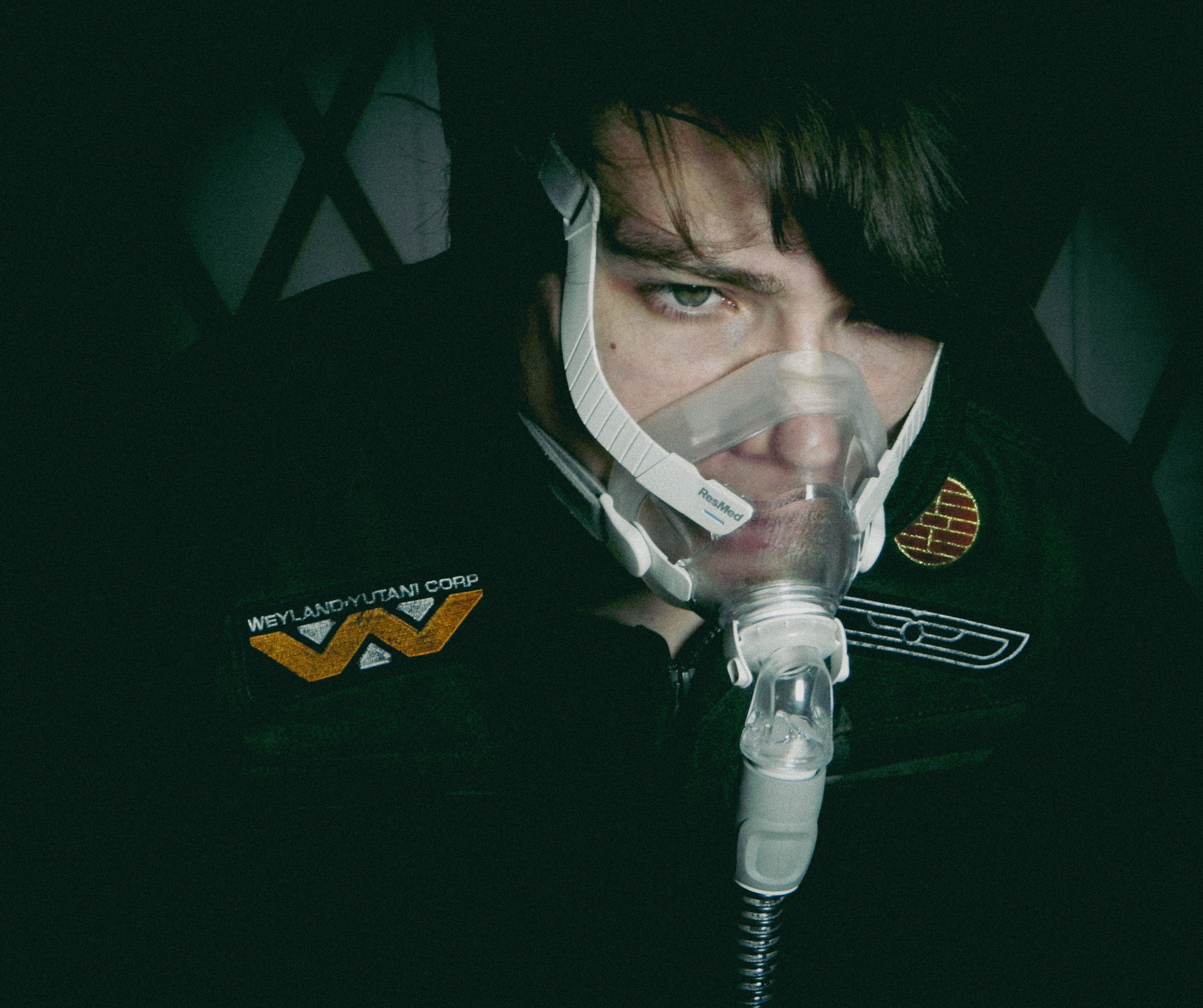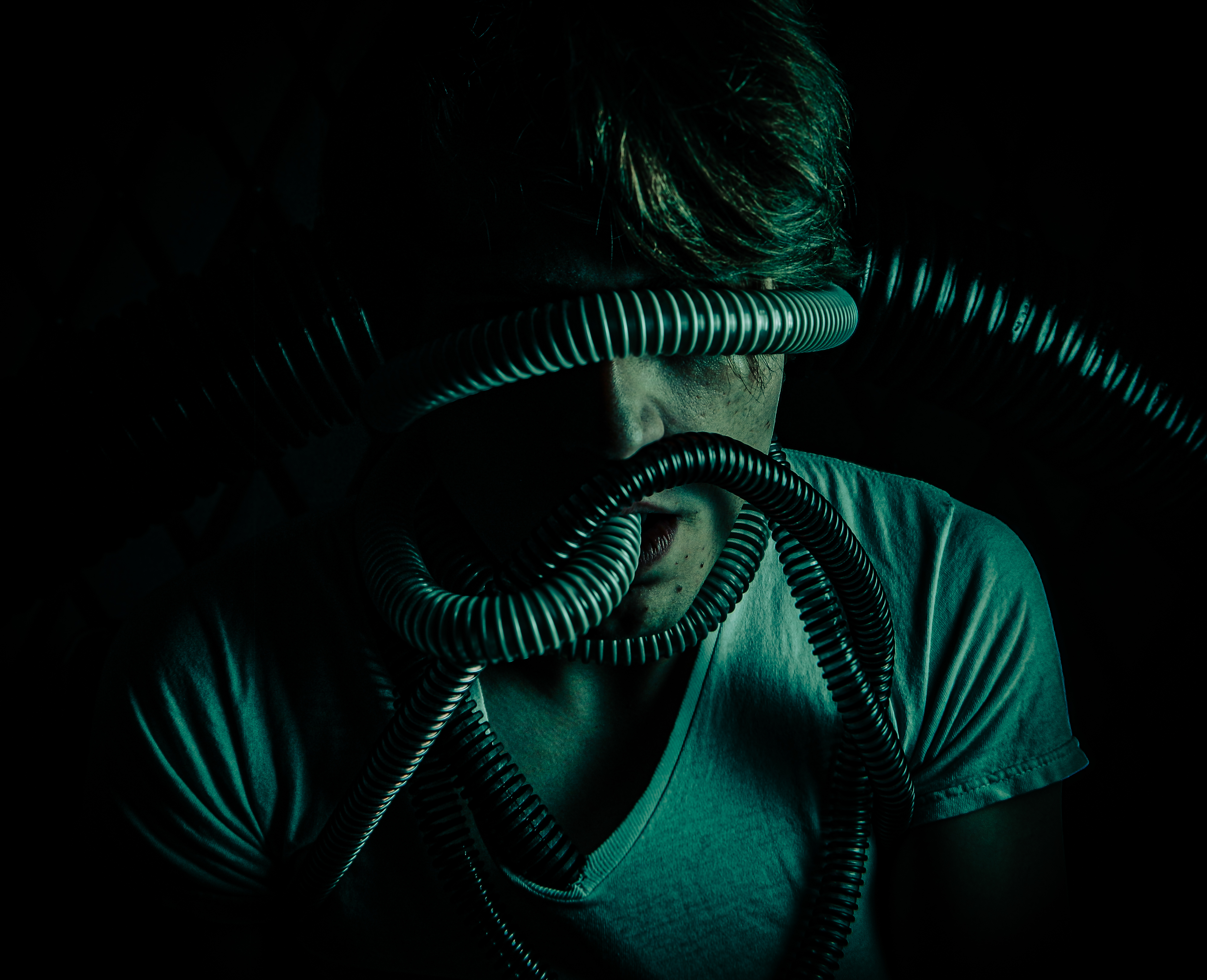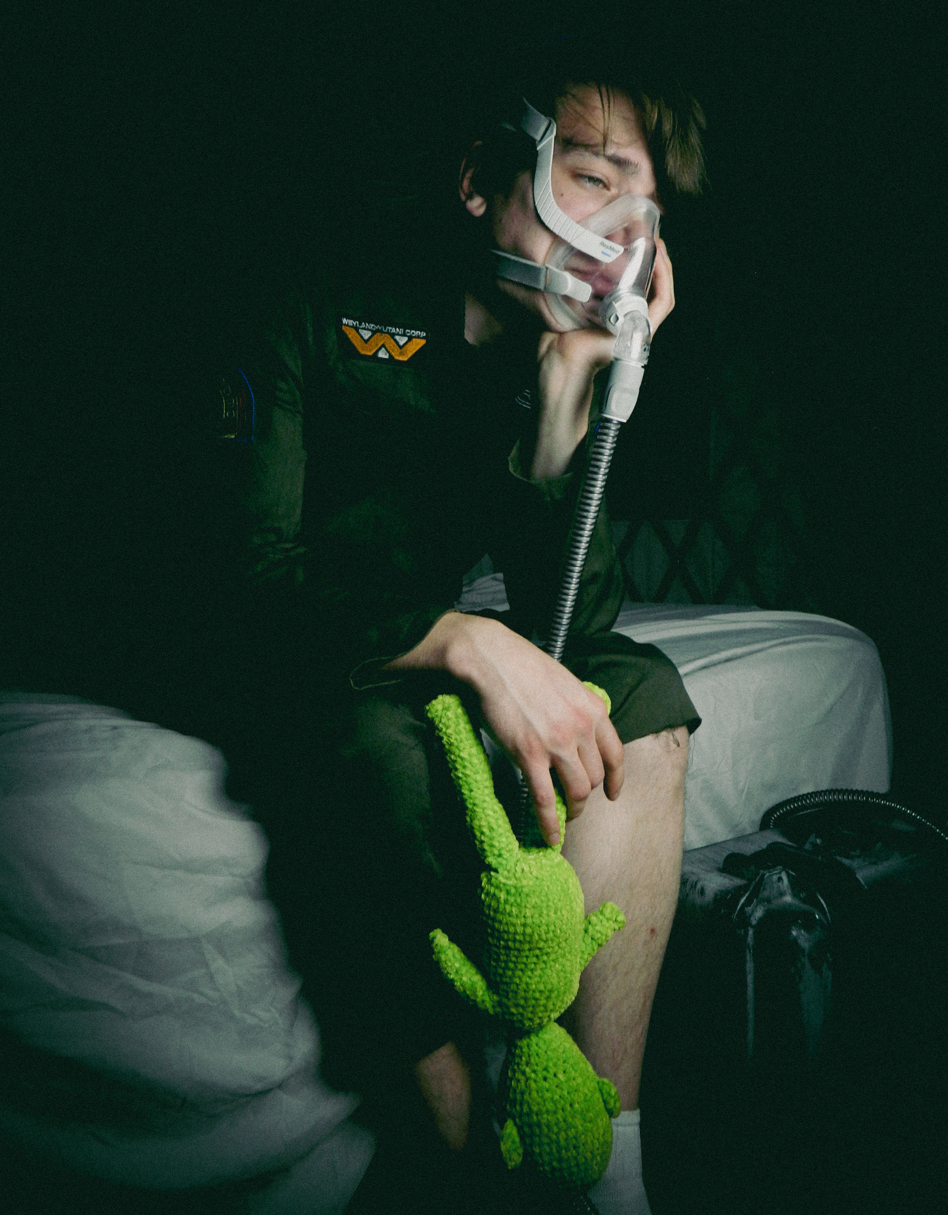 “Ever since I was diagnosed with severe obstructive sleep apnea, I couldn’t help but draw parallels between the organic texture of my CPAP machine and the biomechanics of H.R. Giger’s work, namely, his work on Ridley Scott’s Alien (1979), a frequent bedtime movie of mine. Having spent many a night unable to breathe, only to then be secured to this bizarre face apparatus, I felt the marriage of themes produced a clear outline for a conceptual scene: a portait of an exhausted victim whose nightmare takes the form of smothering, strangulation, and the bodily invasion of some alien entity.”