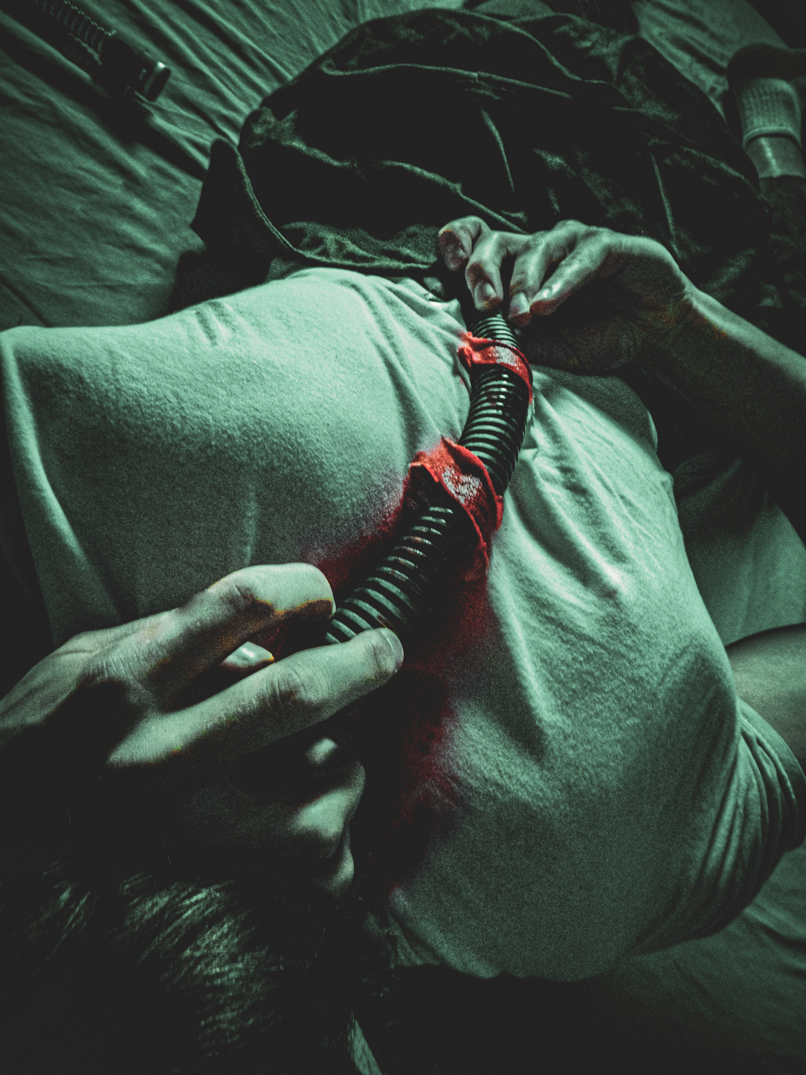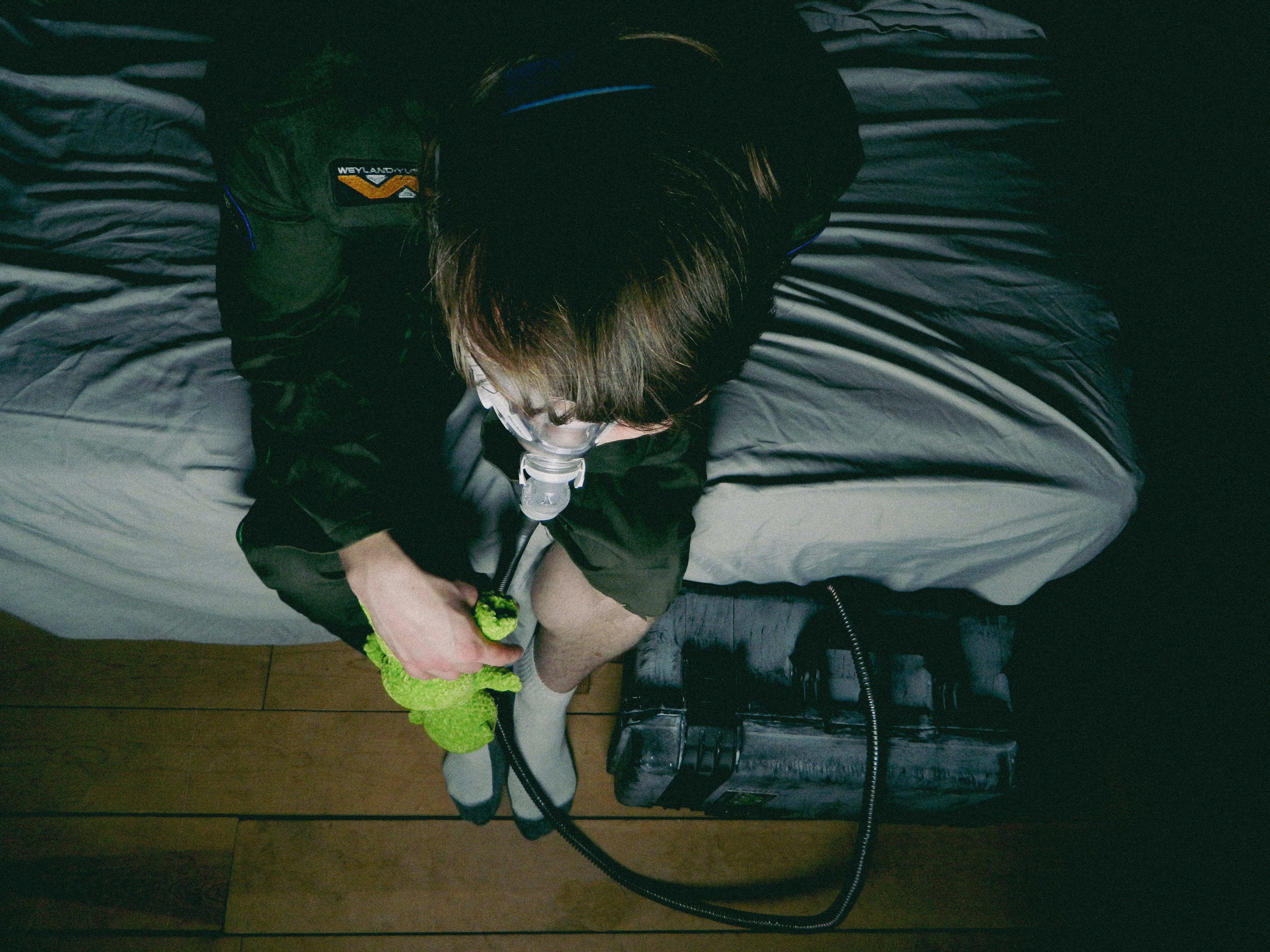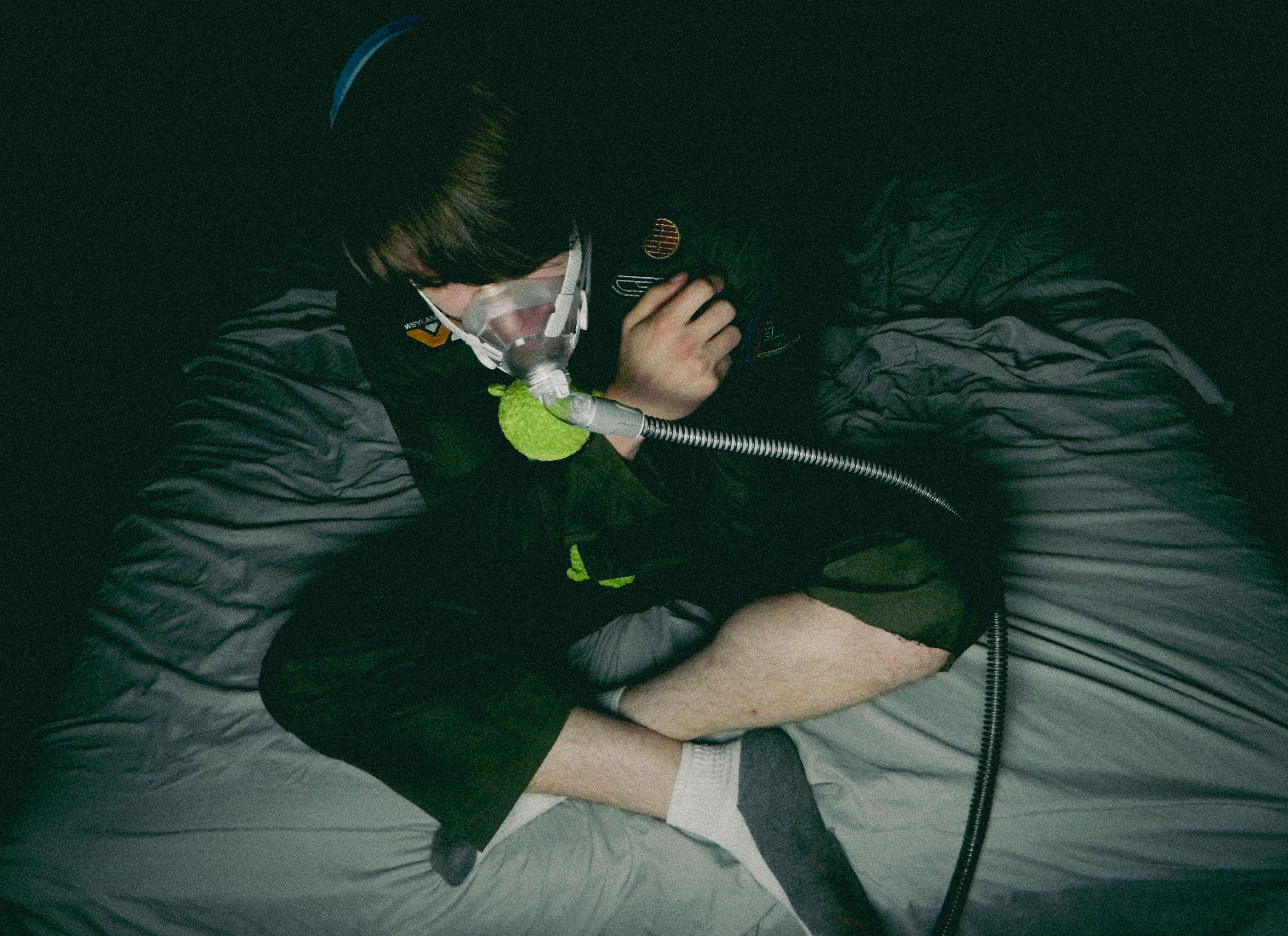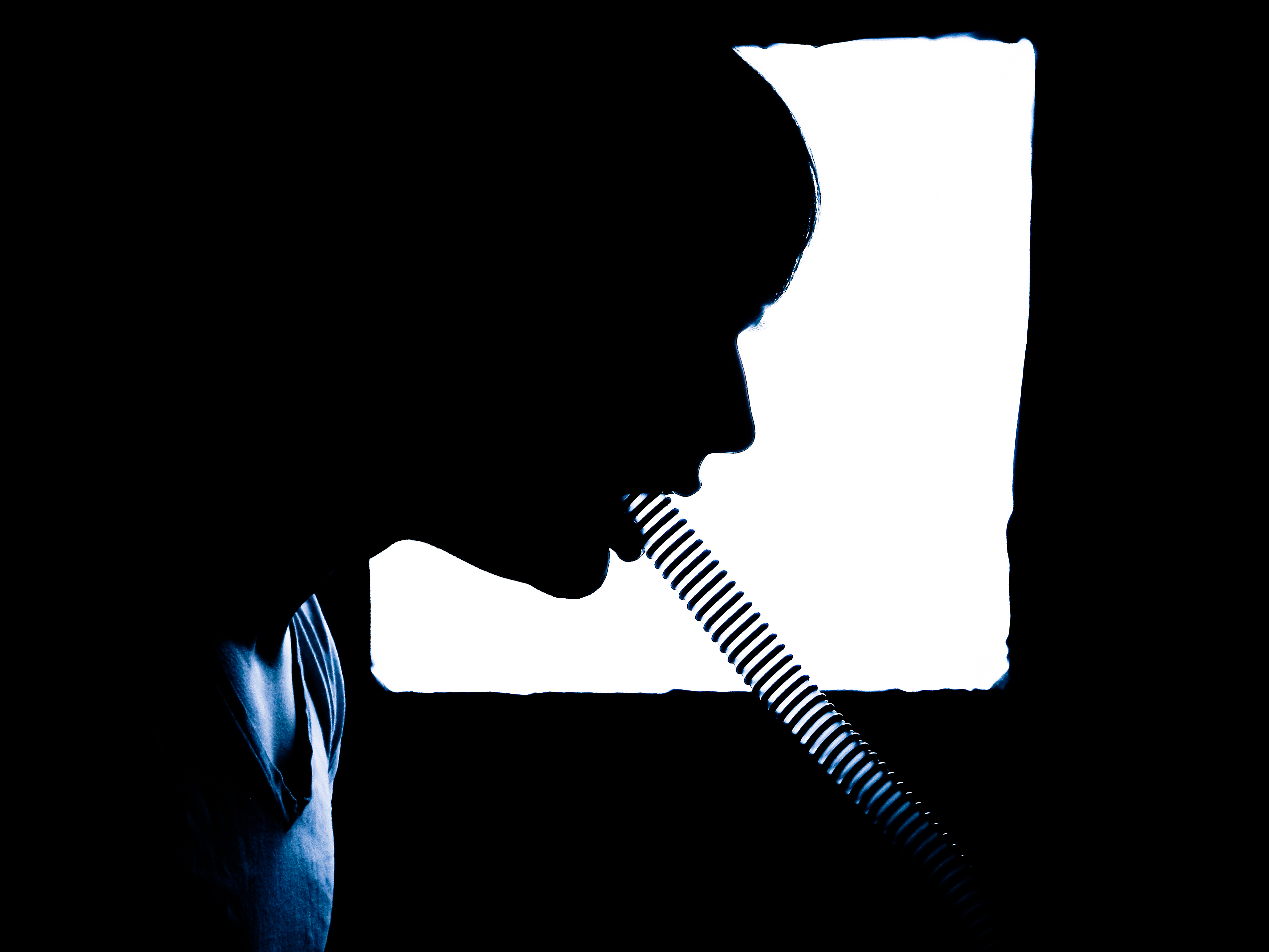 “Ever since I was diagnosed with severe obstructive sleep apnea, I couldn’t help but draw parallels between the organic texture of my CPAP machine and the biomechanics of H.R. Giger’s work, namely, his work on Ridley Scott’s Alien (1979), a frequent bedtime movie of mine. Having spent many a night unable to breathe, only to then be secured to this bizarre face apparatus, I felt the marriage of themes produced a clear outline for a conceptual scene: a portait of an exhausted victim whose nightmare takes the form of smothering, strangulation, and the bodily invasion of some alien entity.”