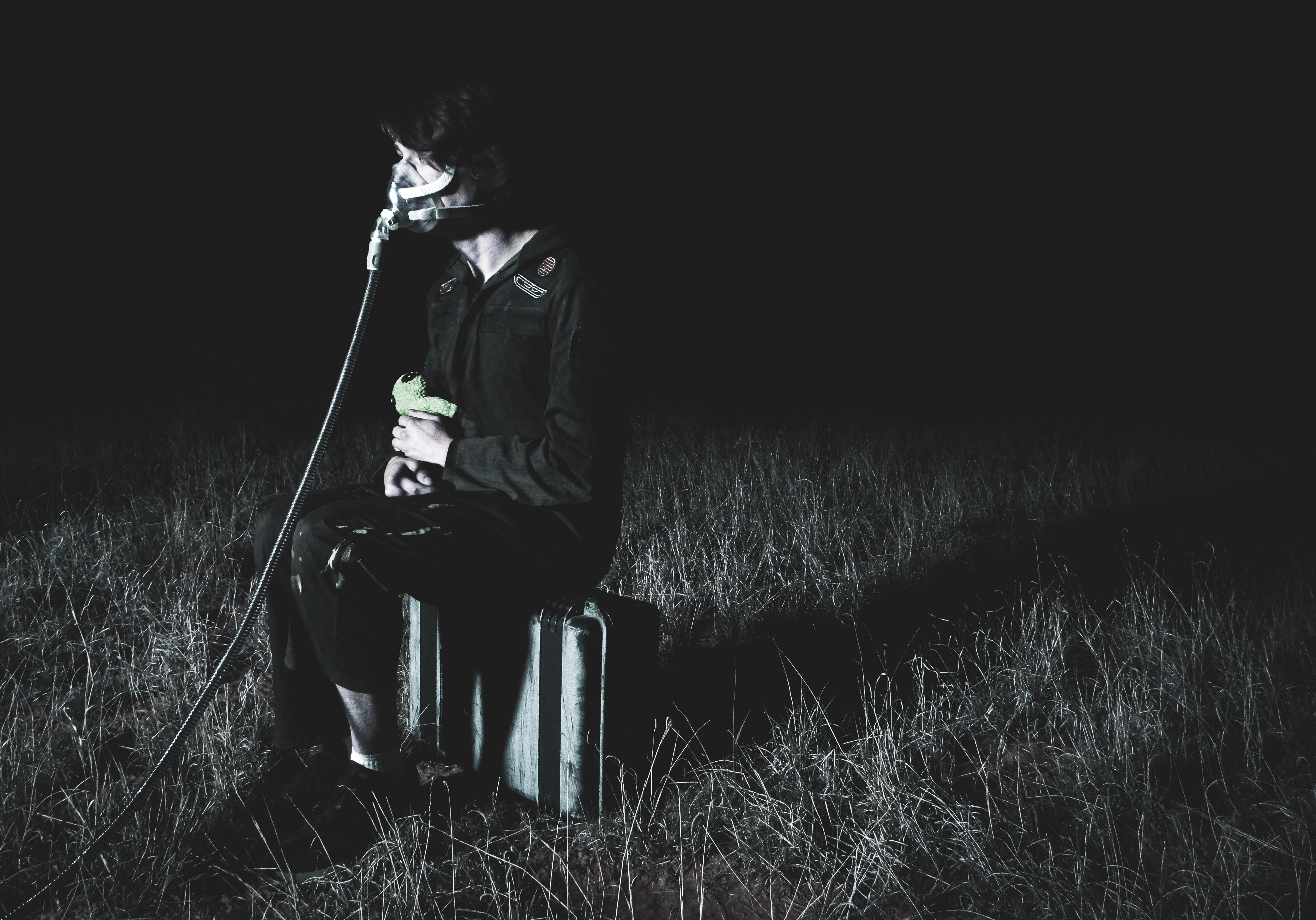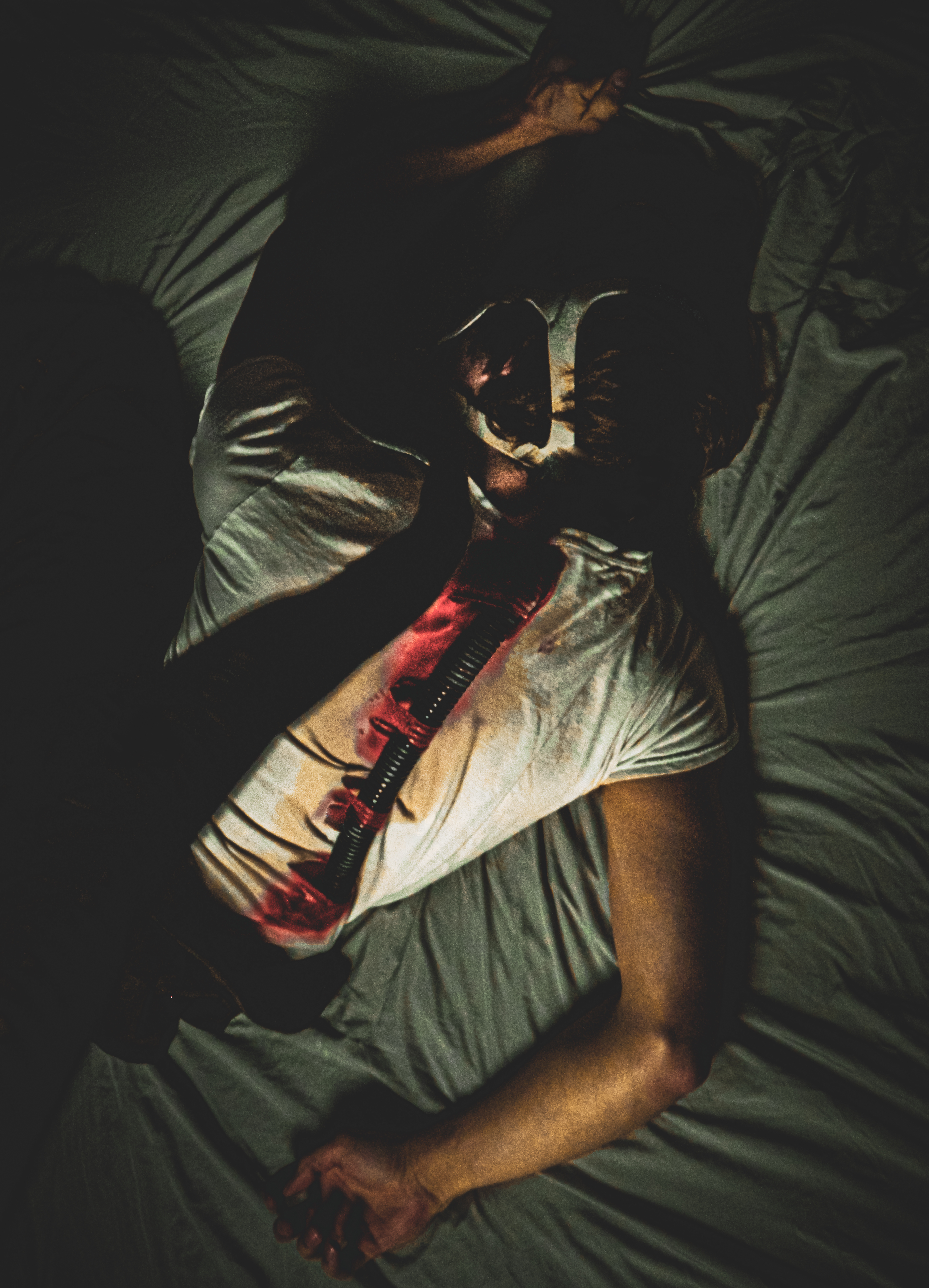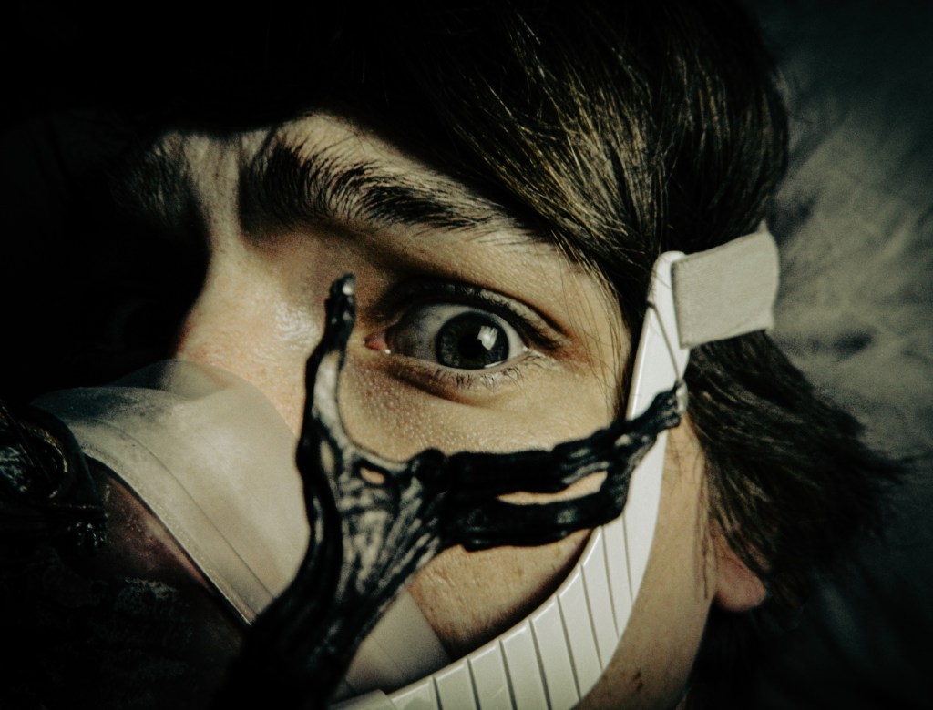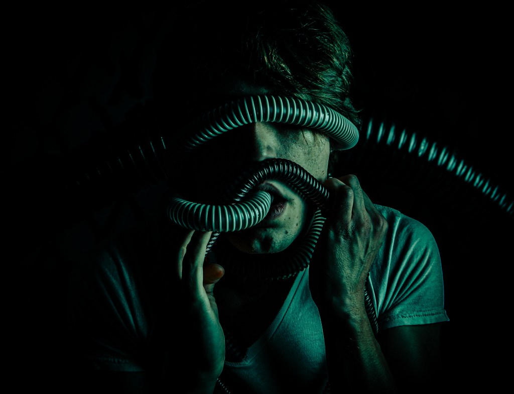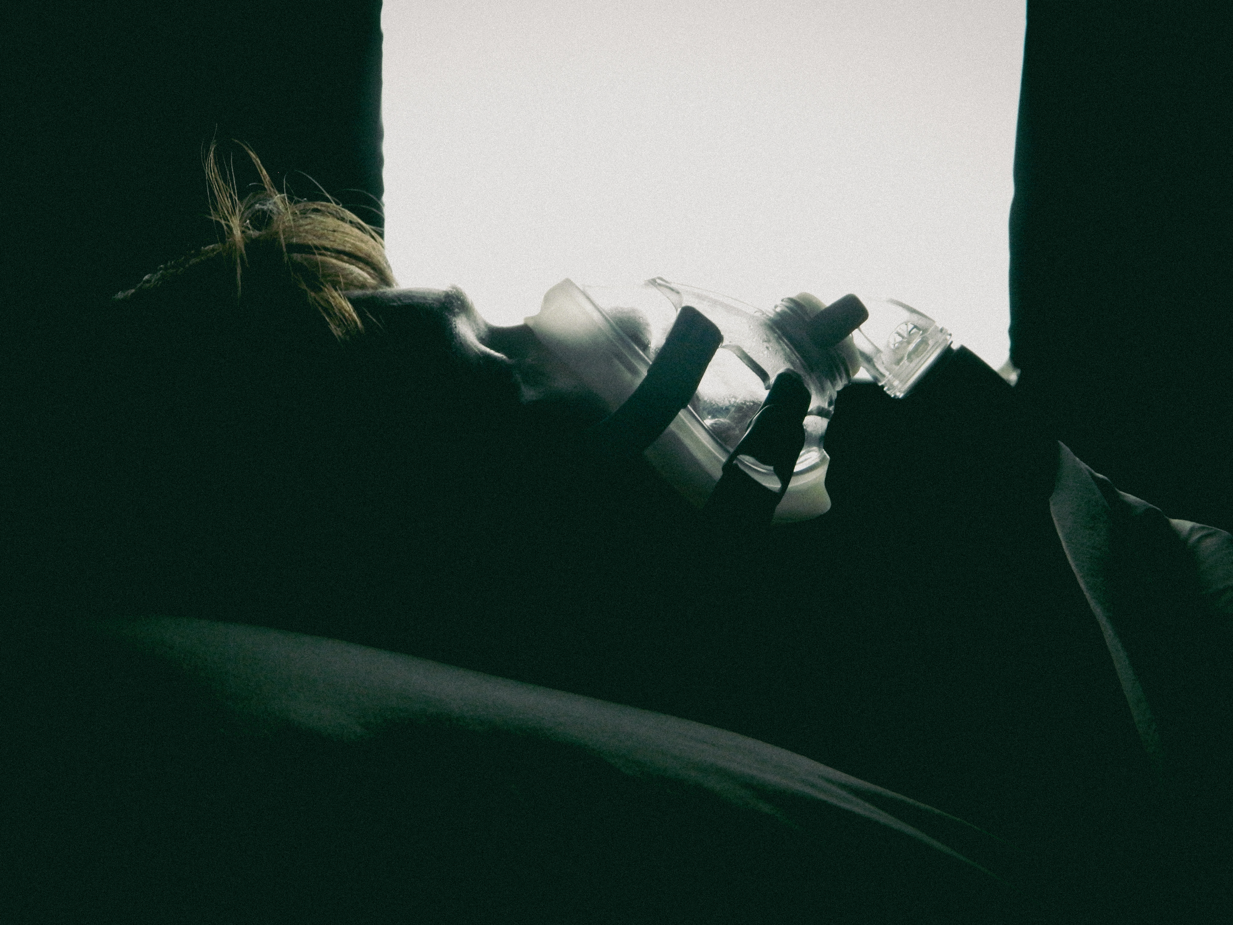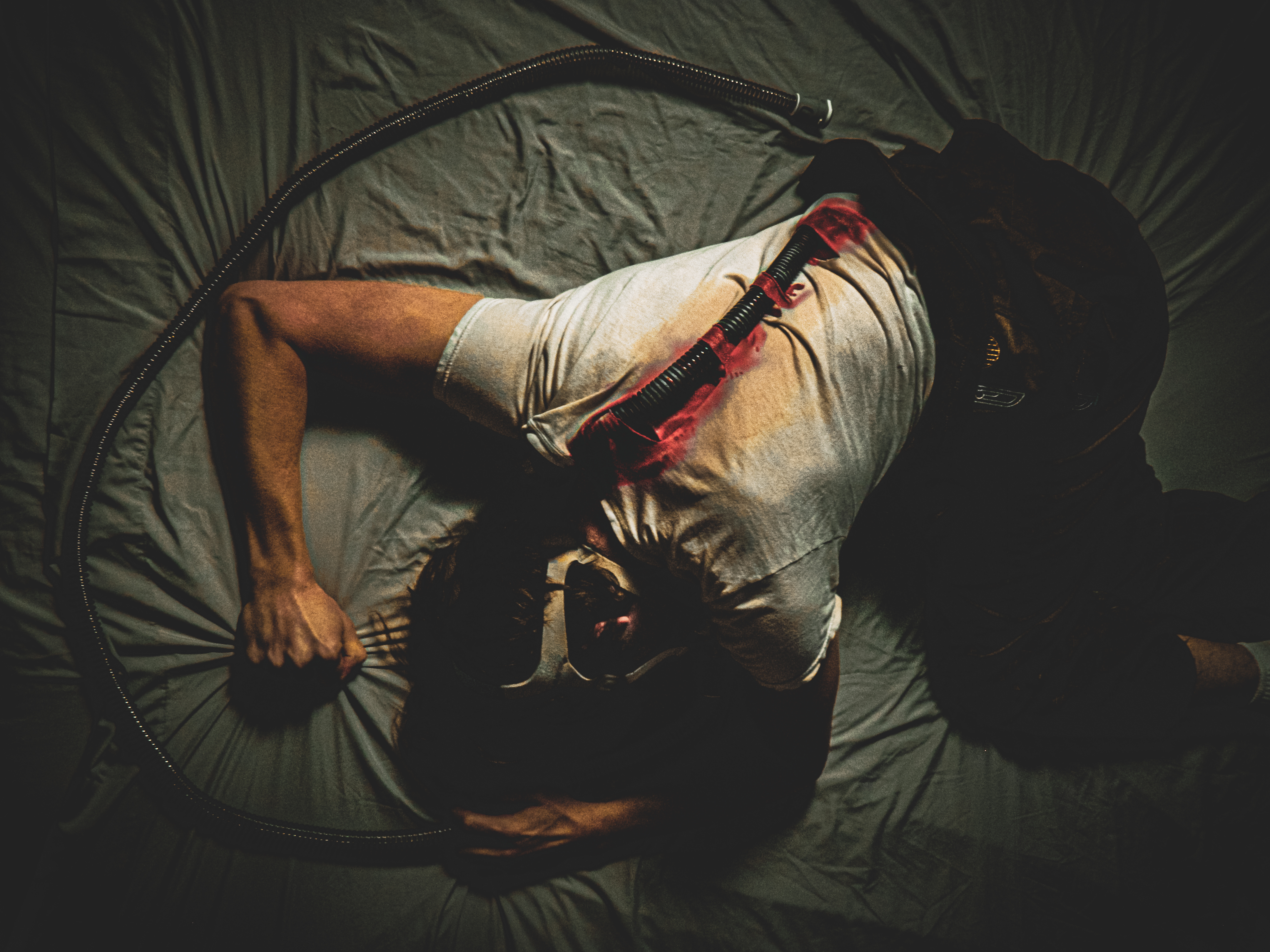 “Ever since I was diagnosed with severe obstructive sleep apnea, I couldn’t help but draw parallels between the organic texture of my CPAP machine and the biomechanics of H.R. Giger’s work, namely, his work on Ridley Scott’s Alien (1979), a frequent bedtime movie of mine. Having spent many a night unable to breathe, only to then be secured to this bizarre face apparatus, I felt the marriage of themes produced a clear outline for a conceptual scene: a portait of an exhausted victim whose nightmare takes the form of smothering, strangulation, and the bodily invasion of some alien entity.”