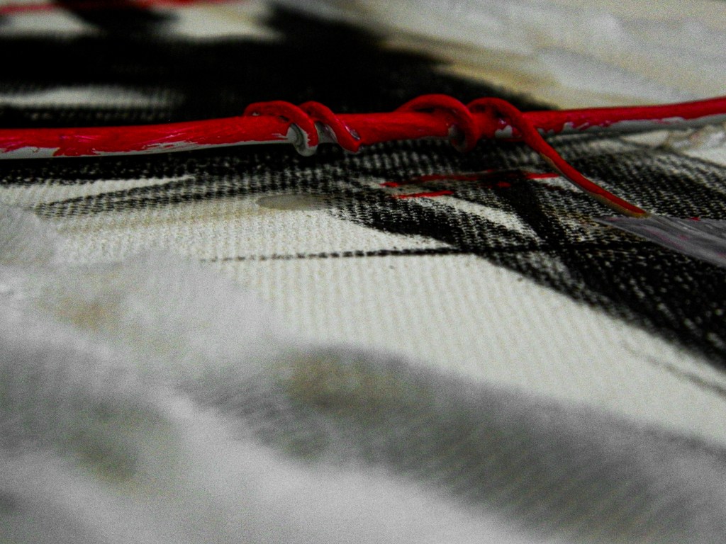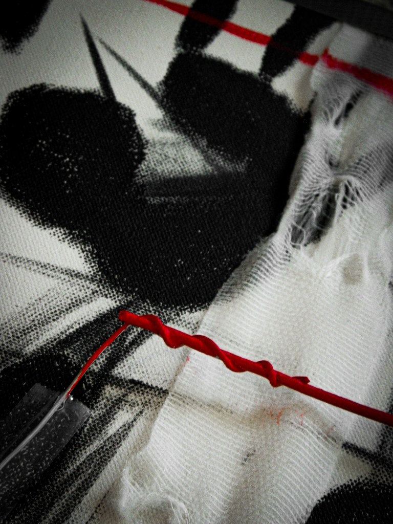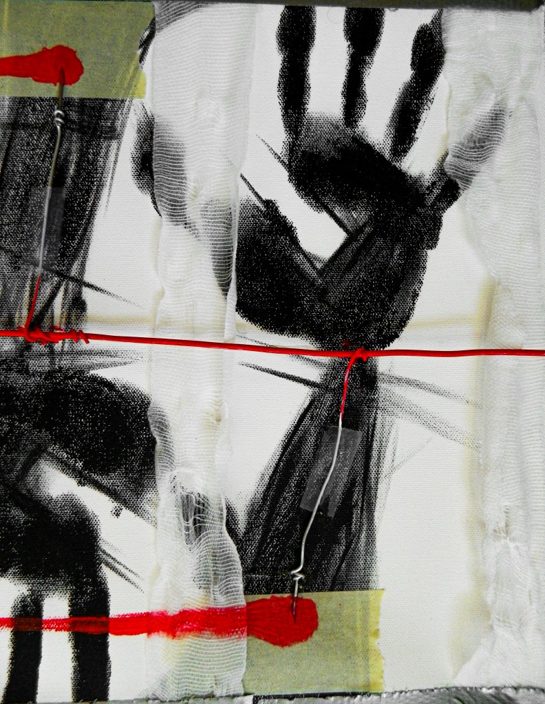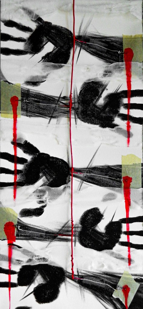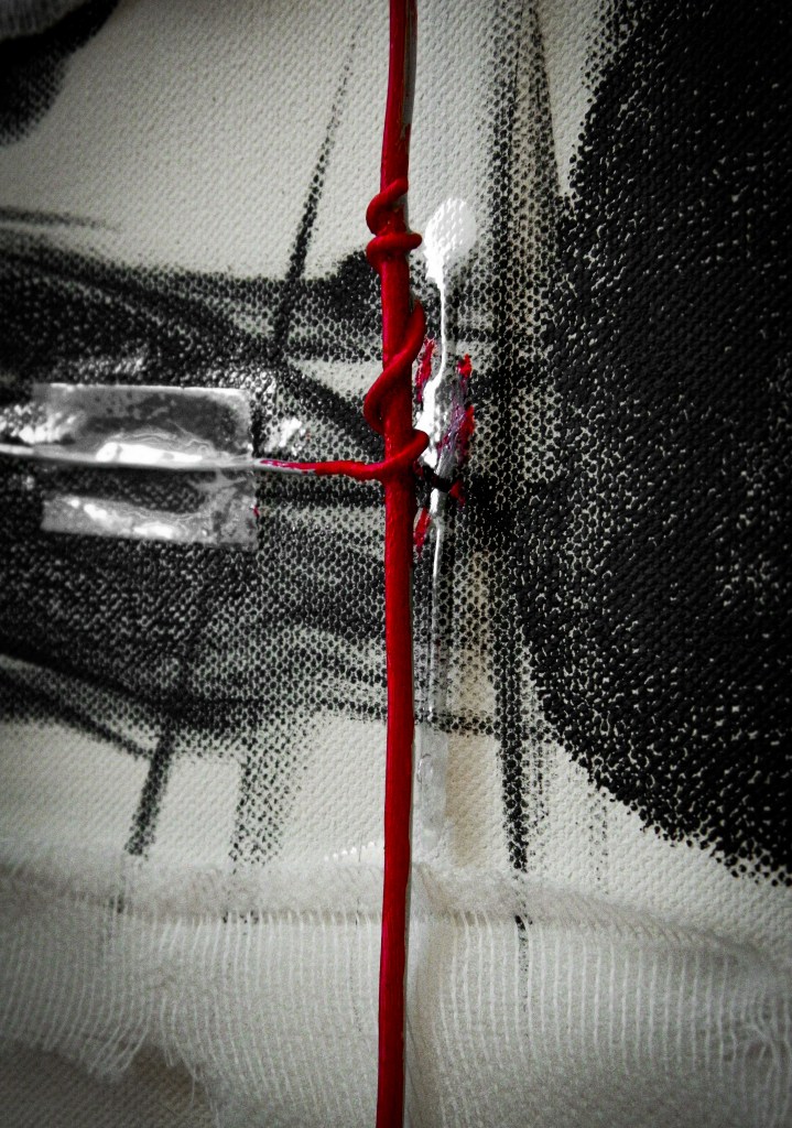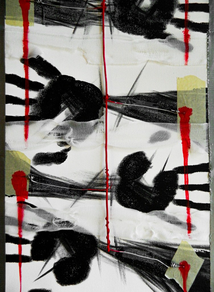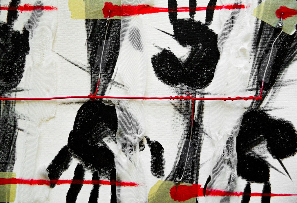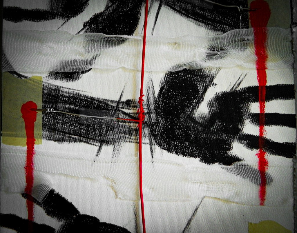 15 x 30 in.Acrylic, masking tape, gauze, nails, and aluminum form wire on canvas.