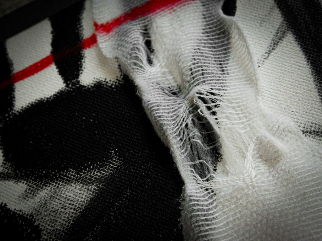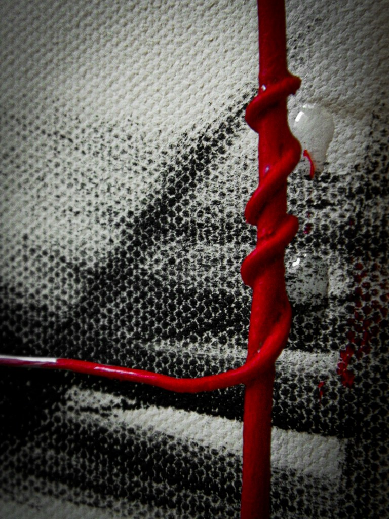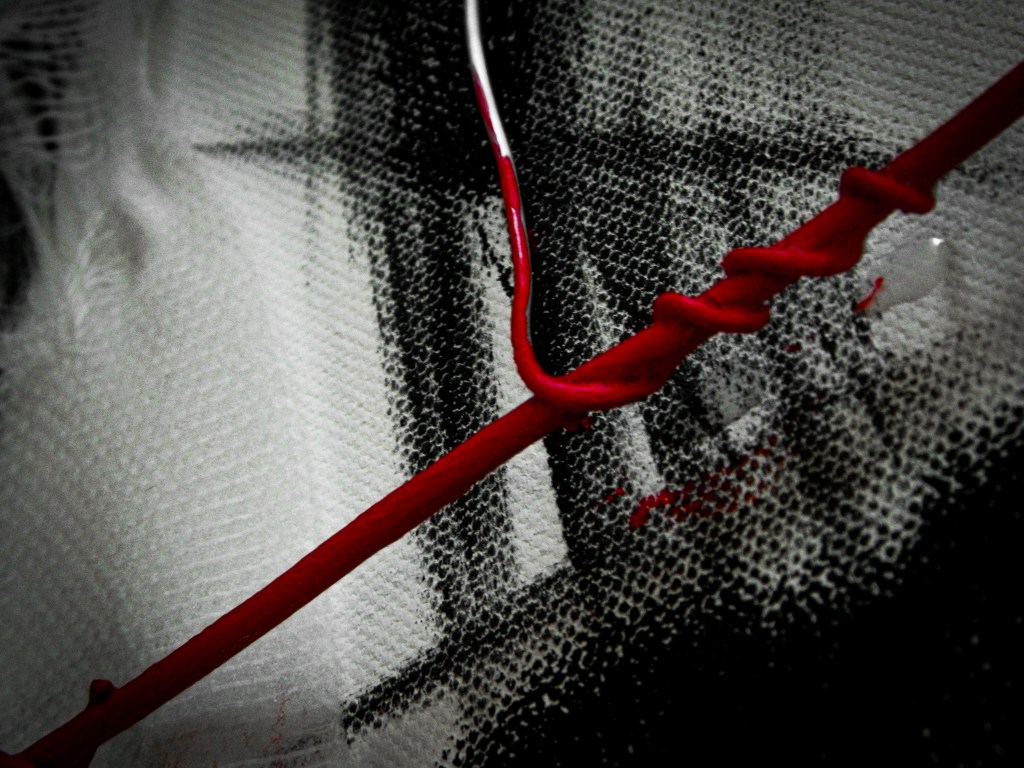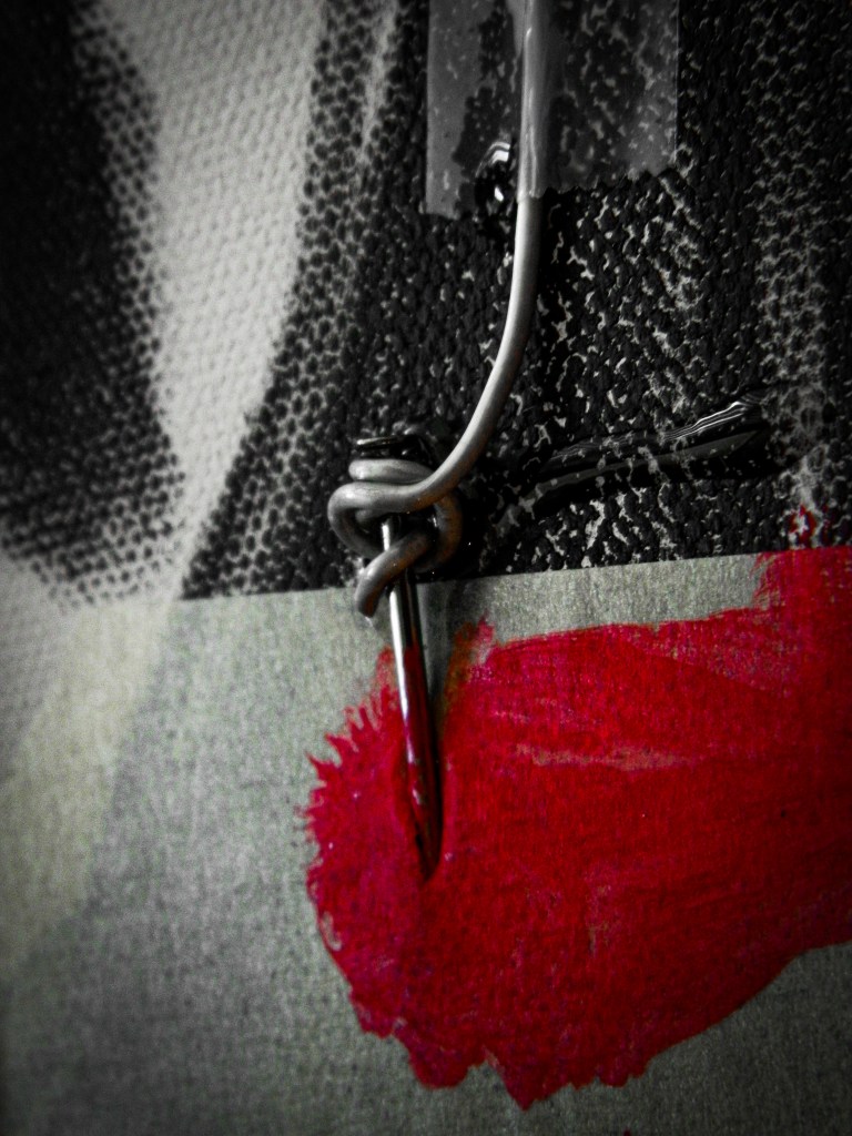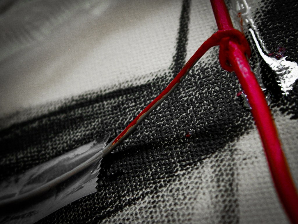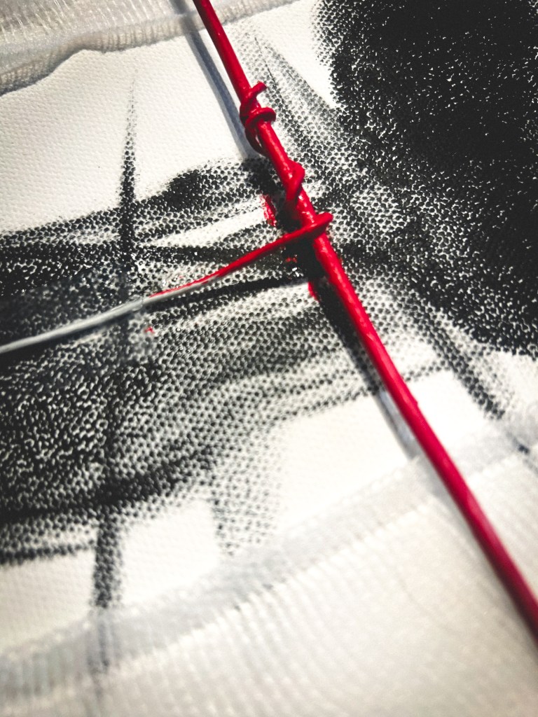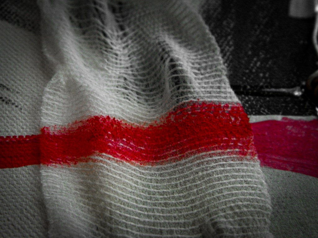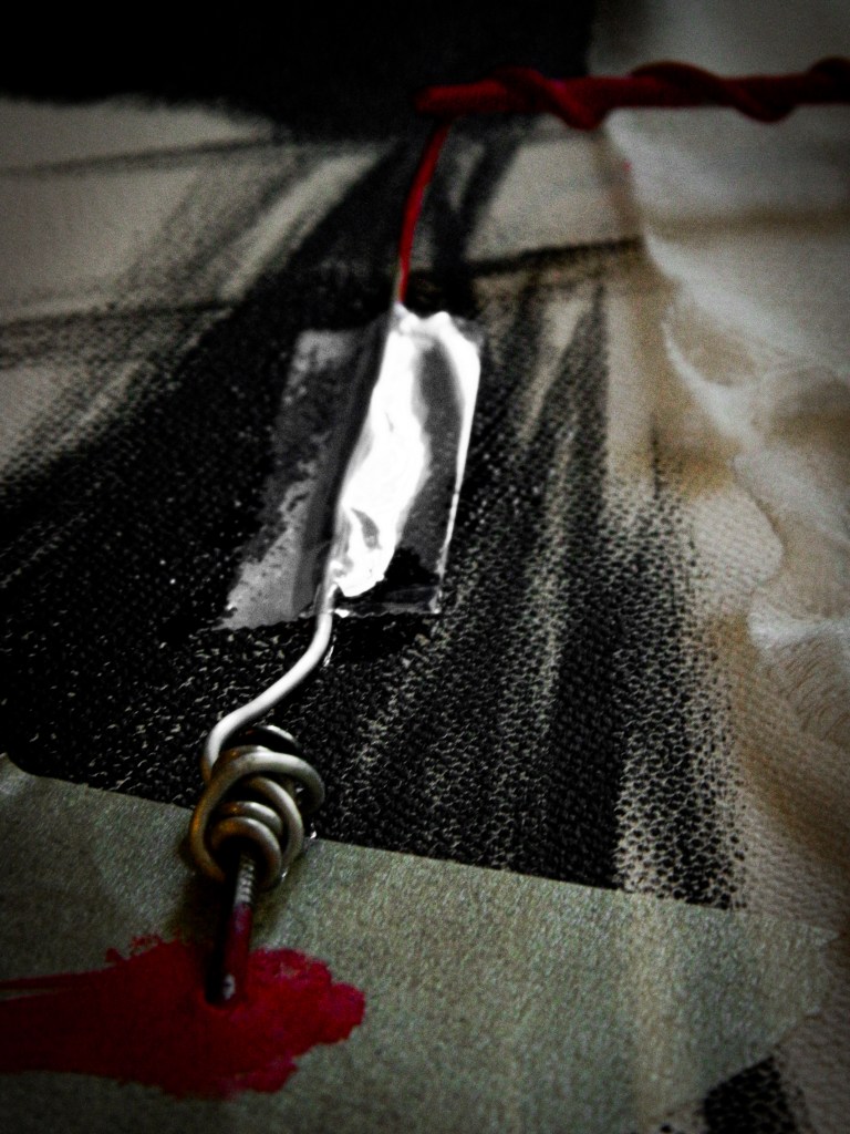 15 x 30 in.Acrylic, masking tape, gauze, nails, and aluminum form wire on canvas.