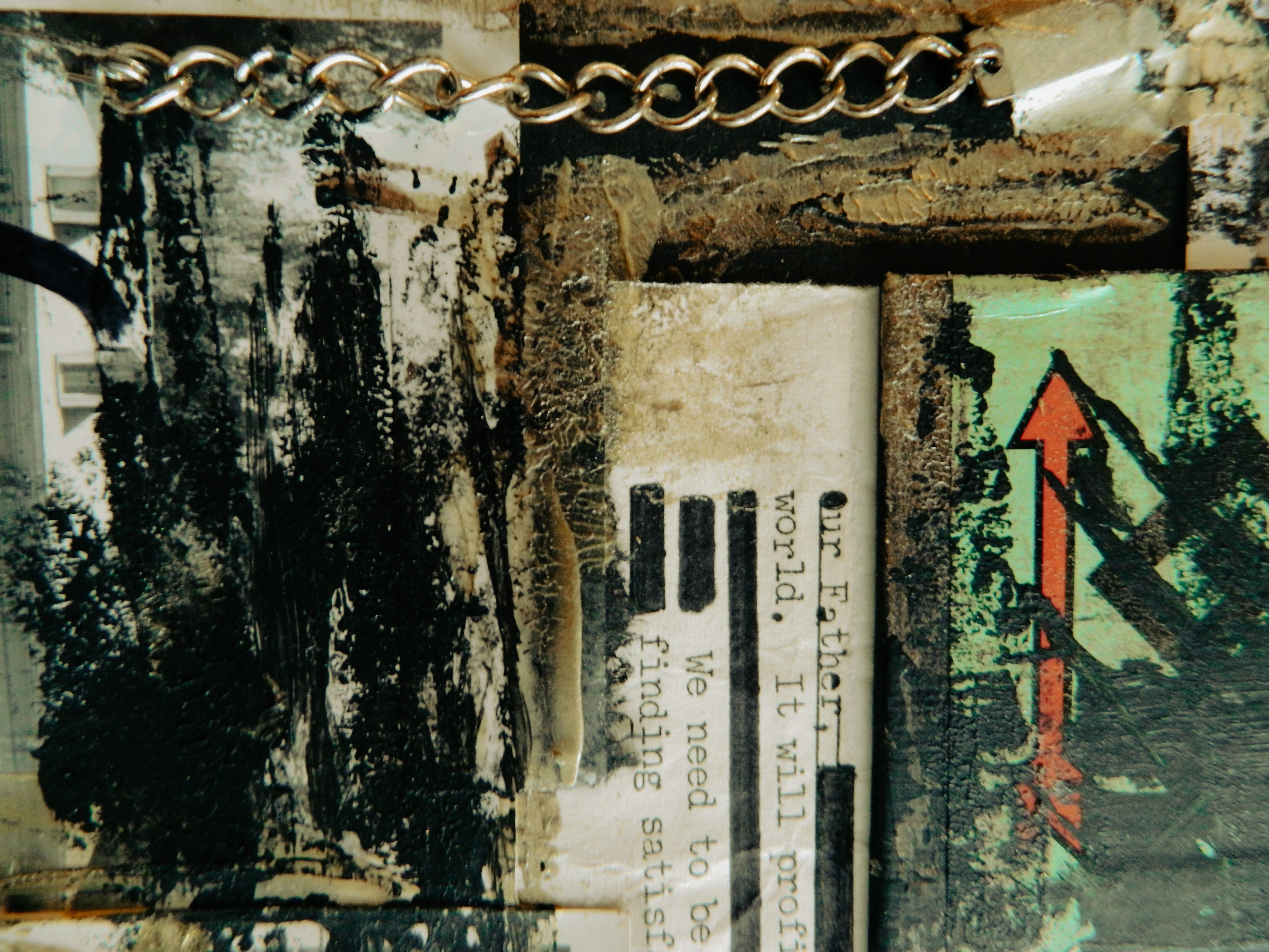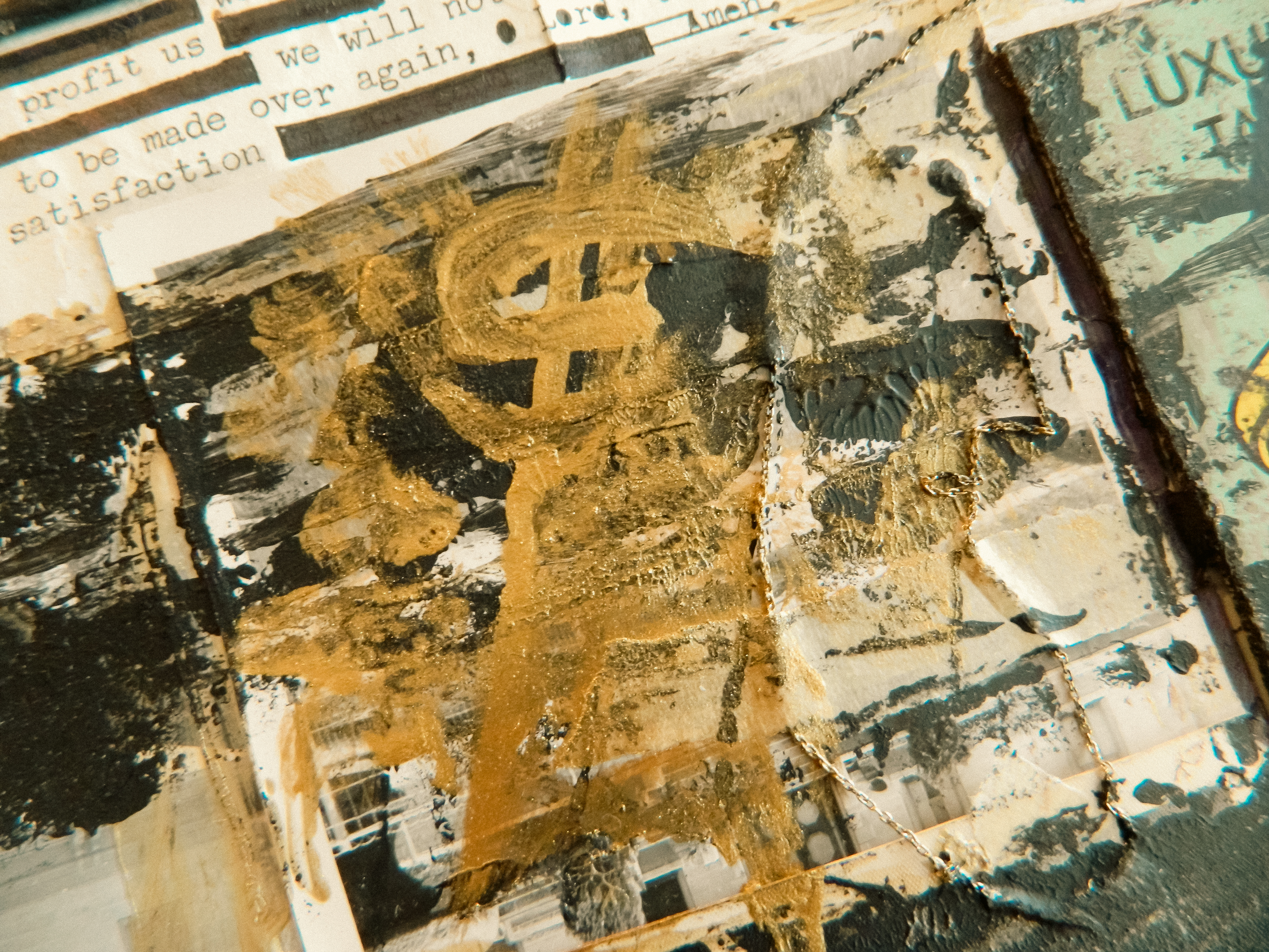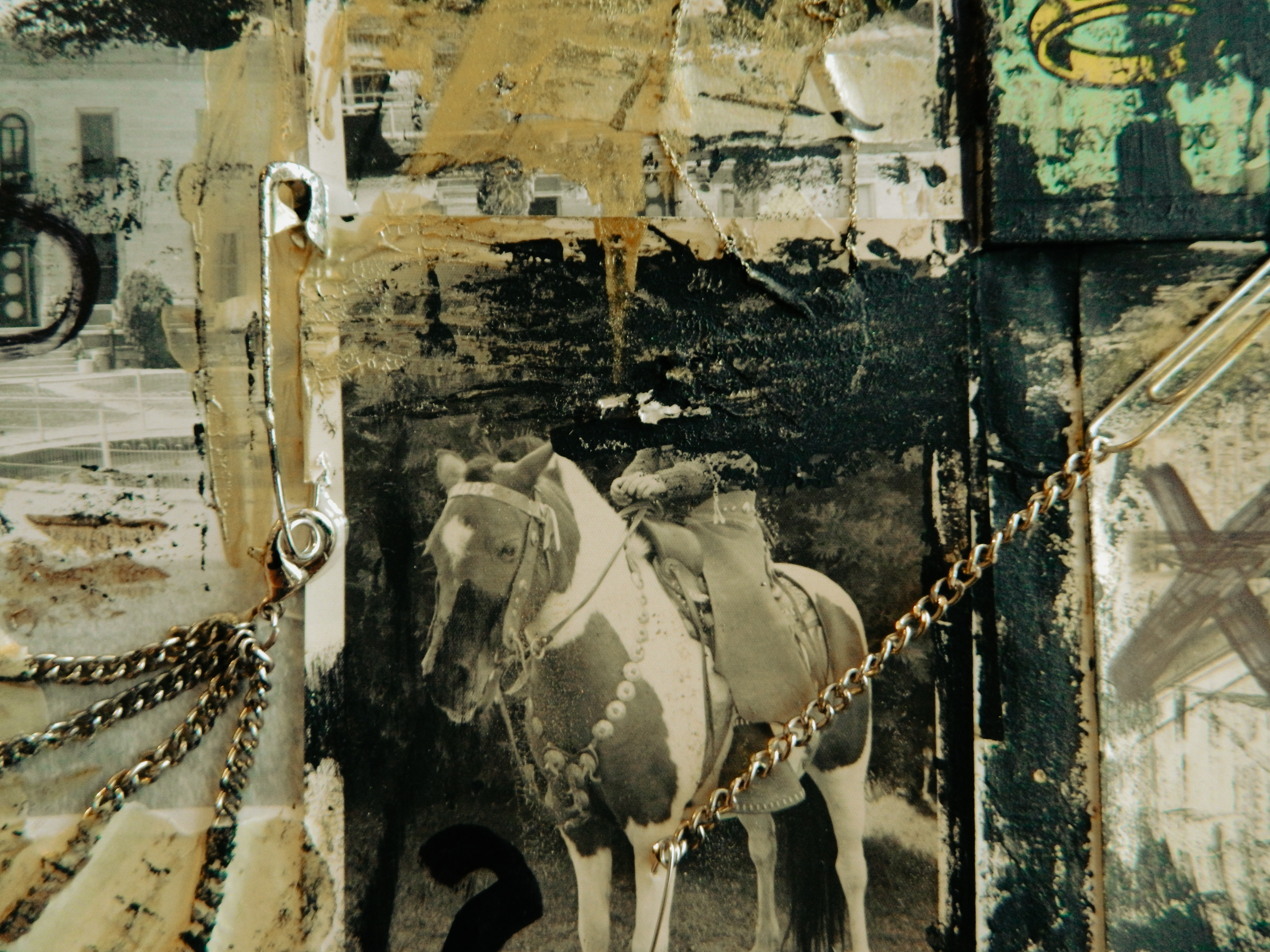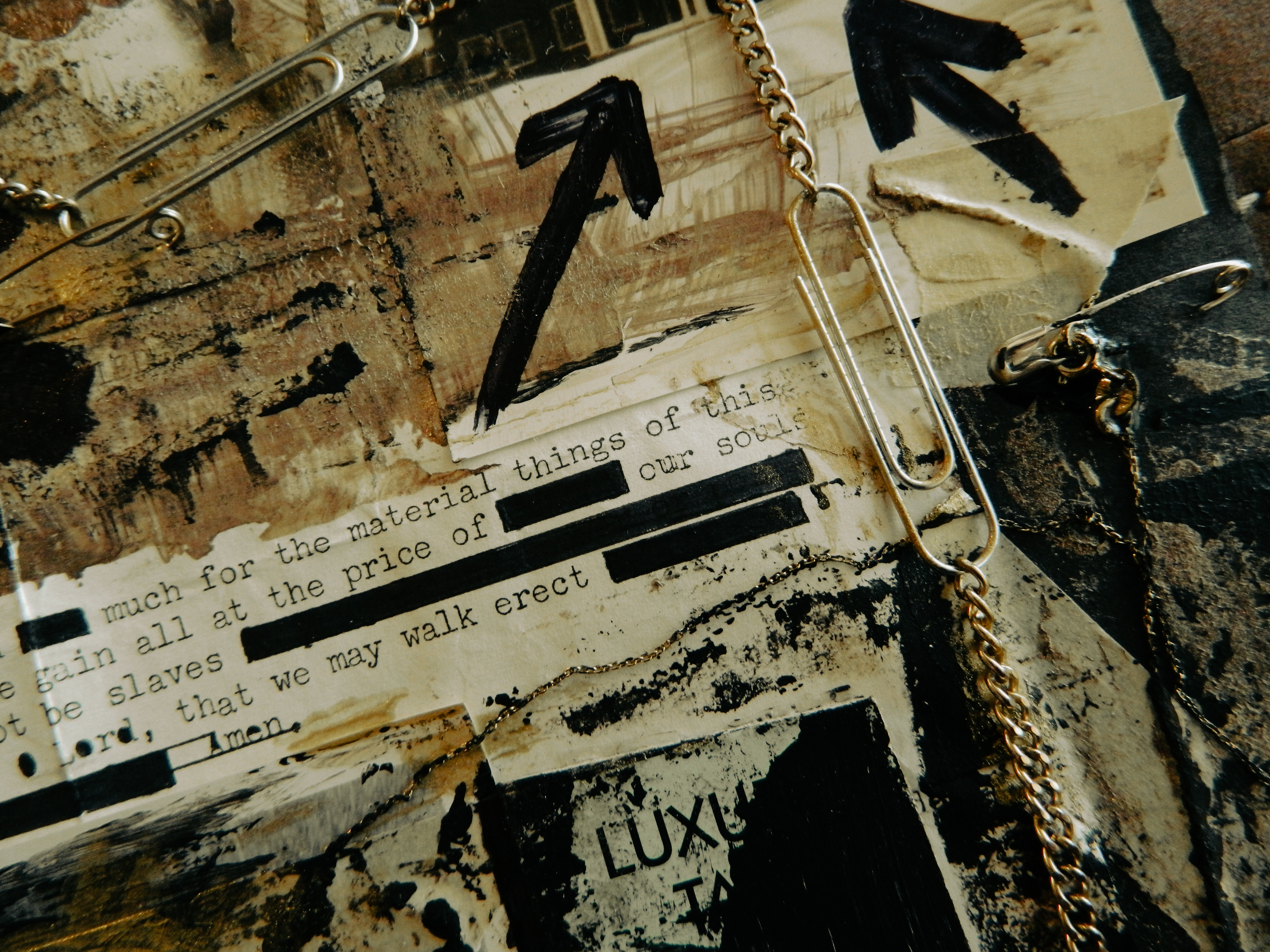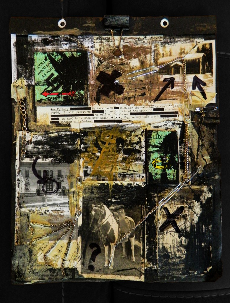 Acrylic, ink, duct tape, office supplies, antique documents/photographs, boardgame tiles, and jewelry on paper/cardboard.