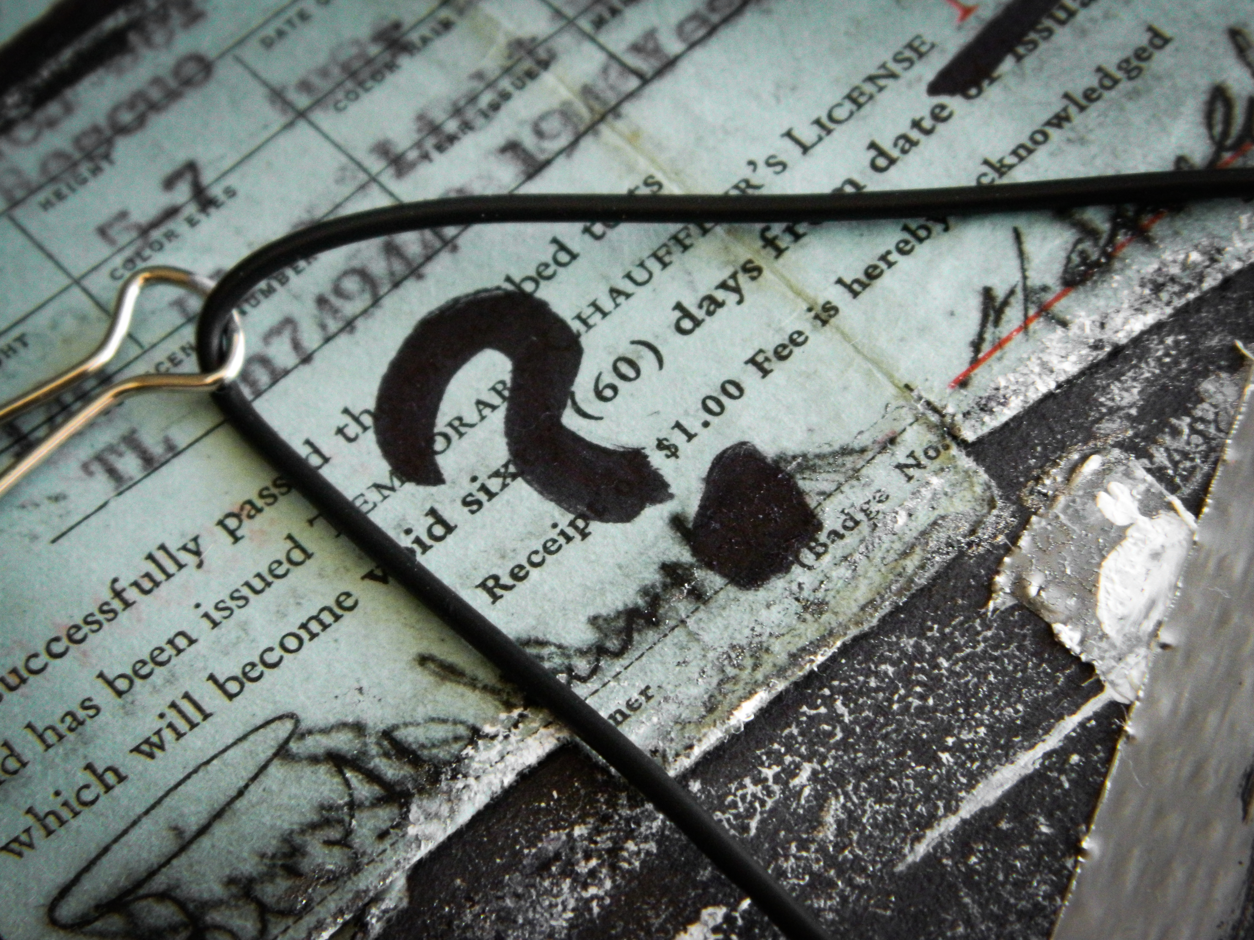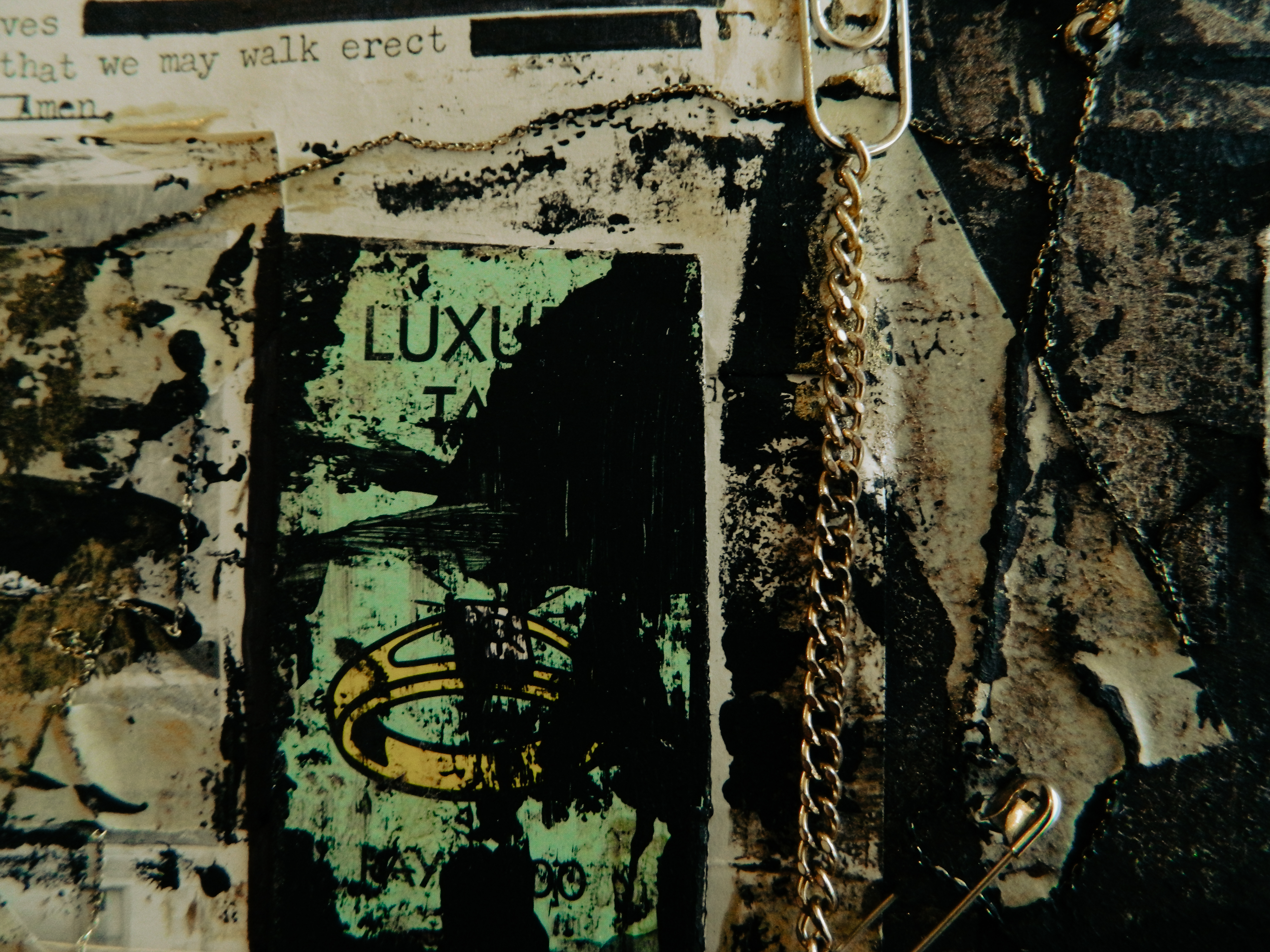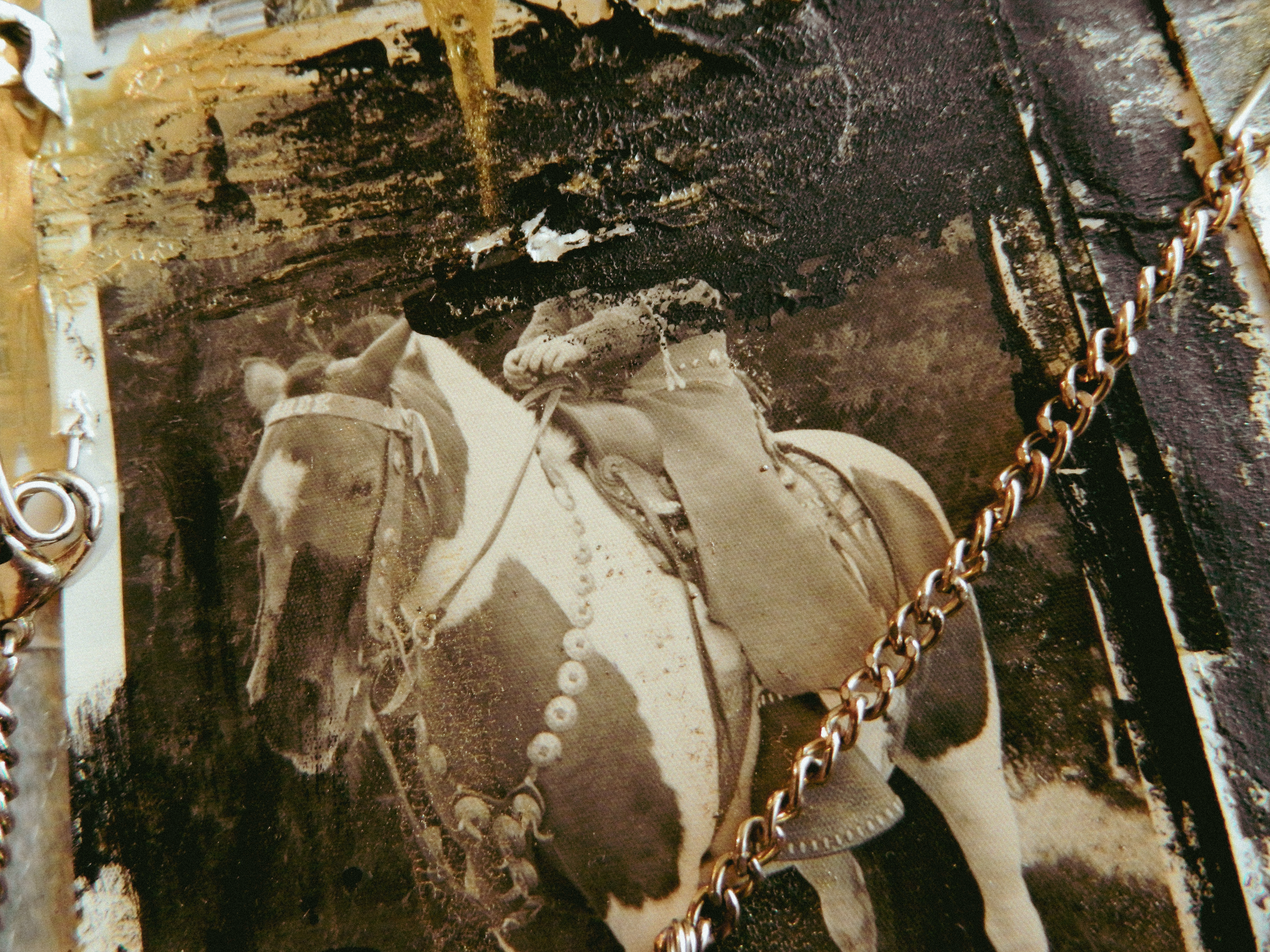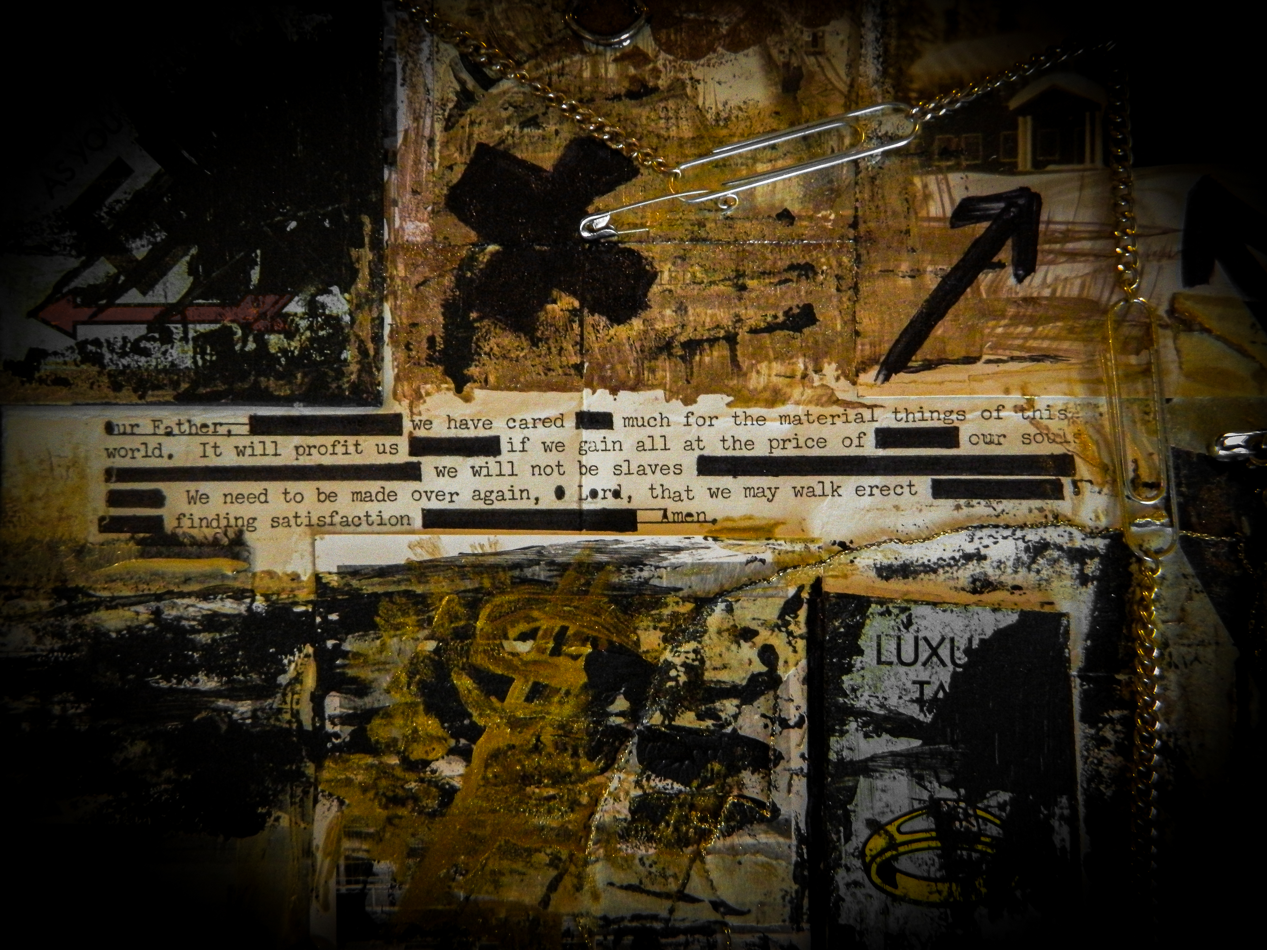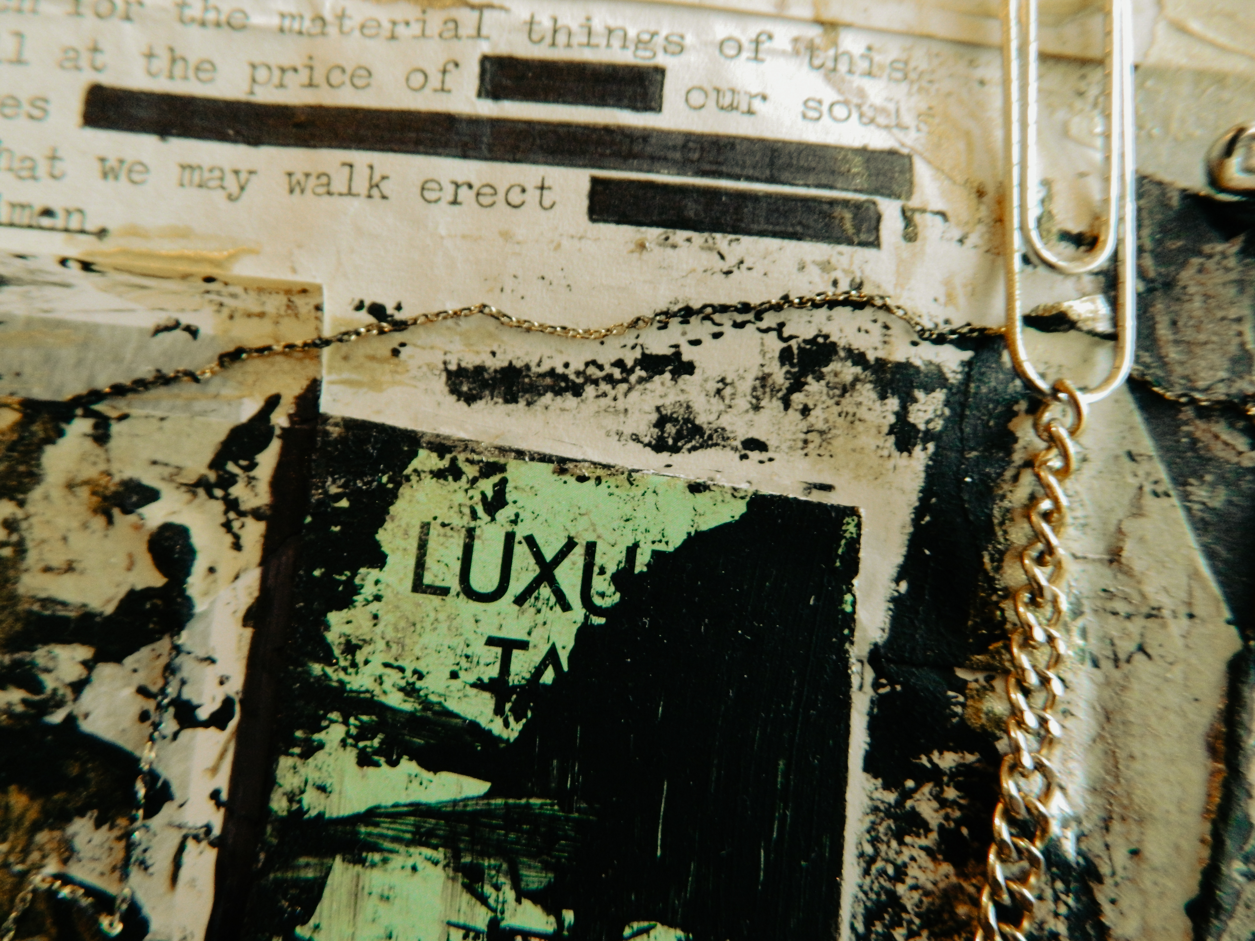 Acrylic, ink, duct tape, office supplies, antique documents/photographs, boardgame tiles, and jewelry on paper/cardboard.