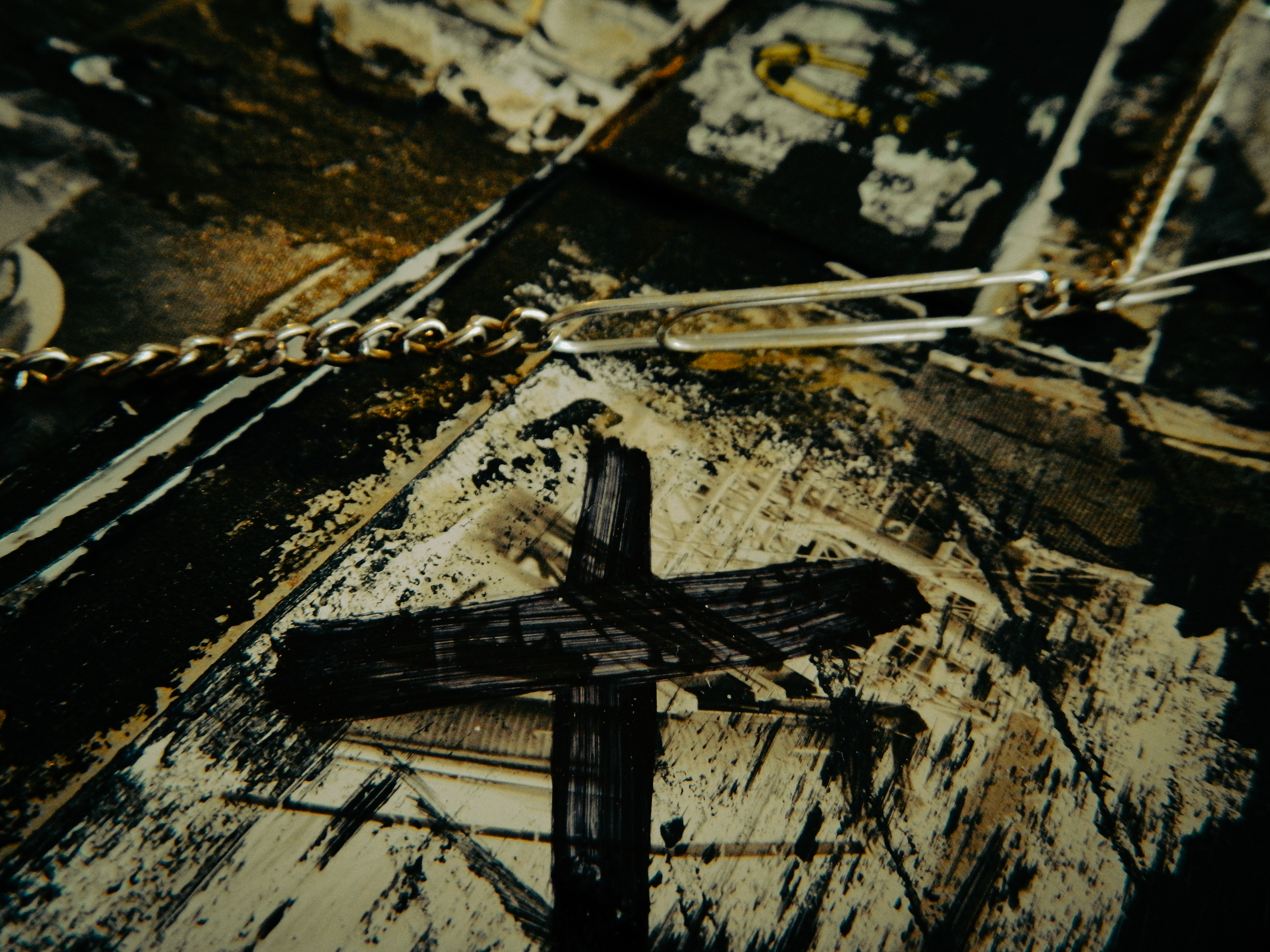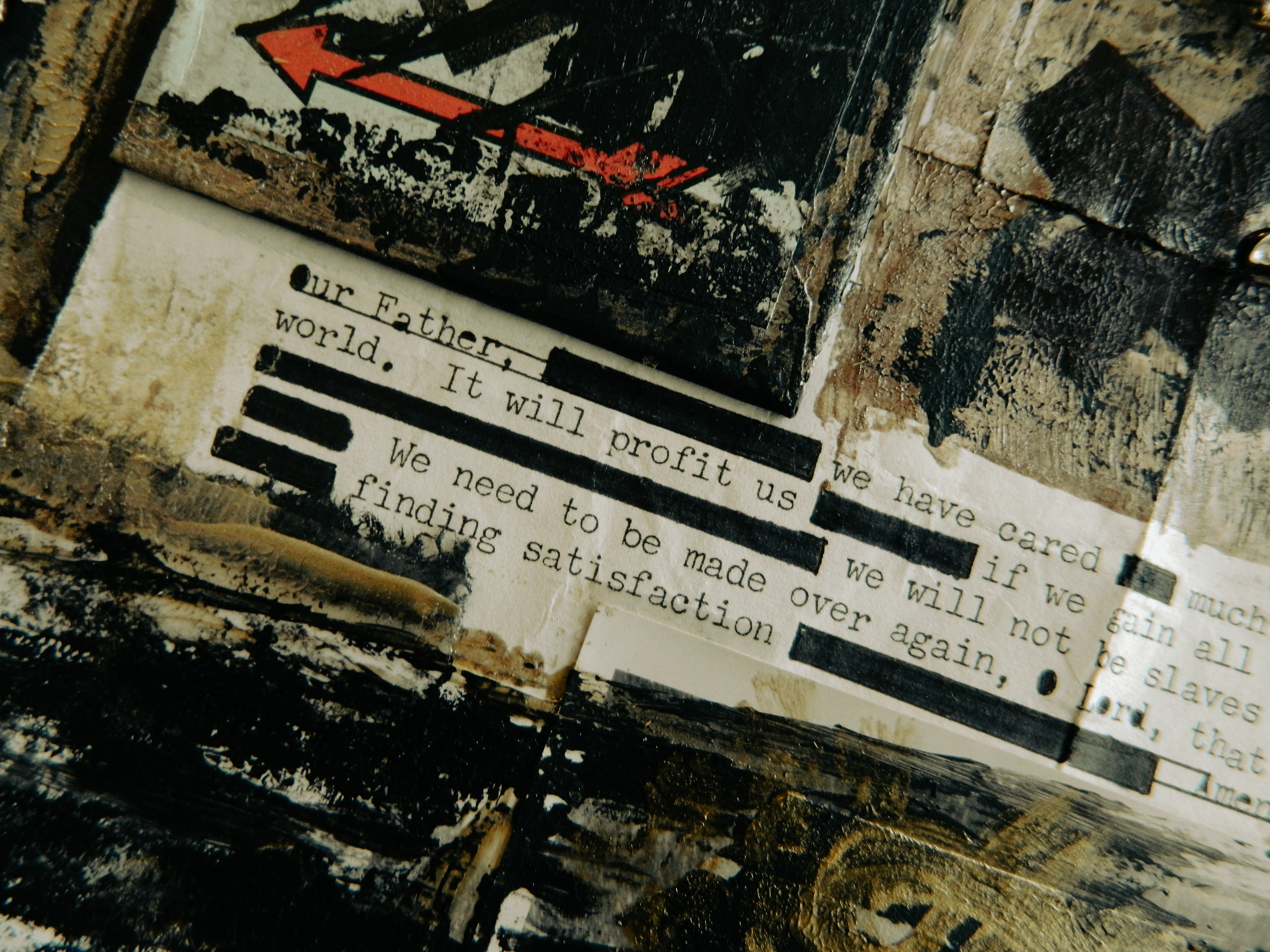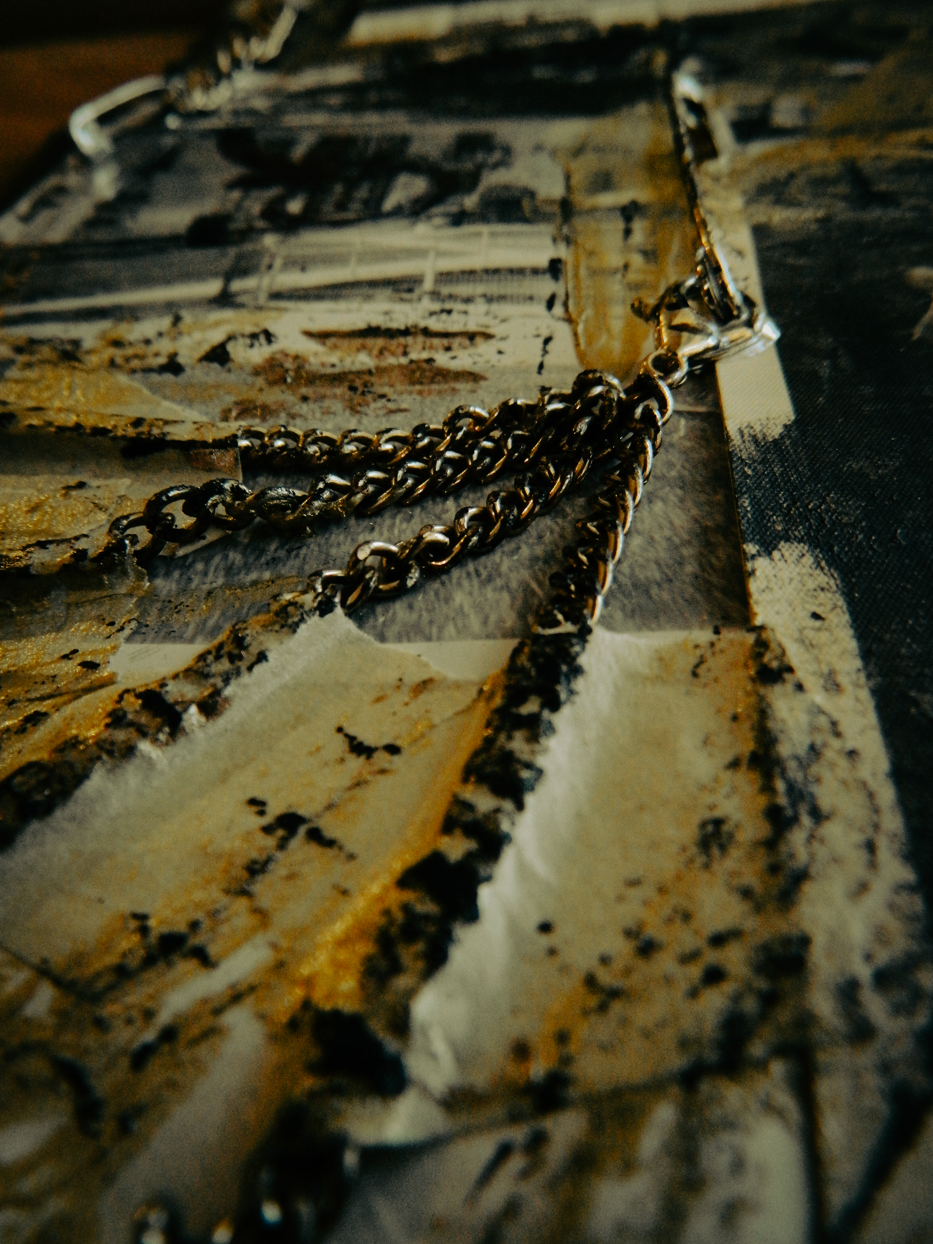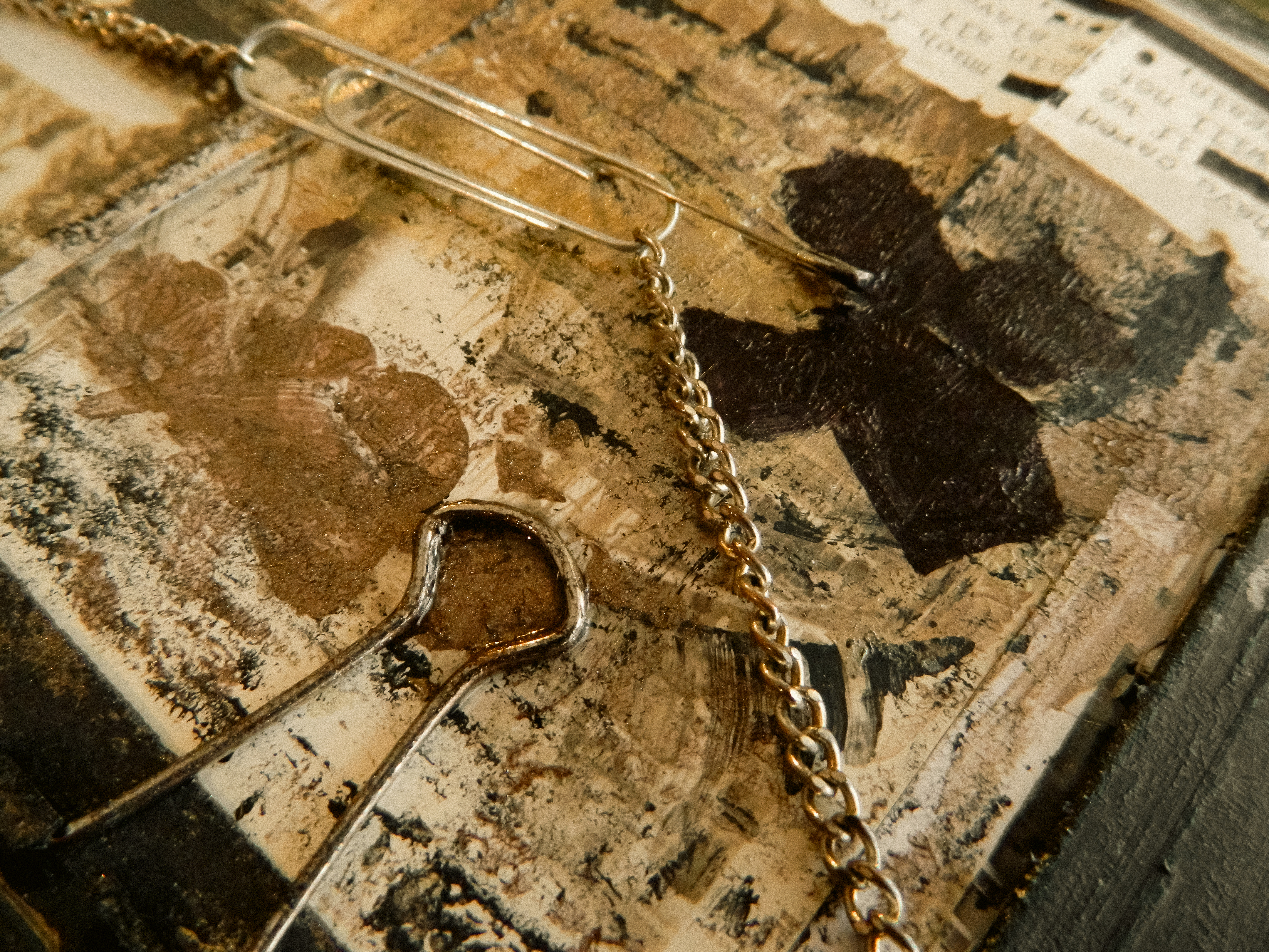 Acrylic, ink, duct tape, office supplies, antique documents/photographs, boardgame tiles, and jewelry on paper/cardboard.