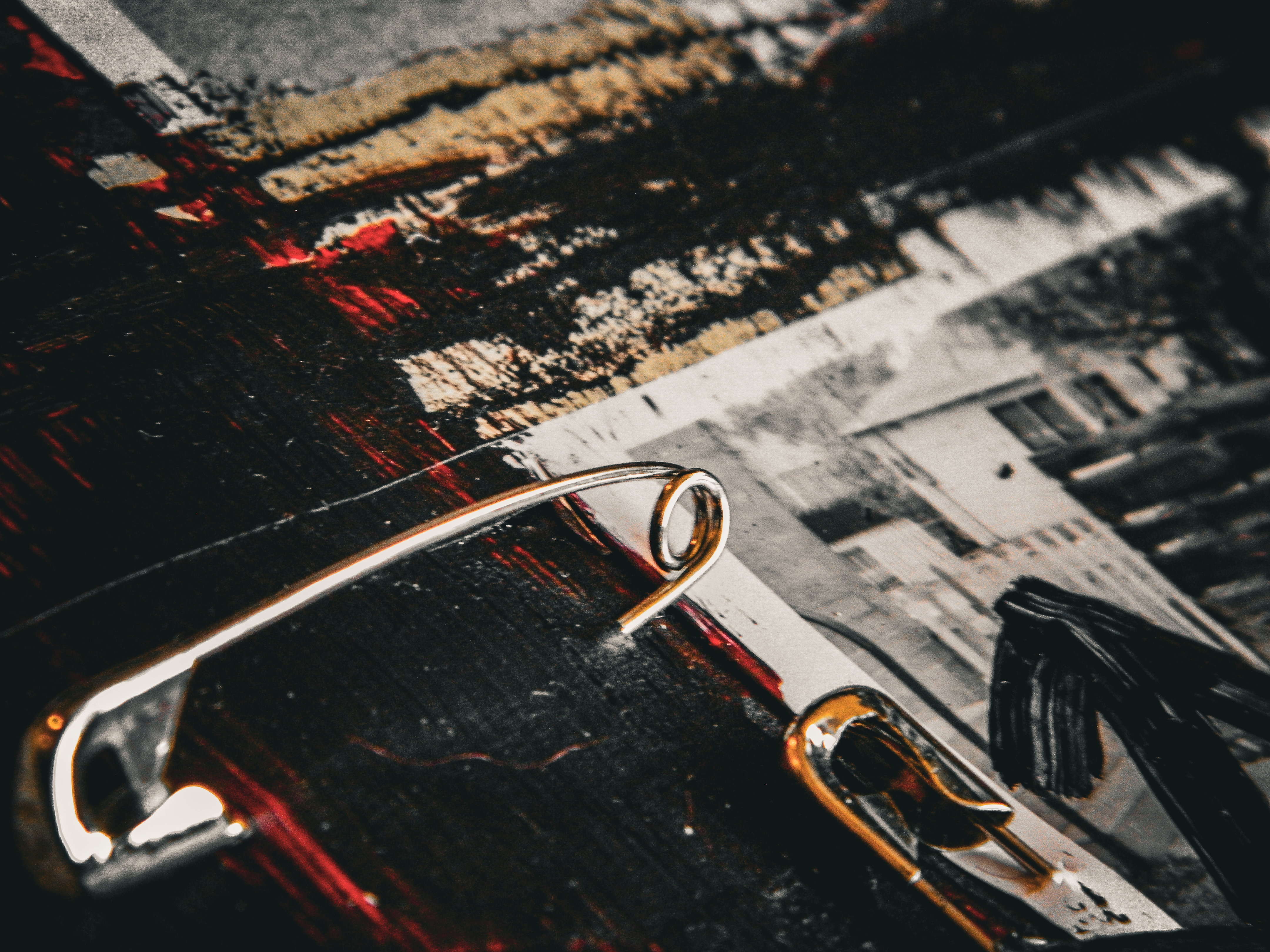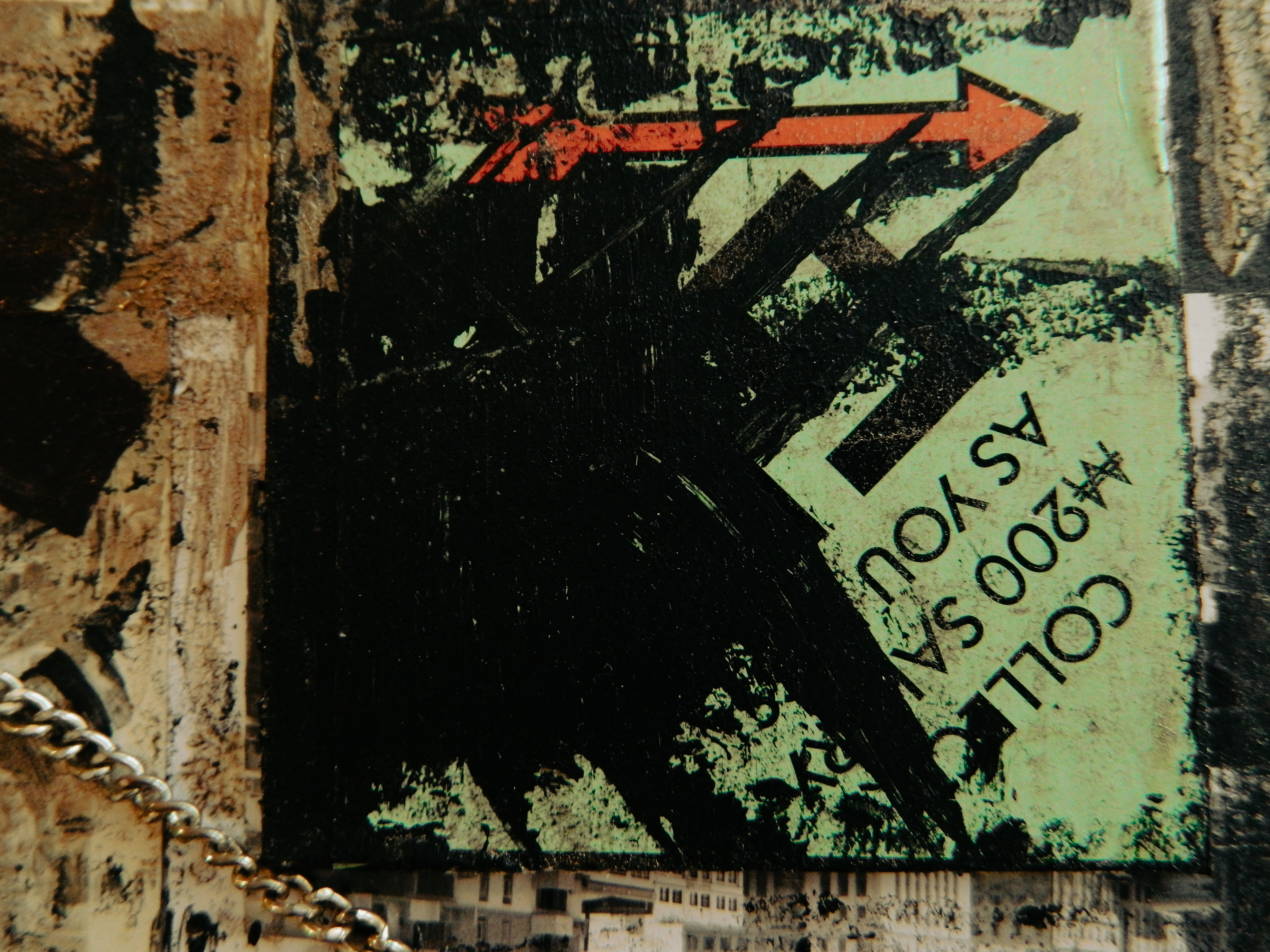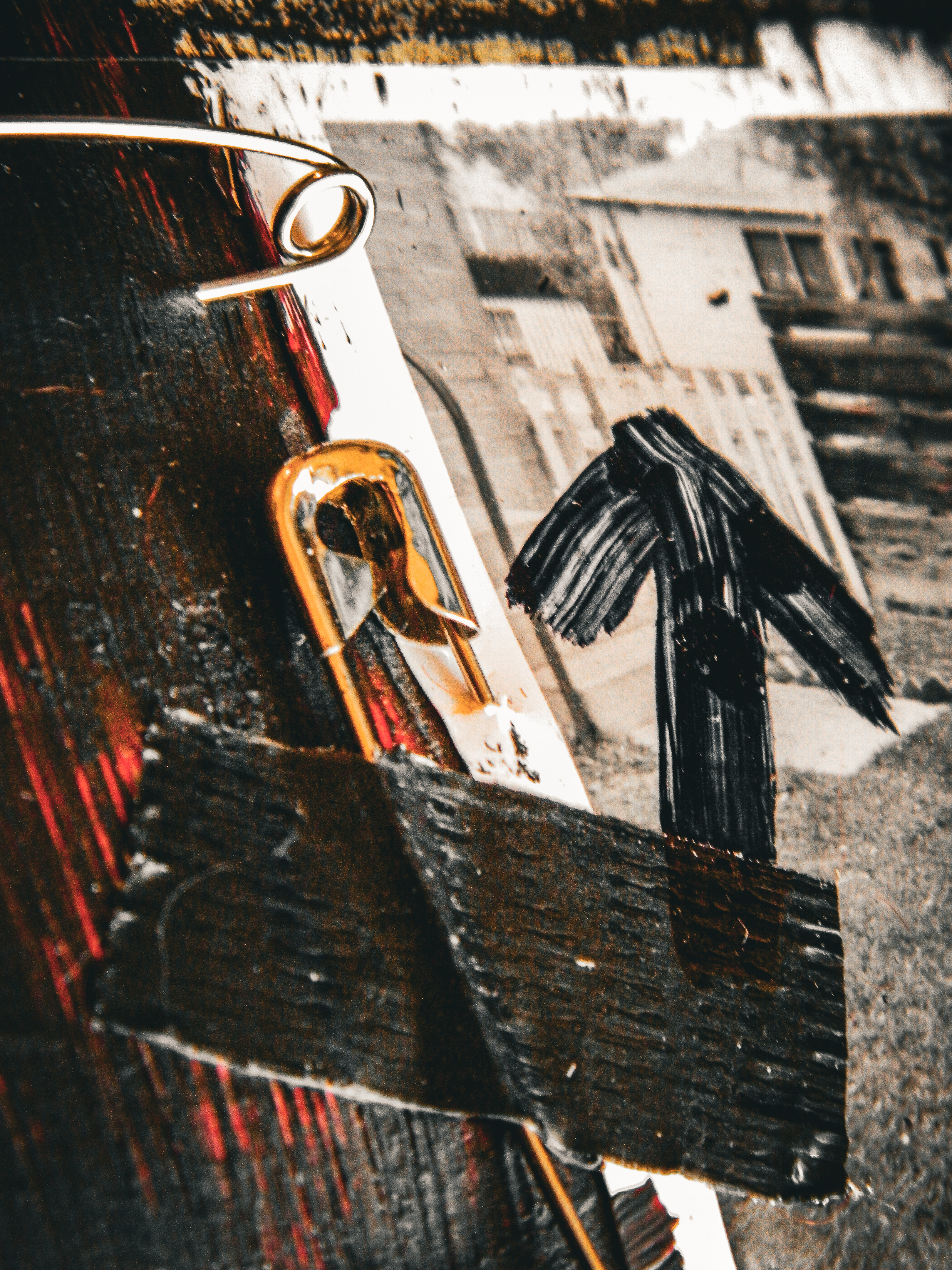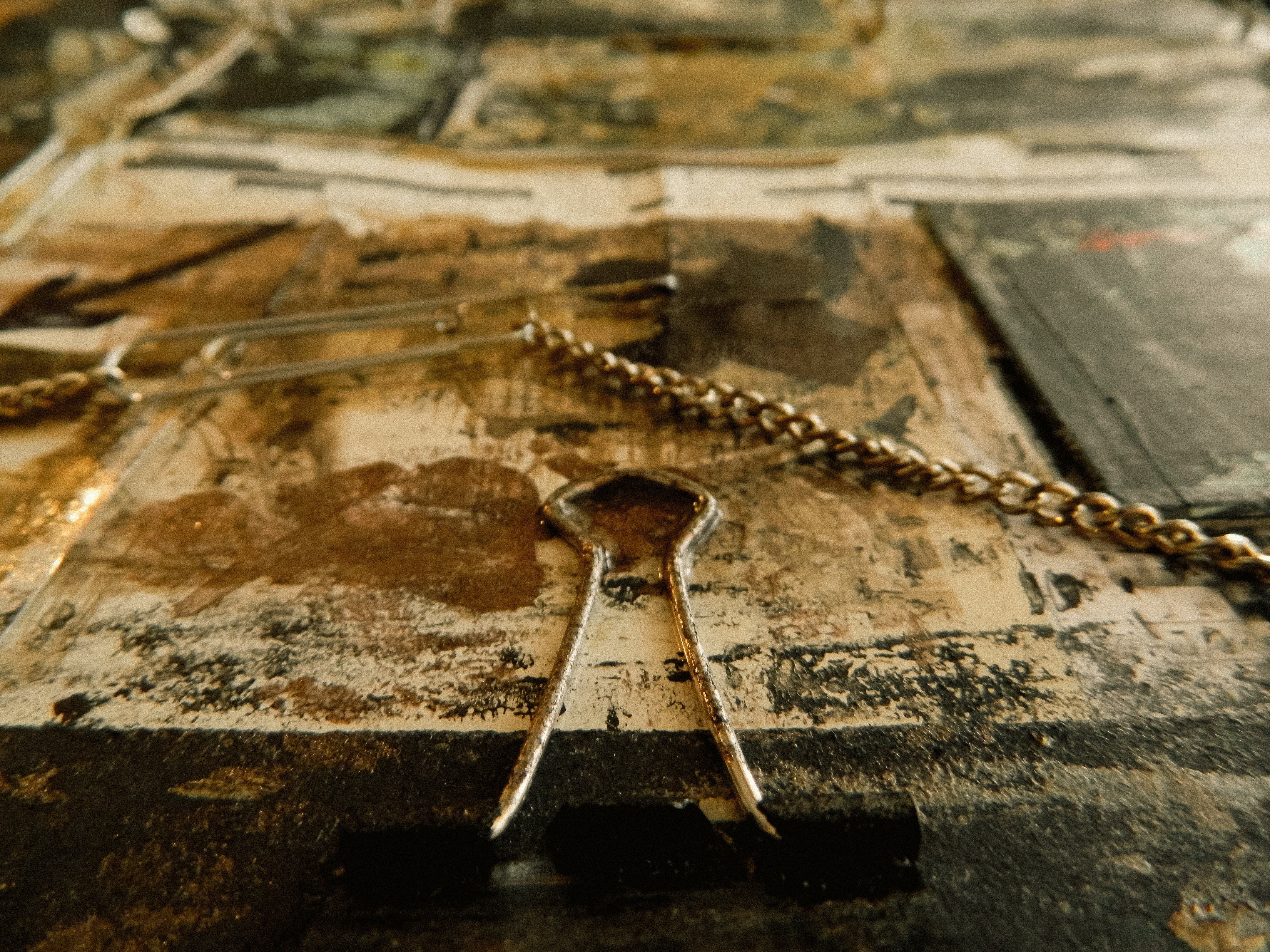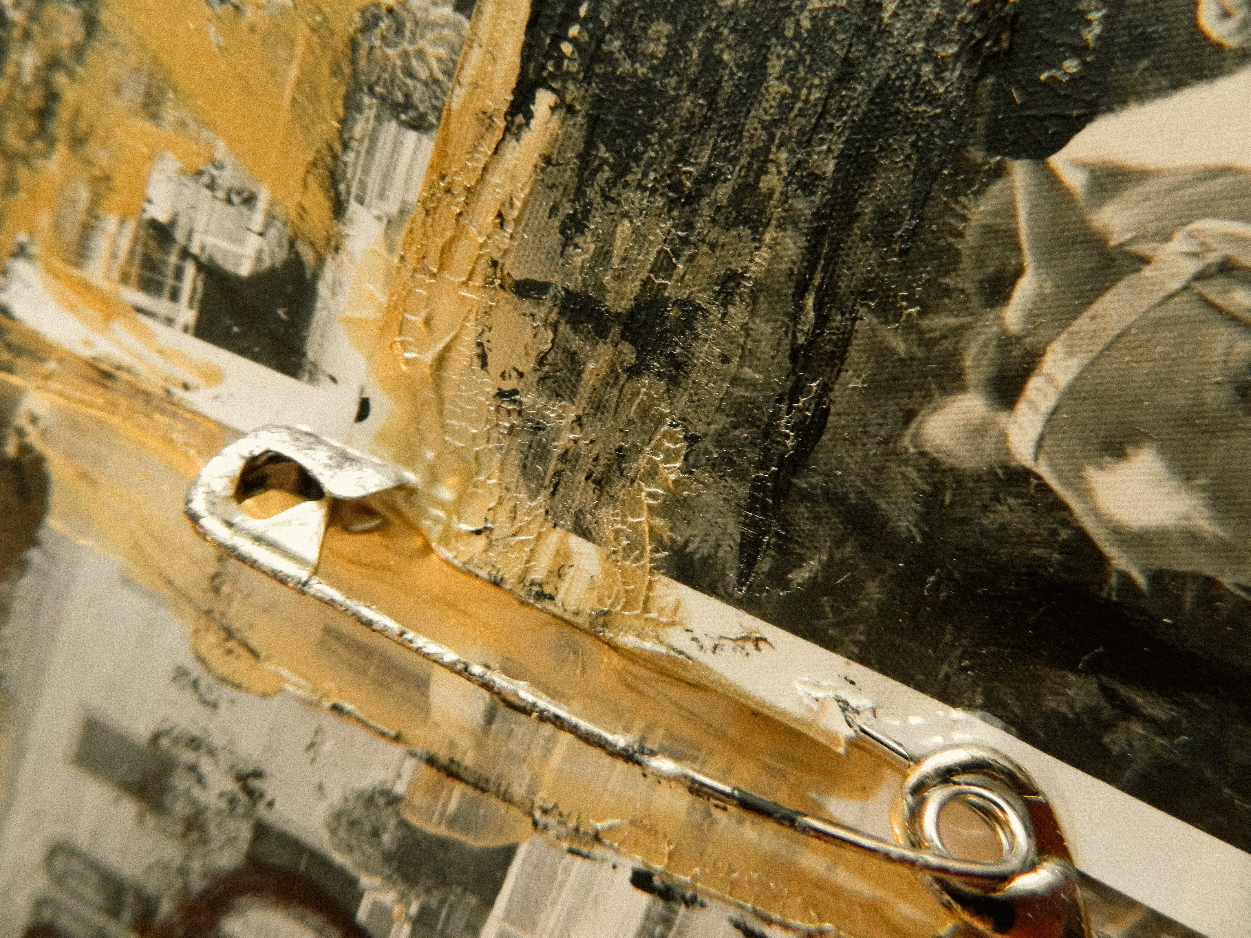 Acrylic, ink, duct tape, office supplies, antique documents/photographs, boardgame tiles, and jewelry on paper/cardboard.