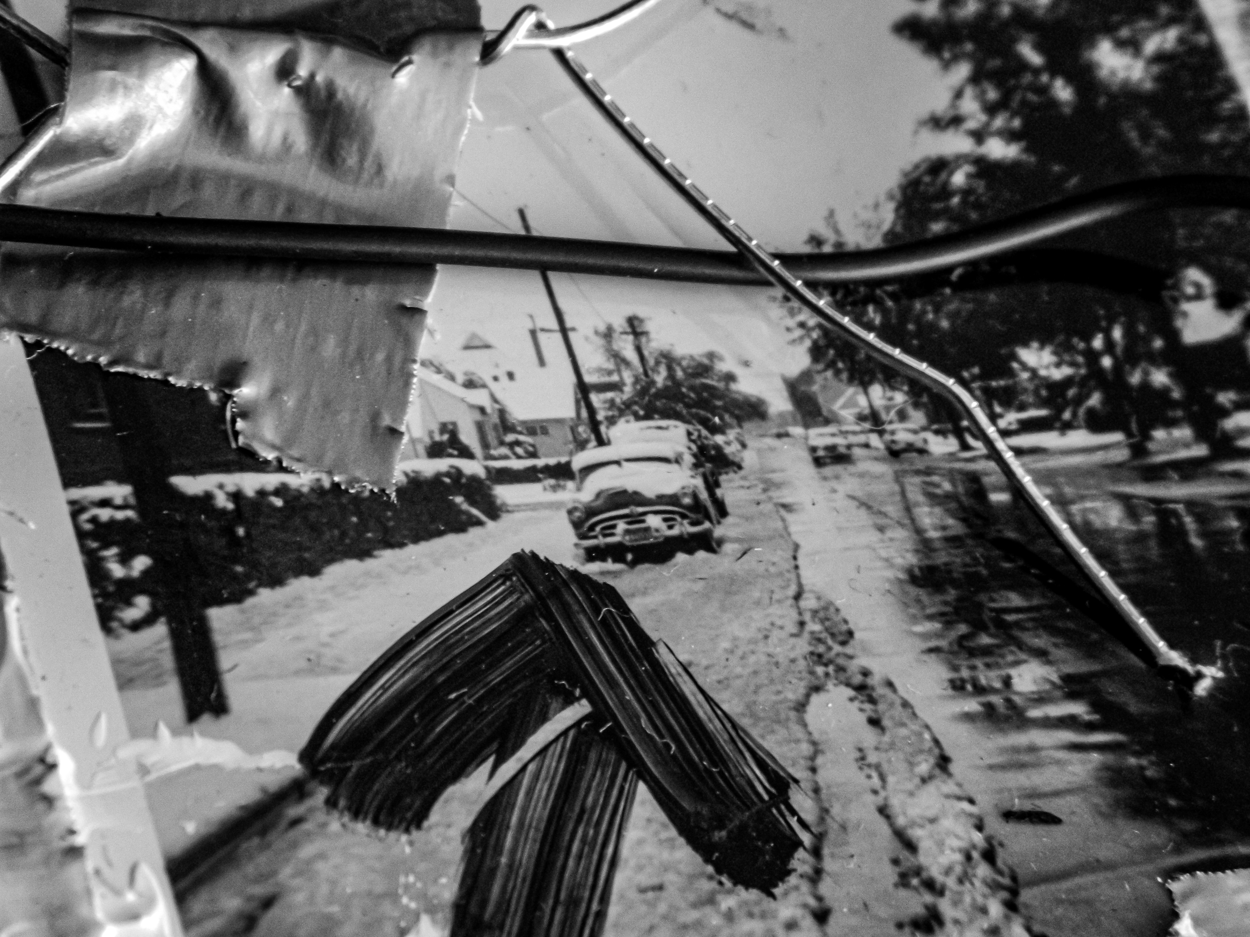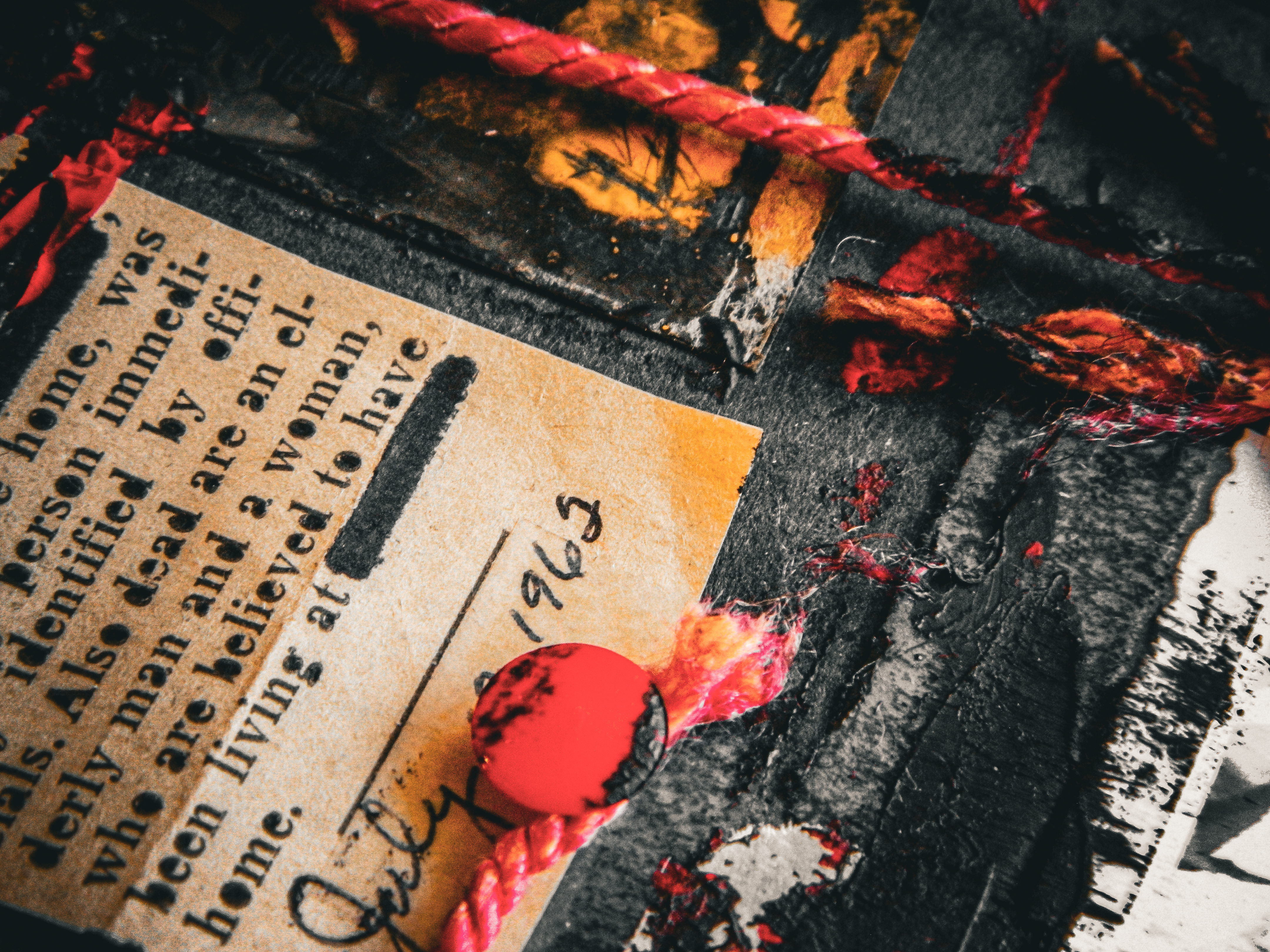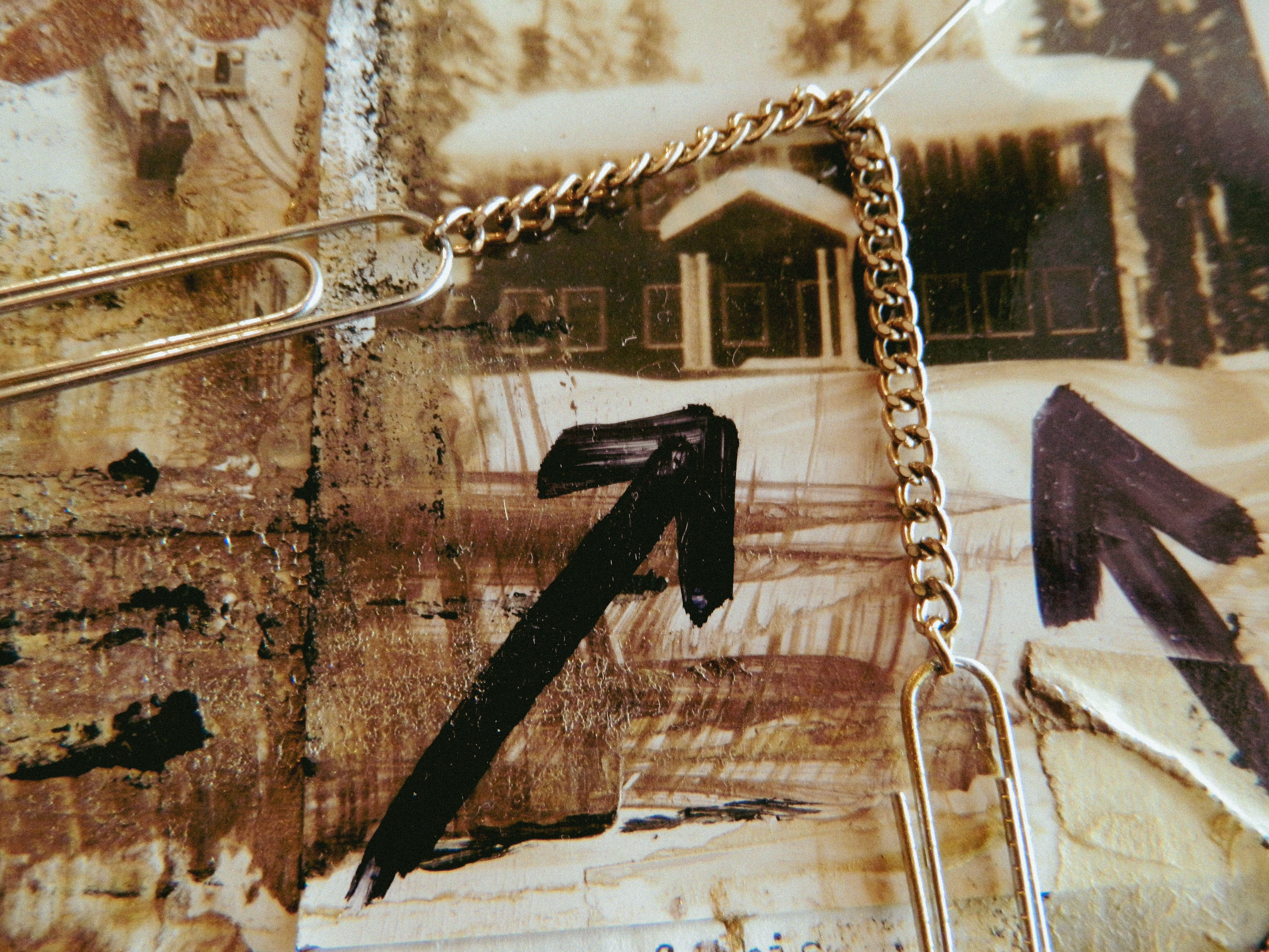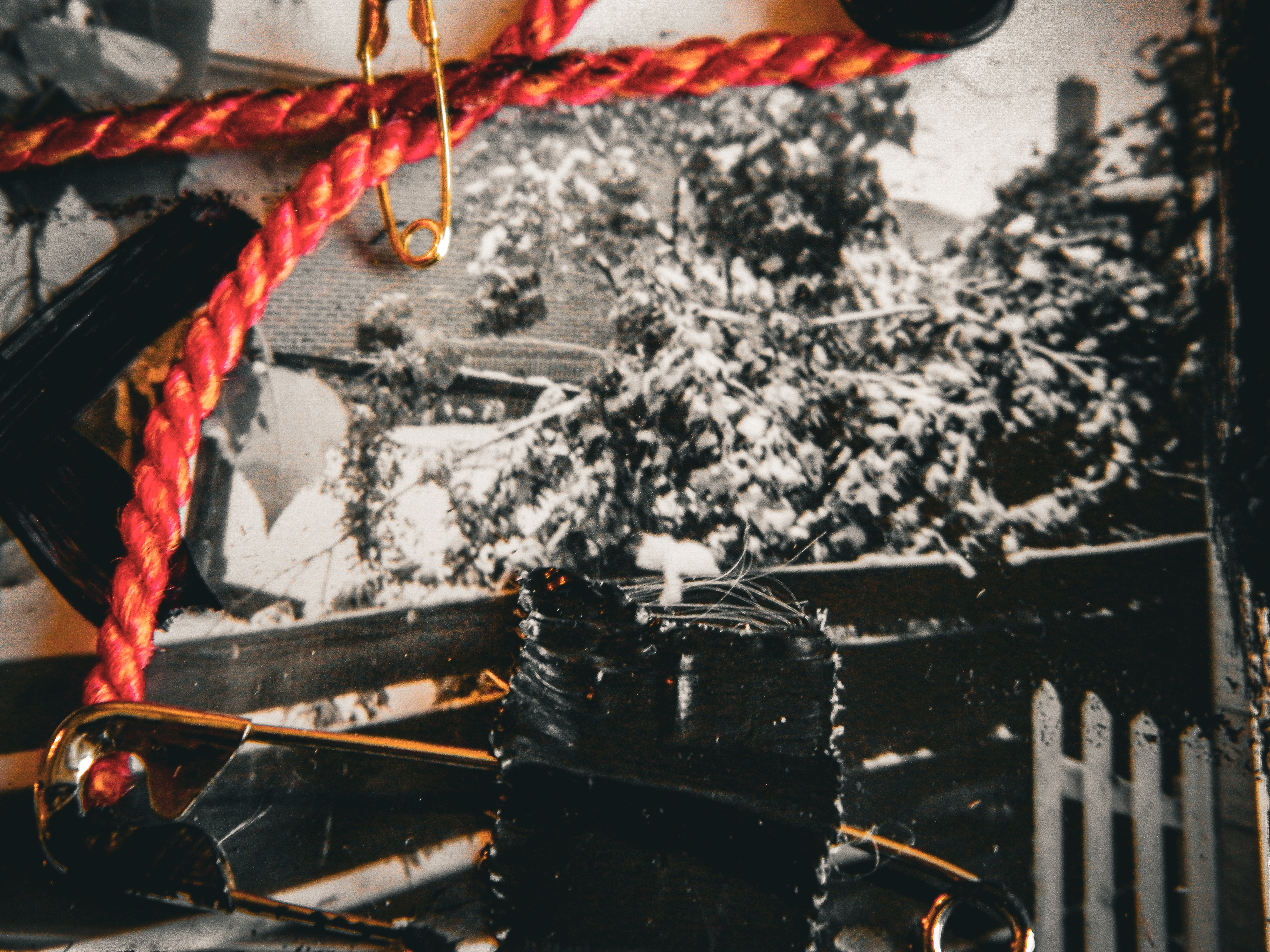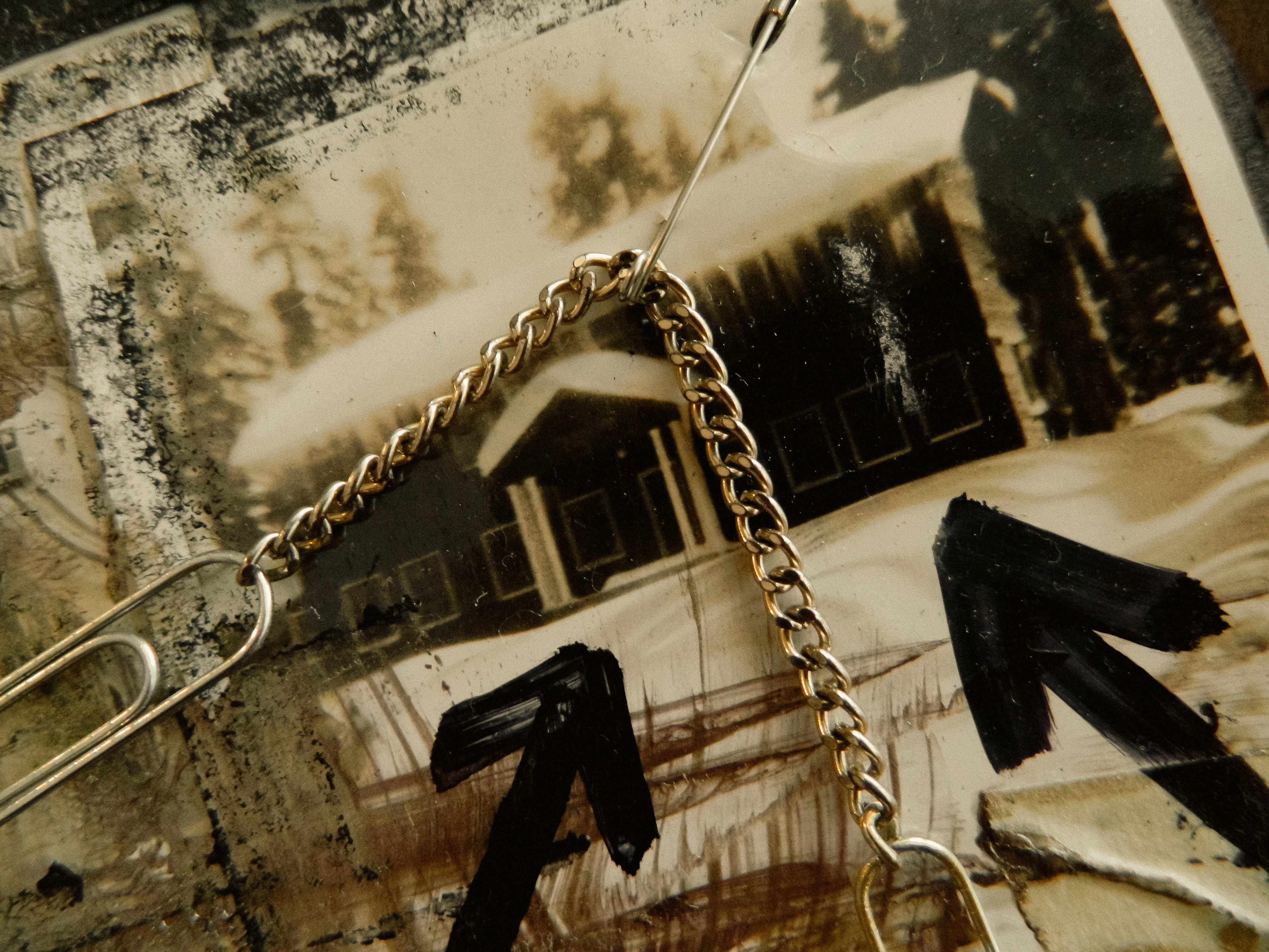 Acrylic, ink, string, duct tape, office supplies, and antique photos on cardboard.