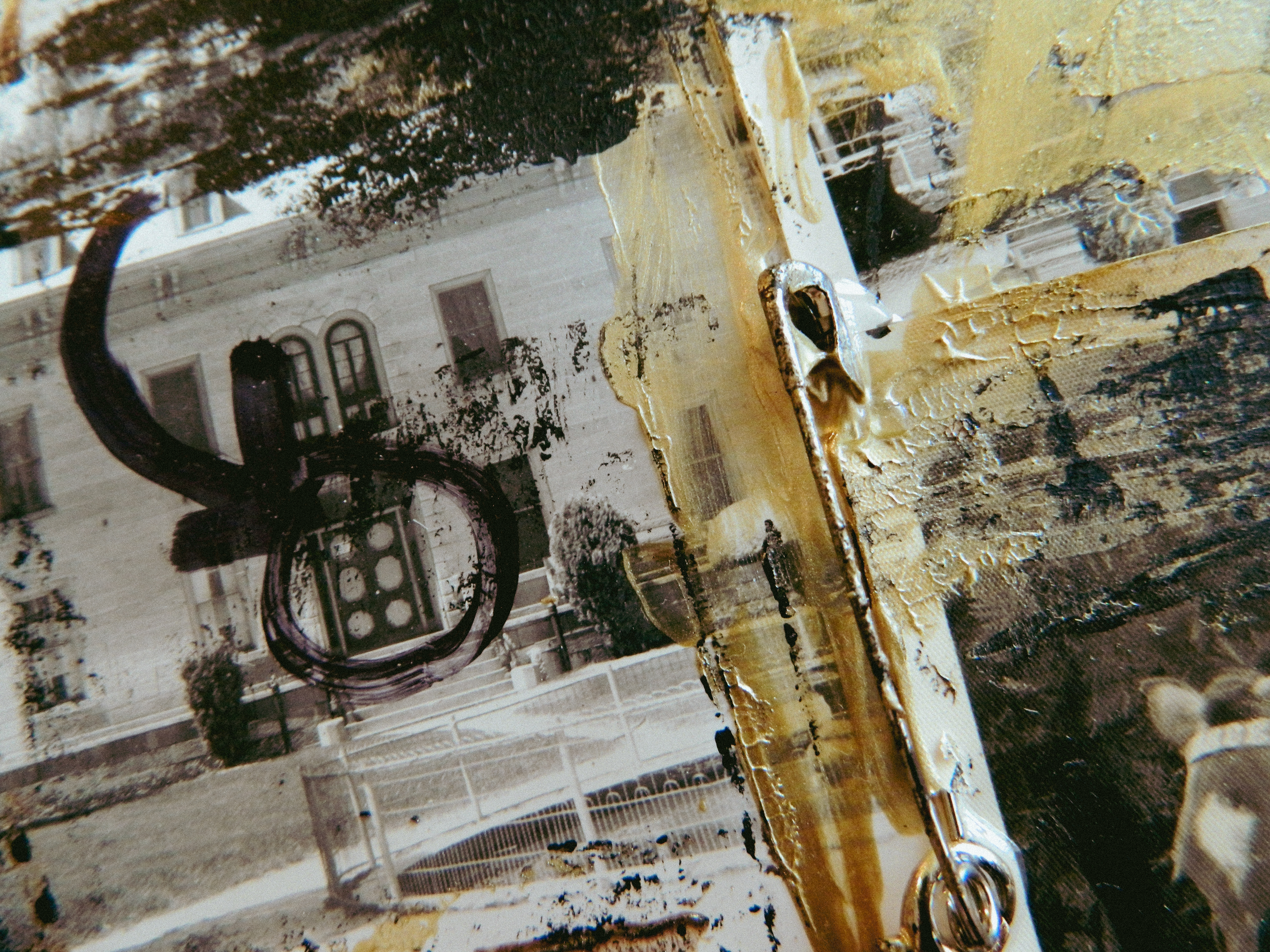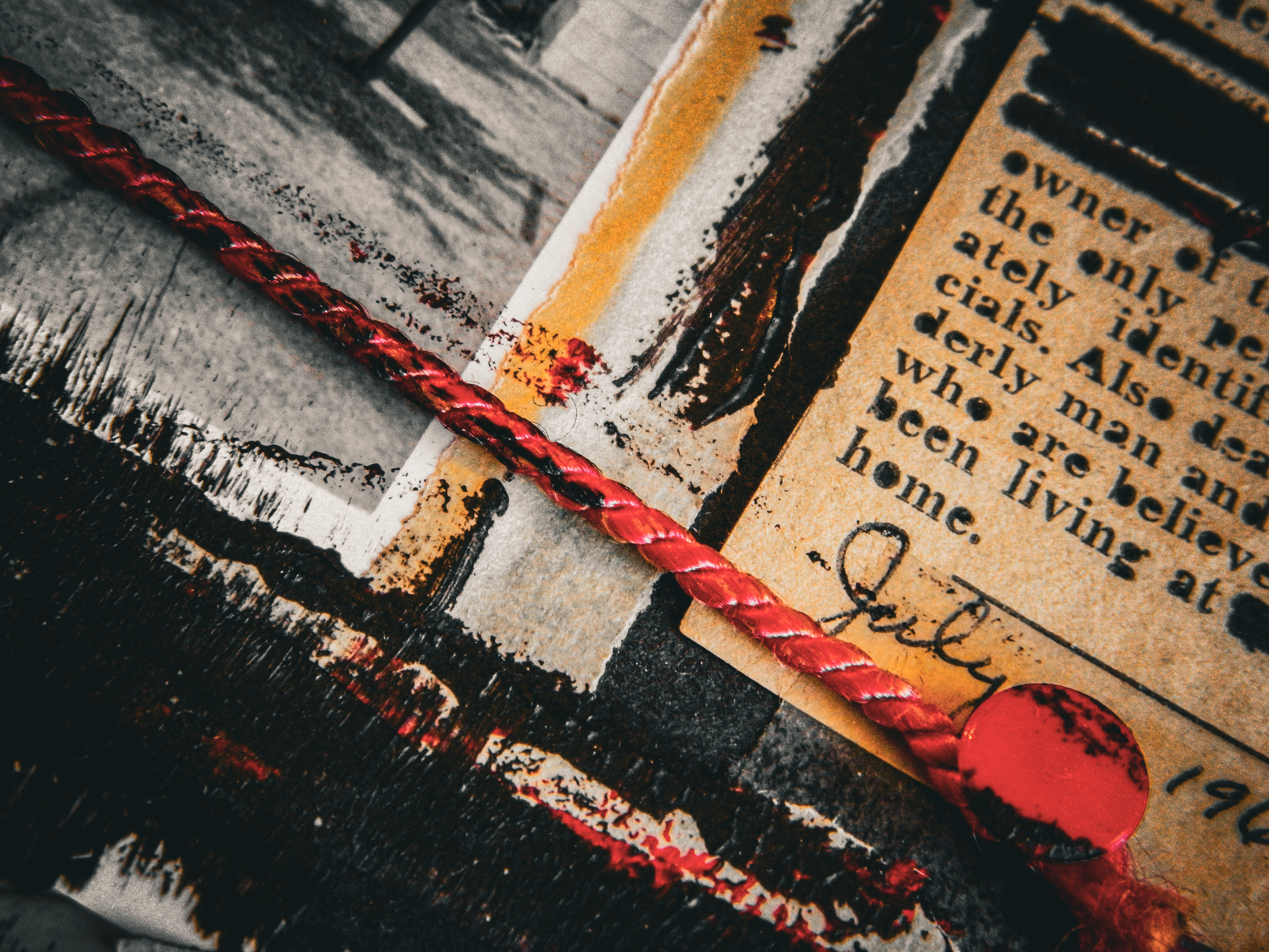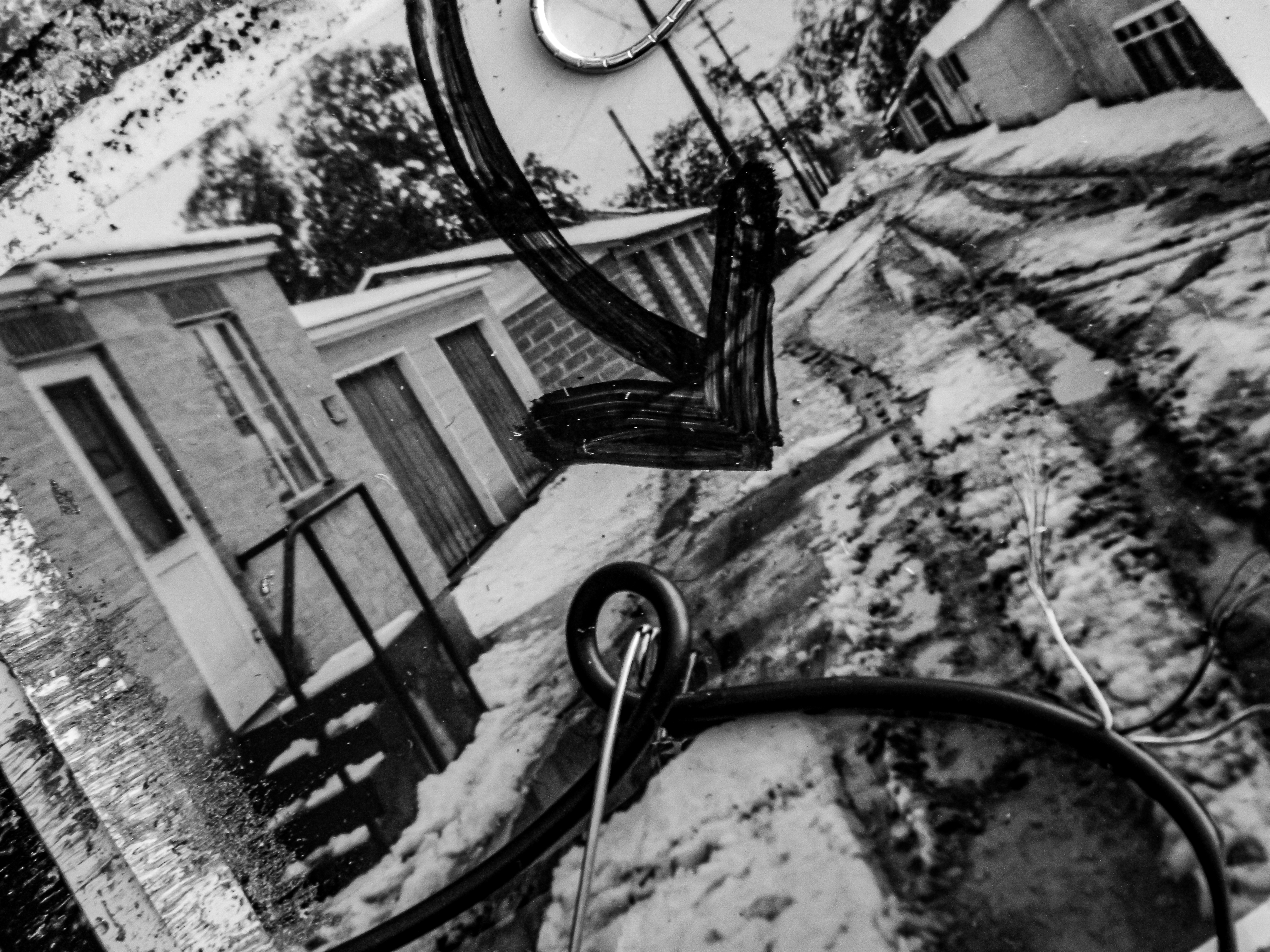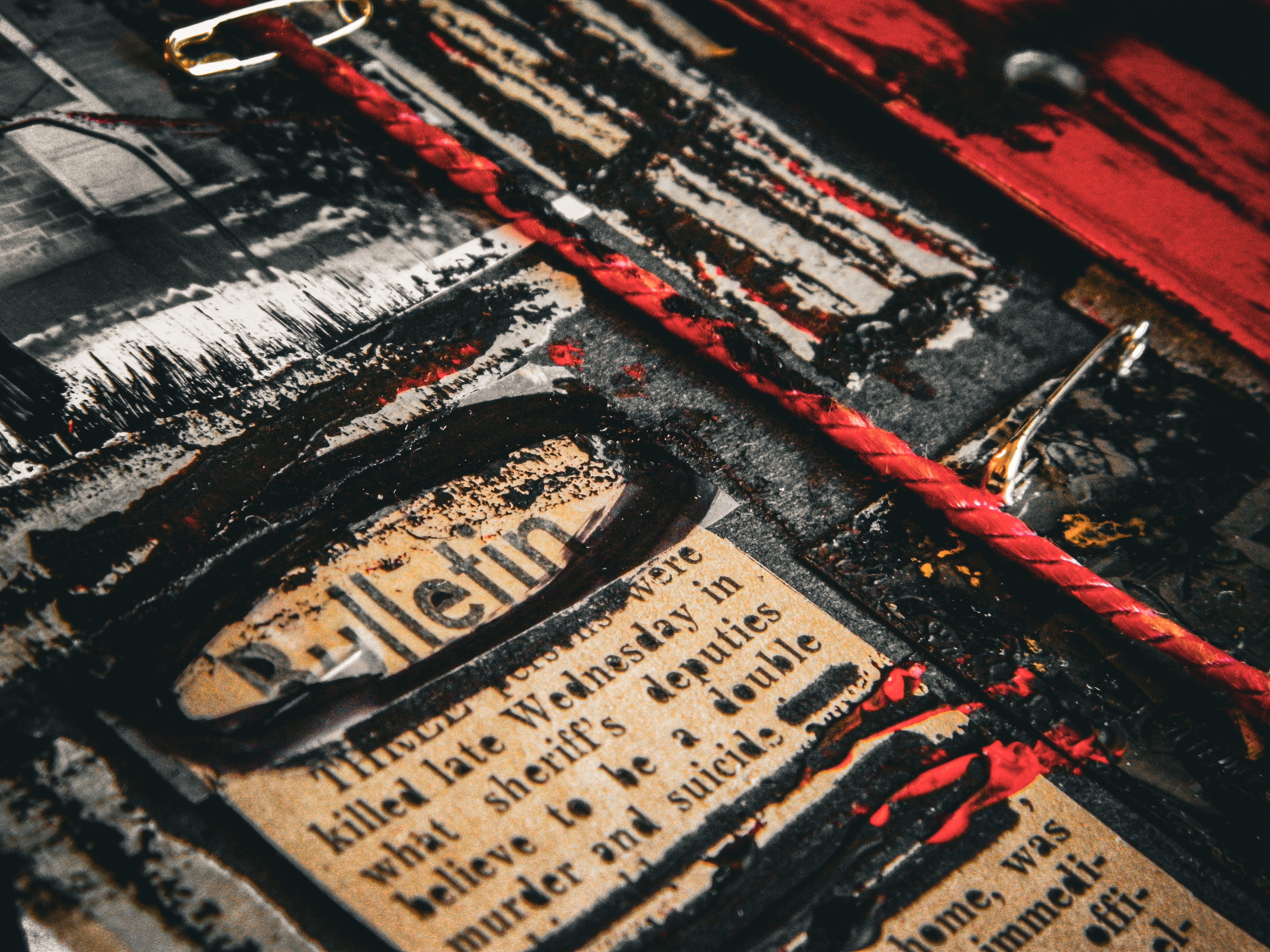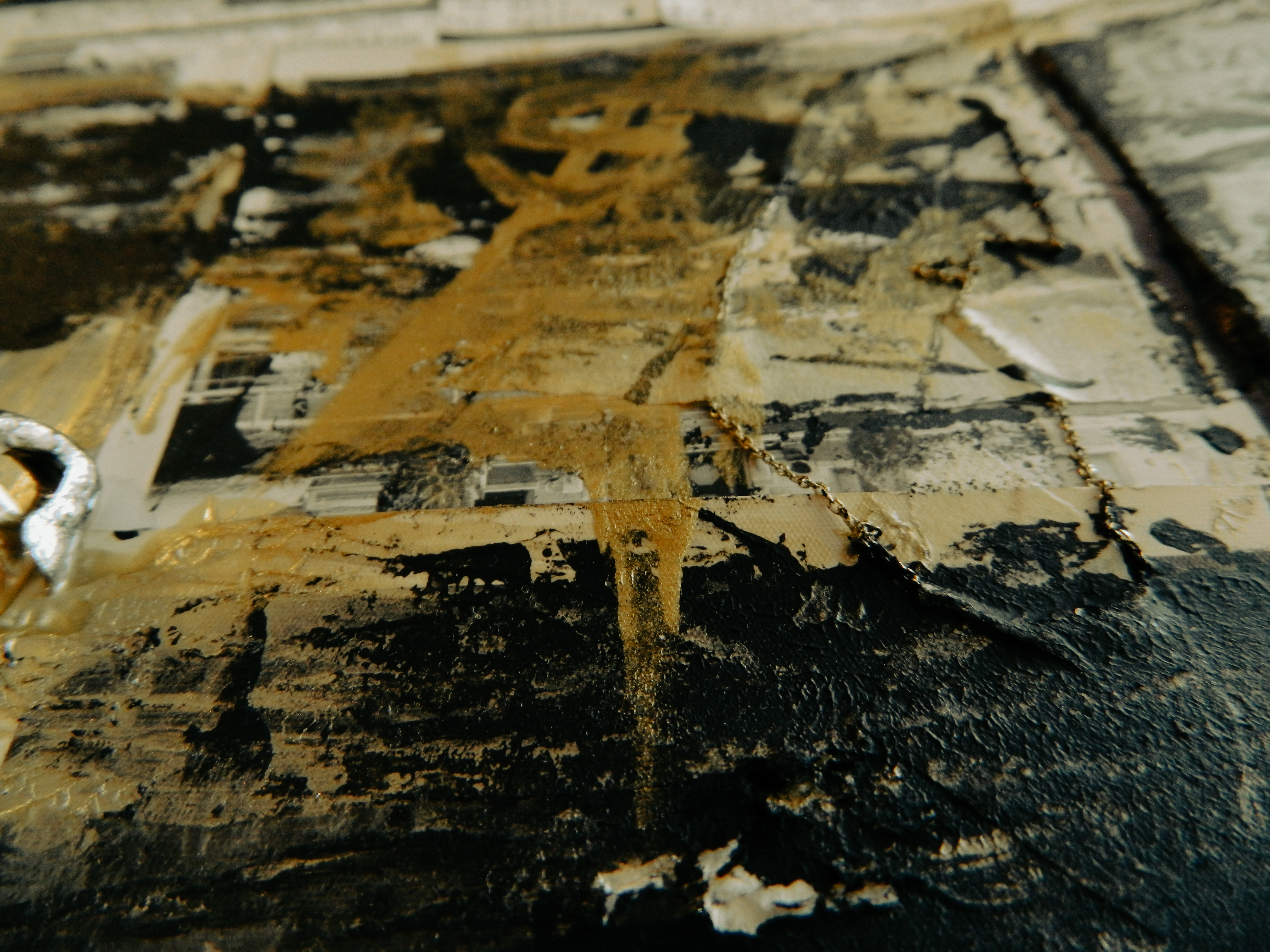 Acrylic, ink, string, duct tape, office supplies, and antique photos on cardboard.