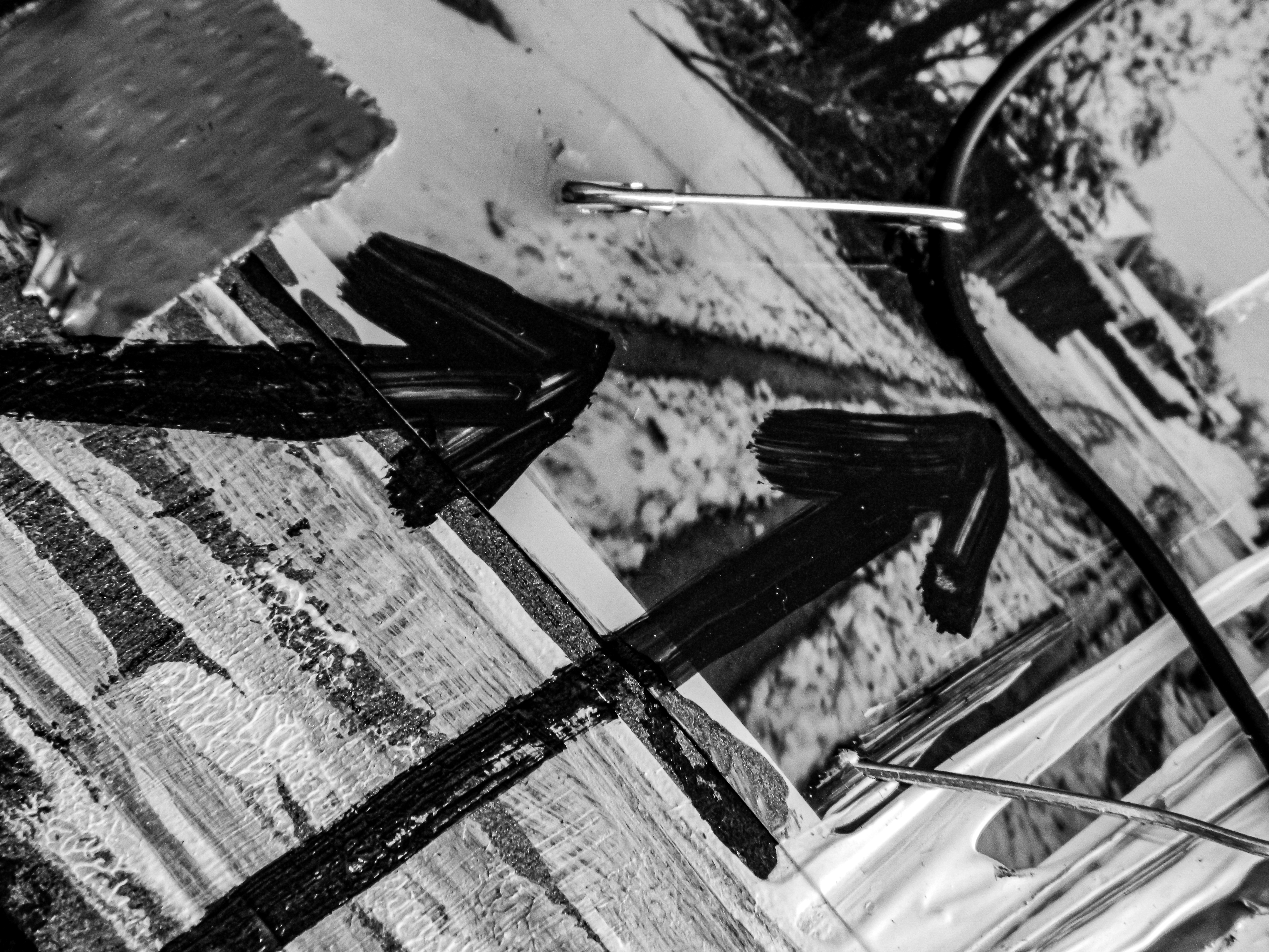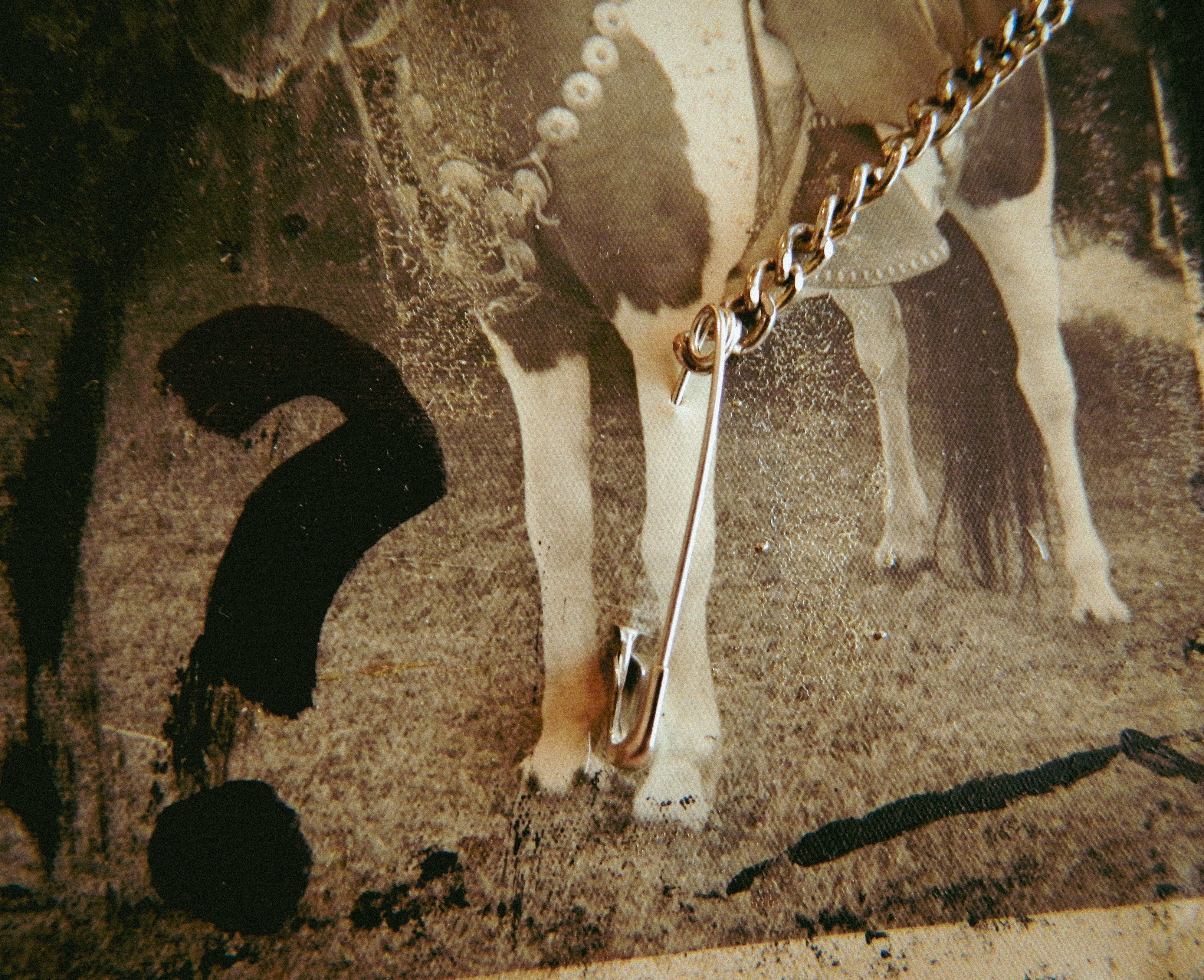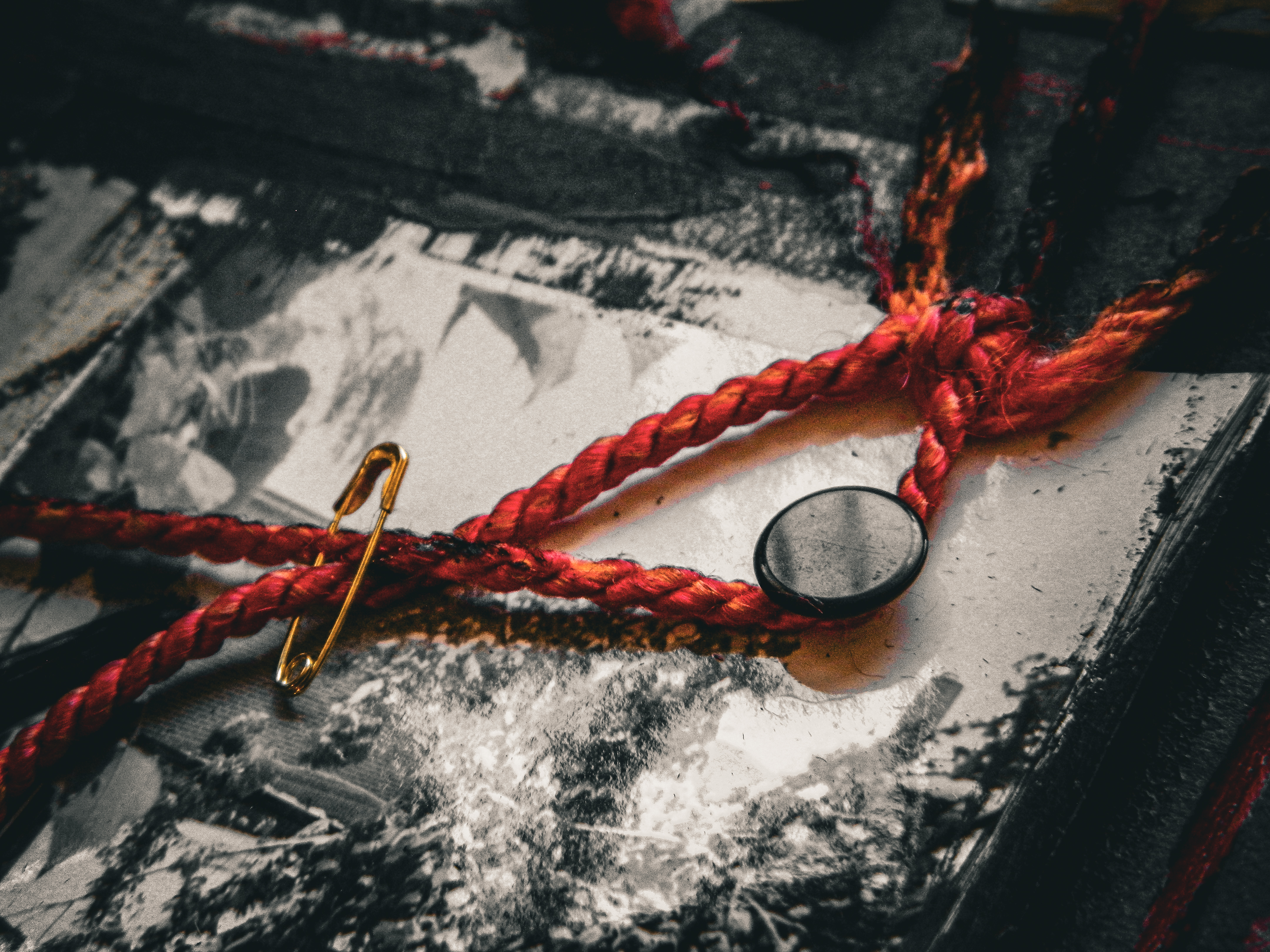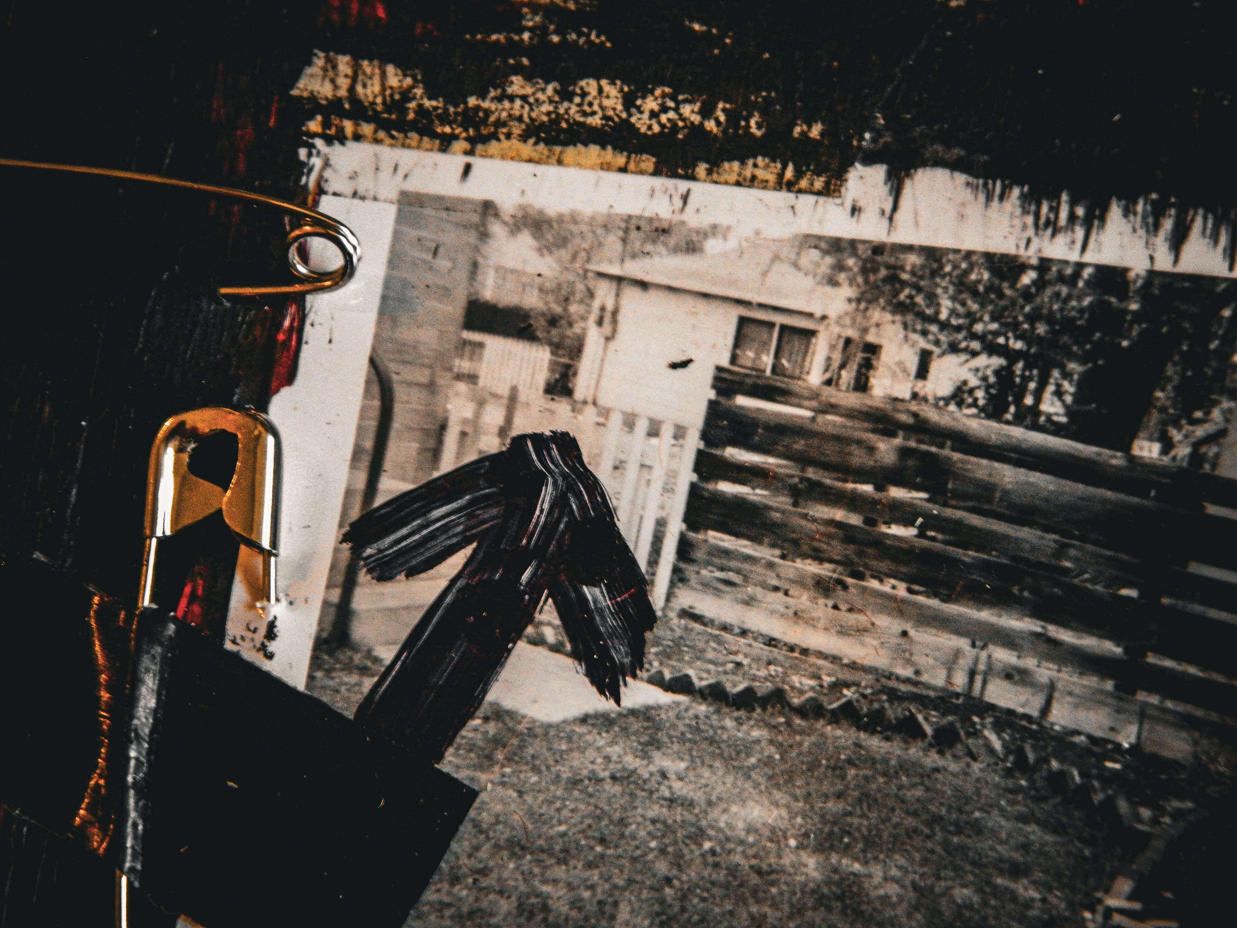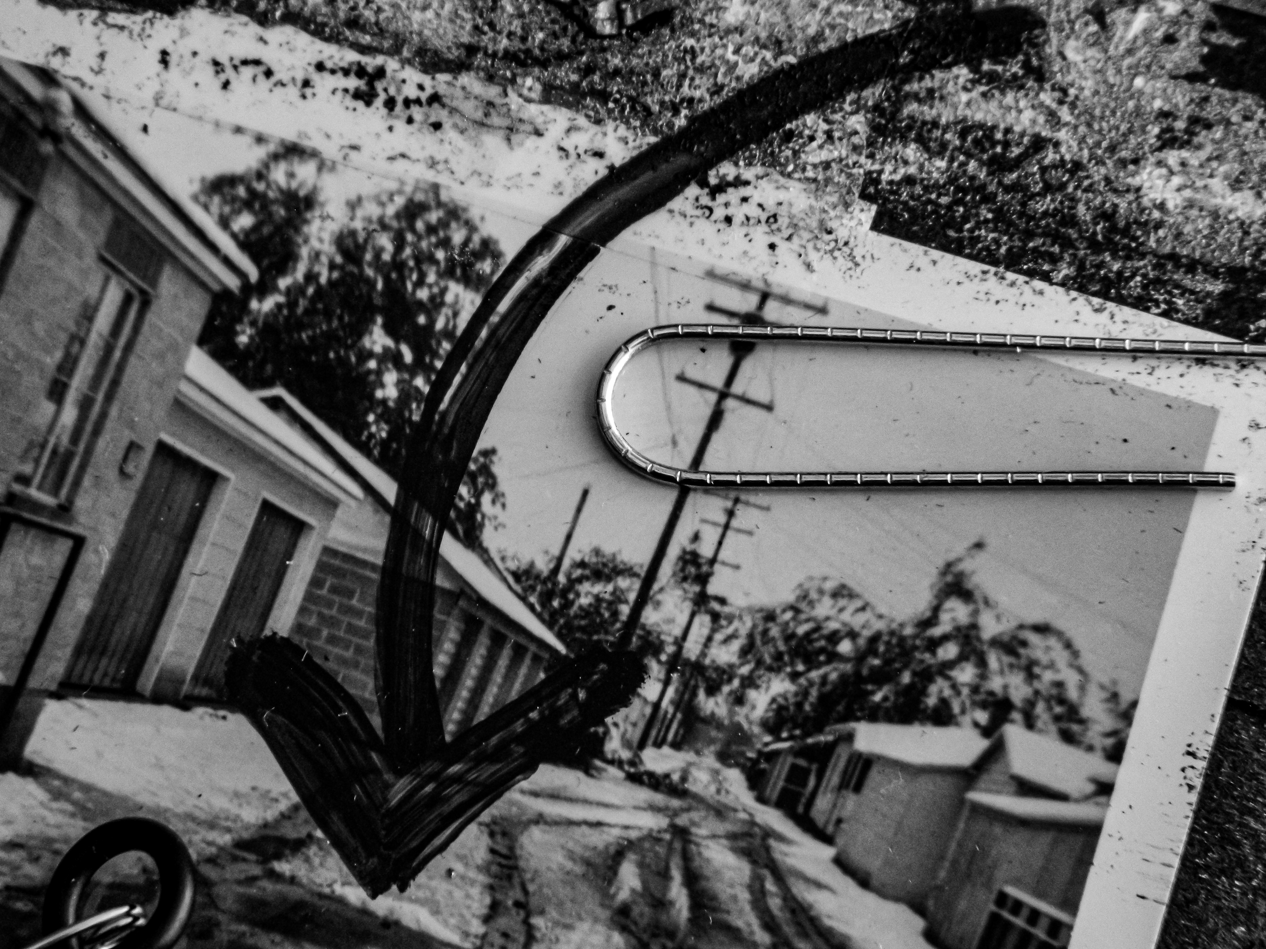 Acrylic, ink, string, duct tape, office supplies, and antique photos on cardboard.
