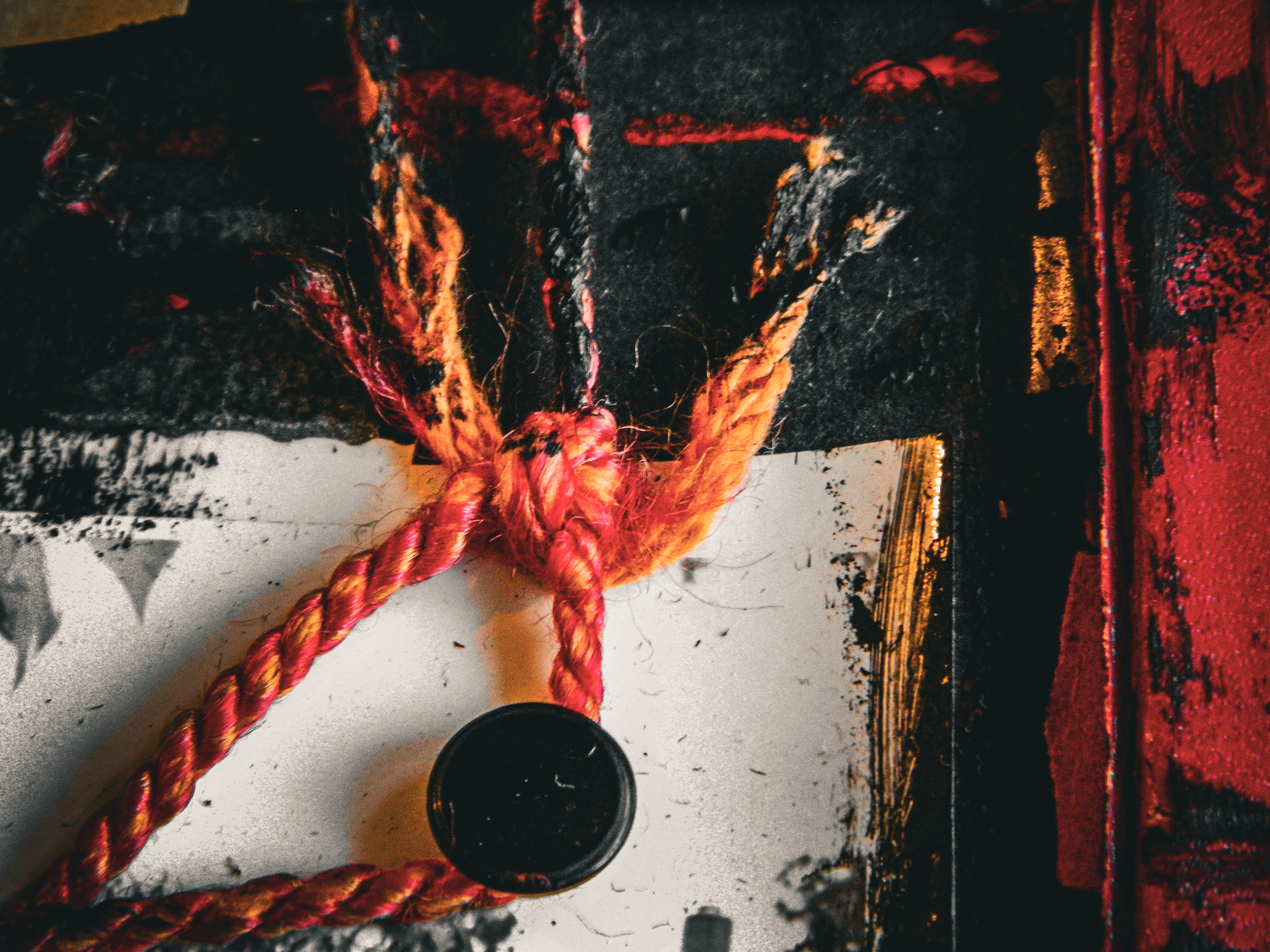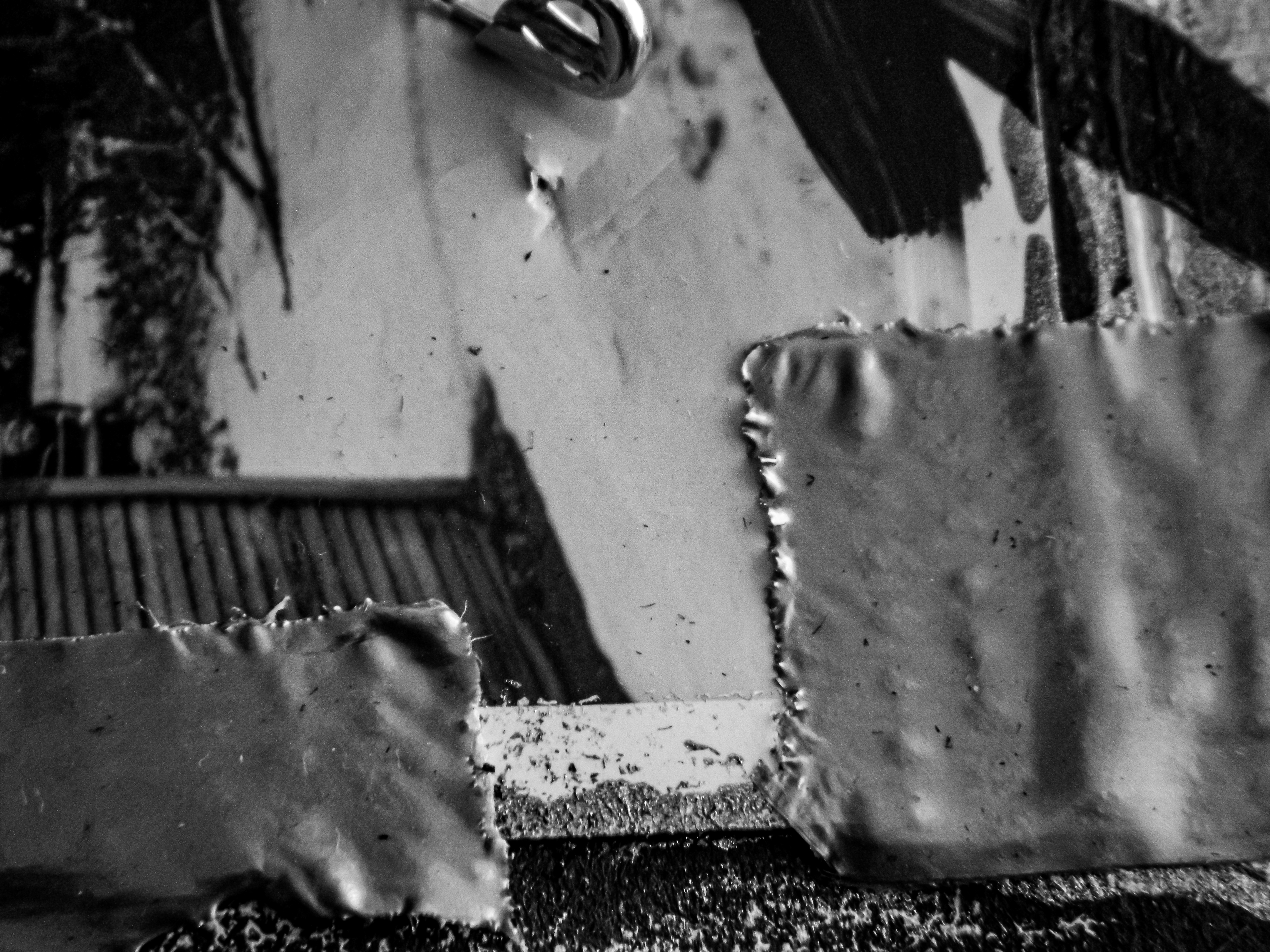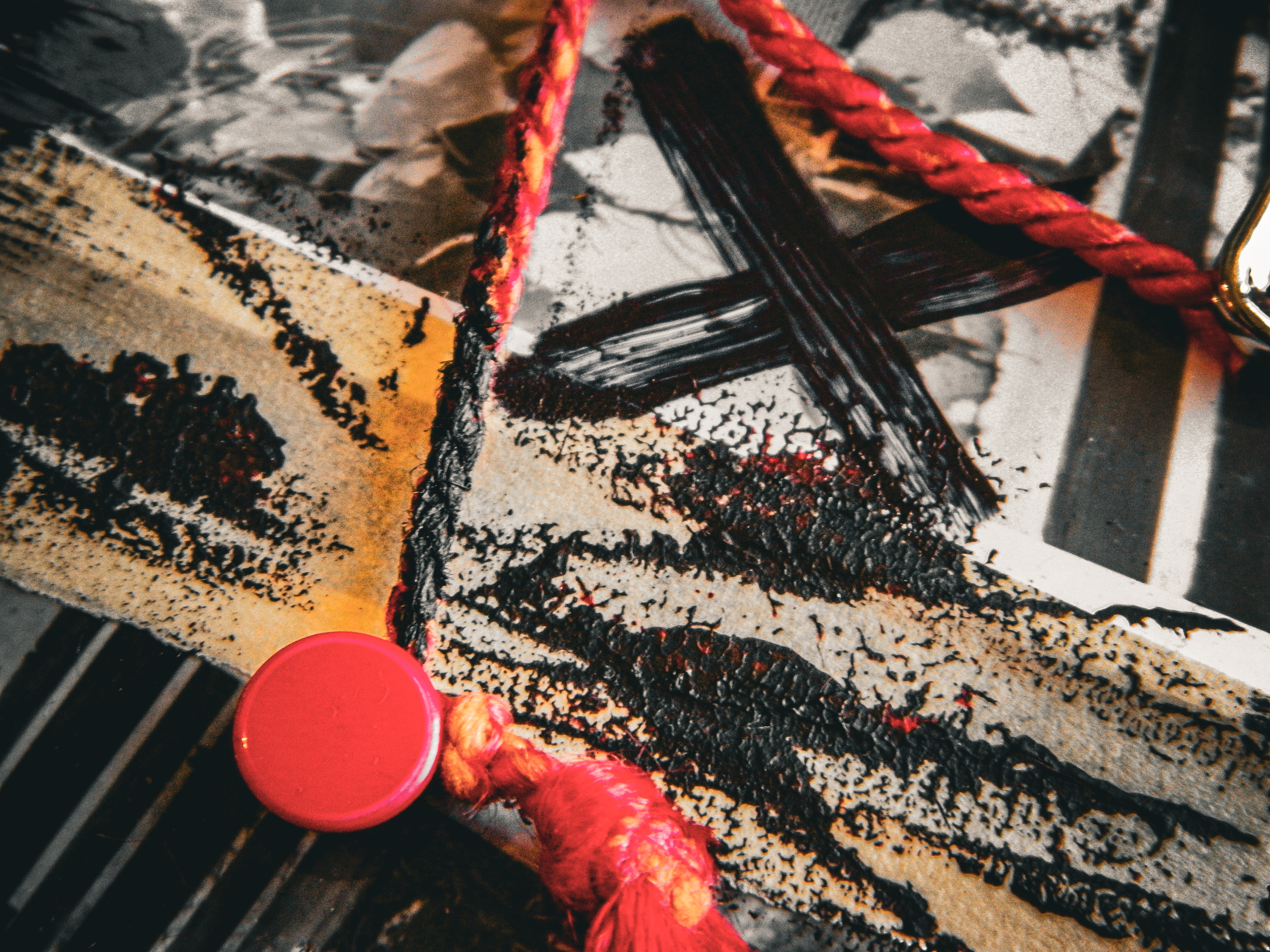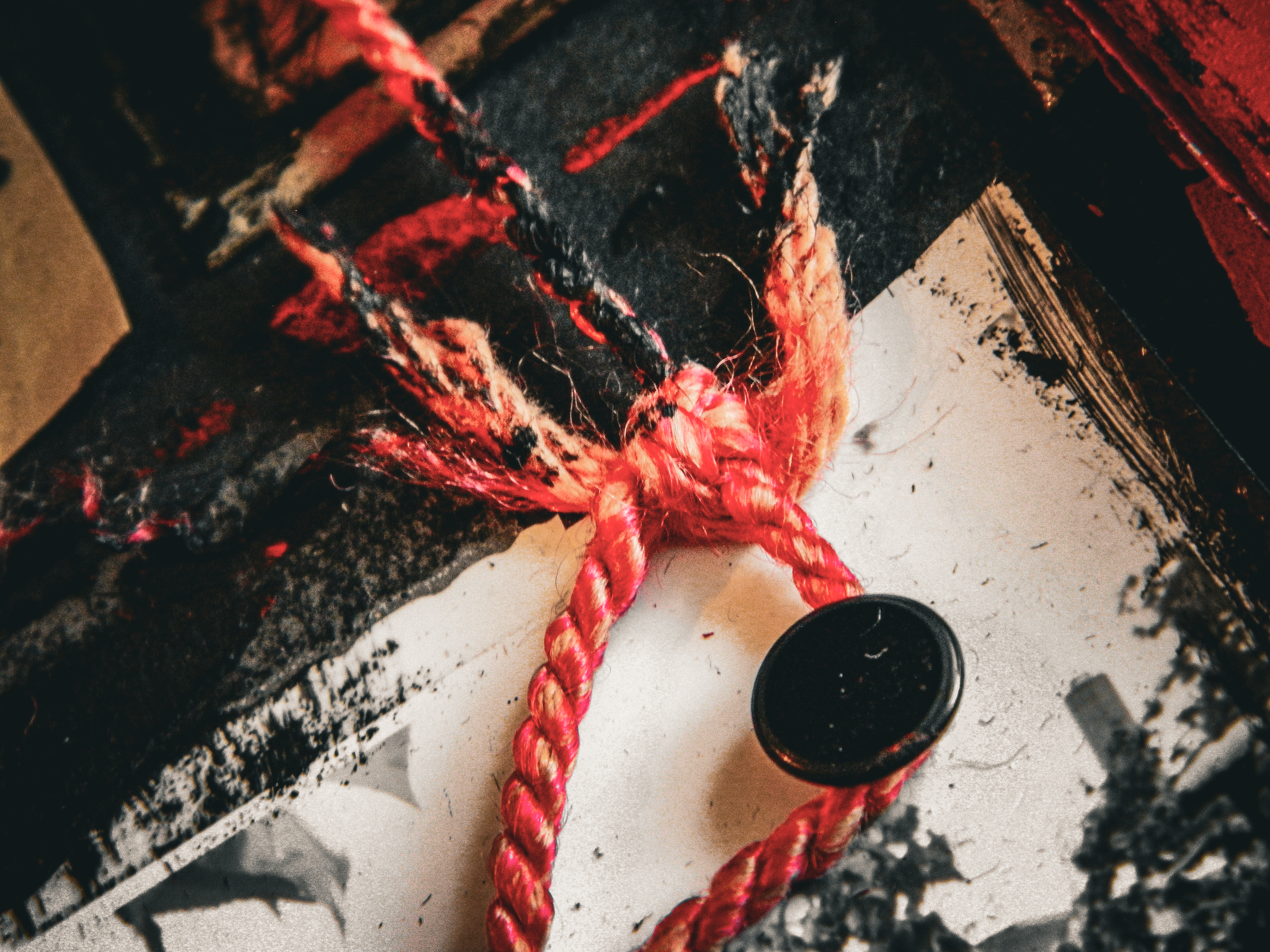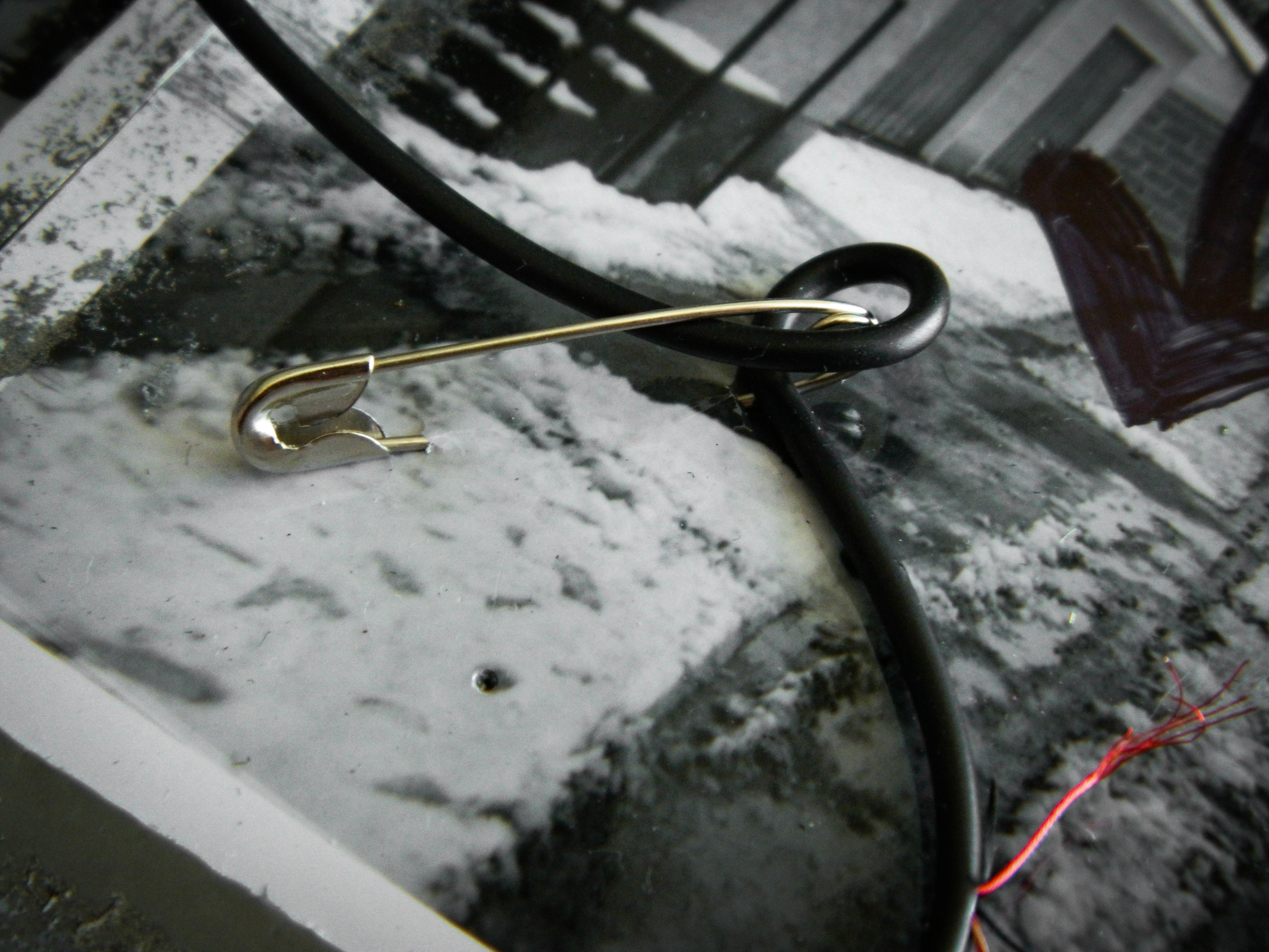 Acrylic, ink, string, duct tape, office supplies, and antique photos on cardboard.