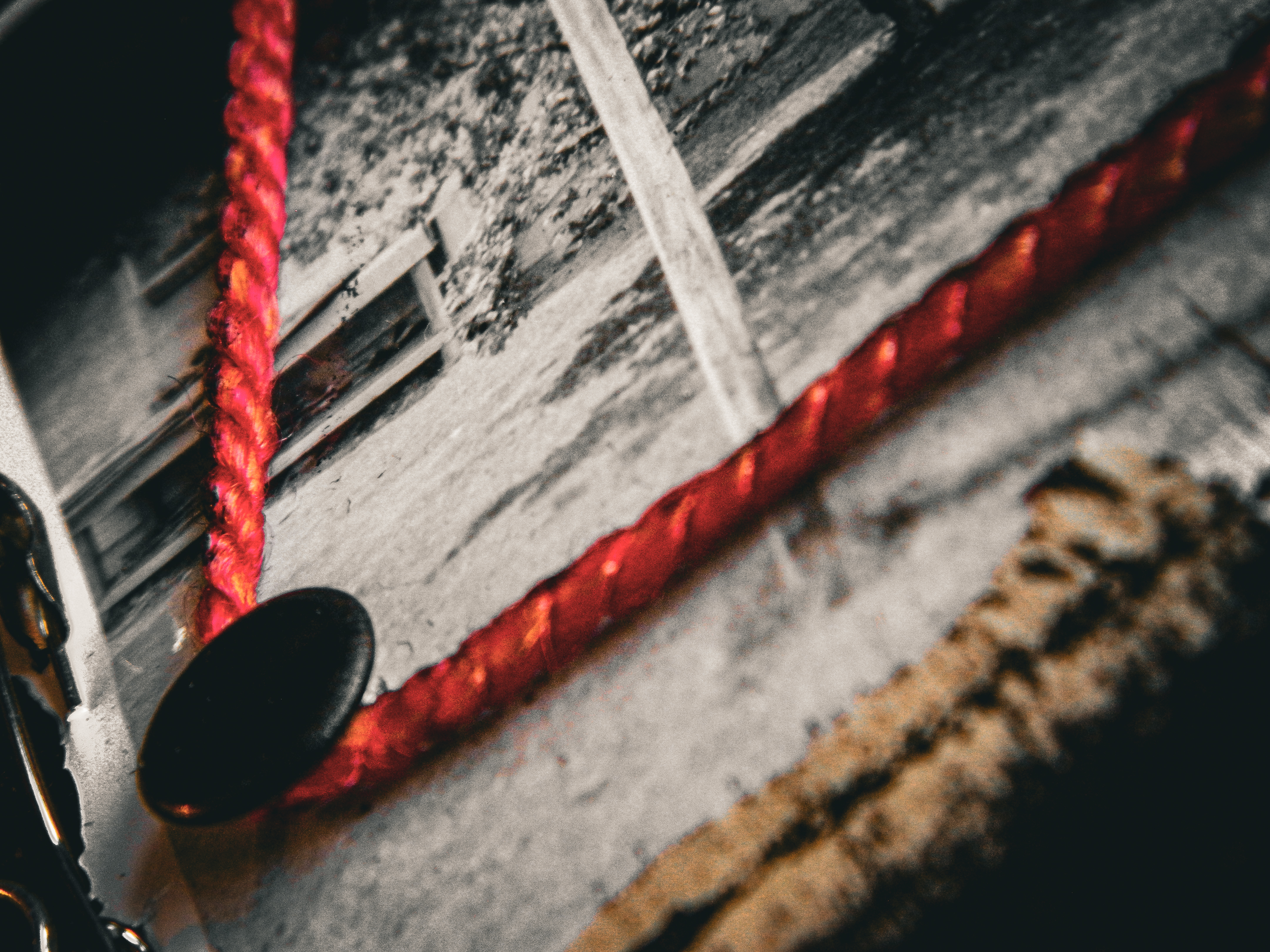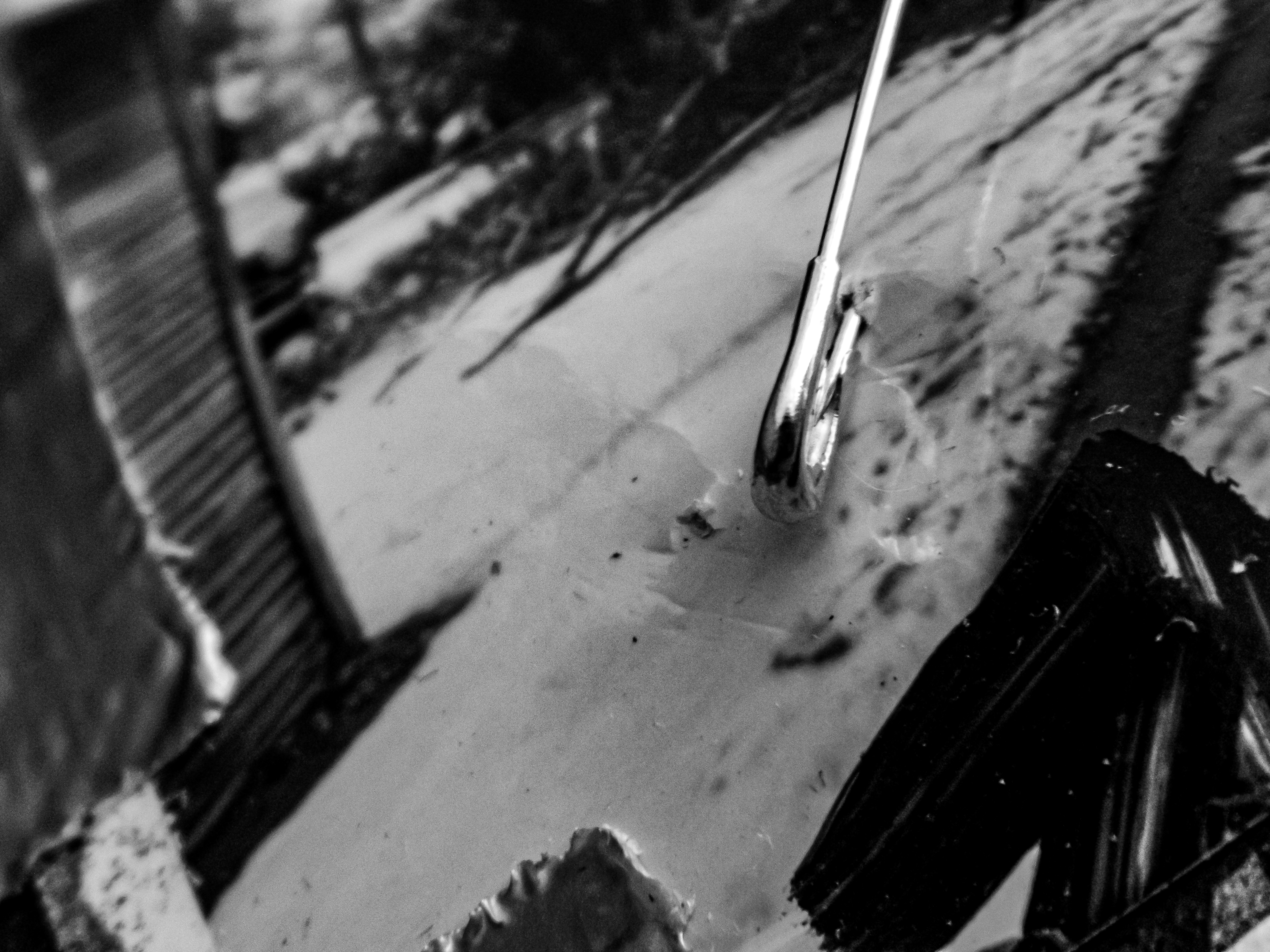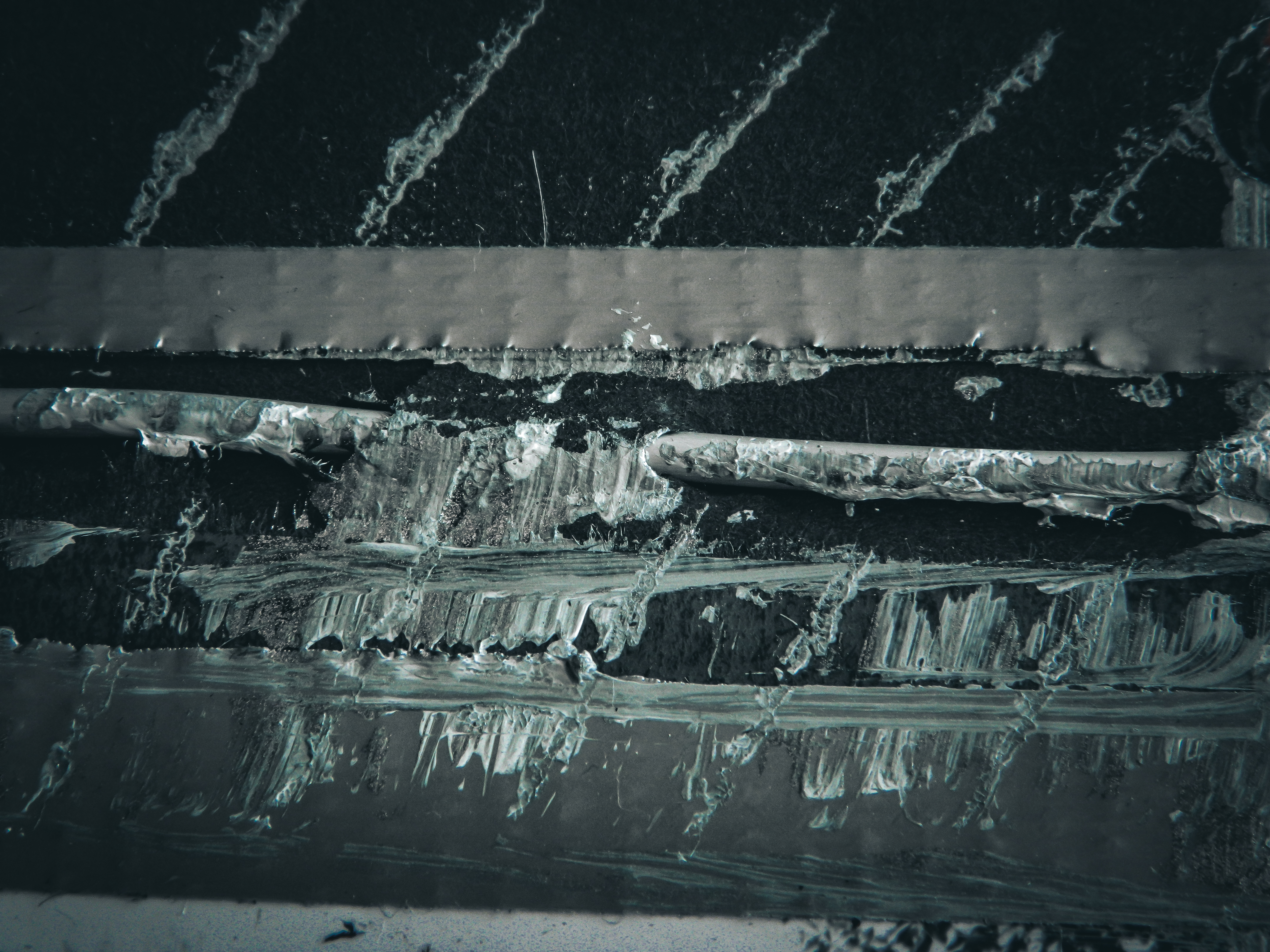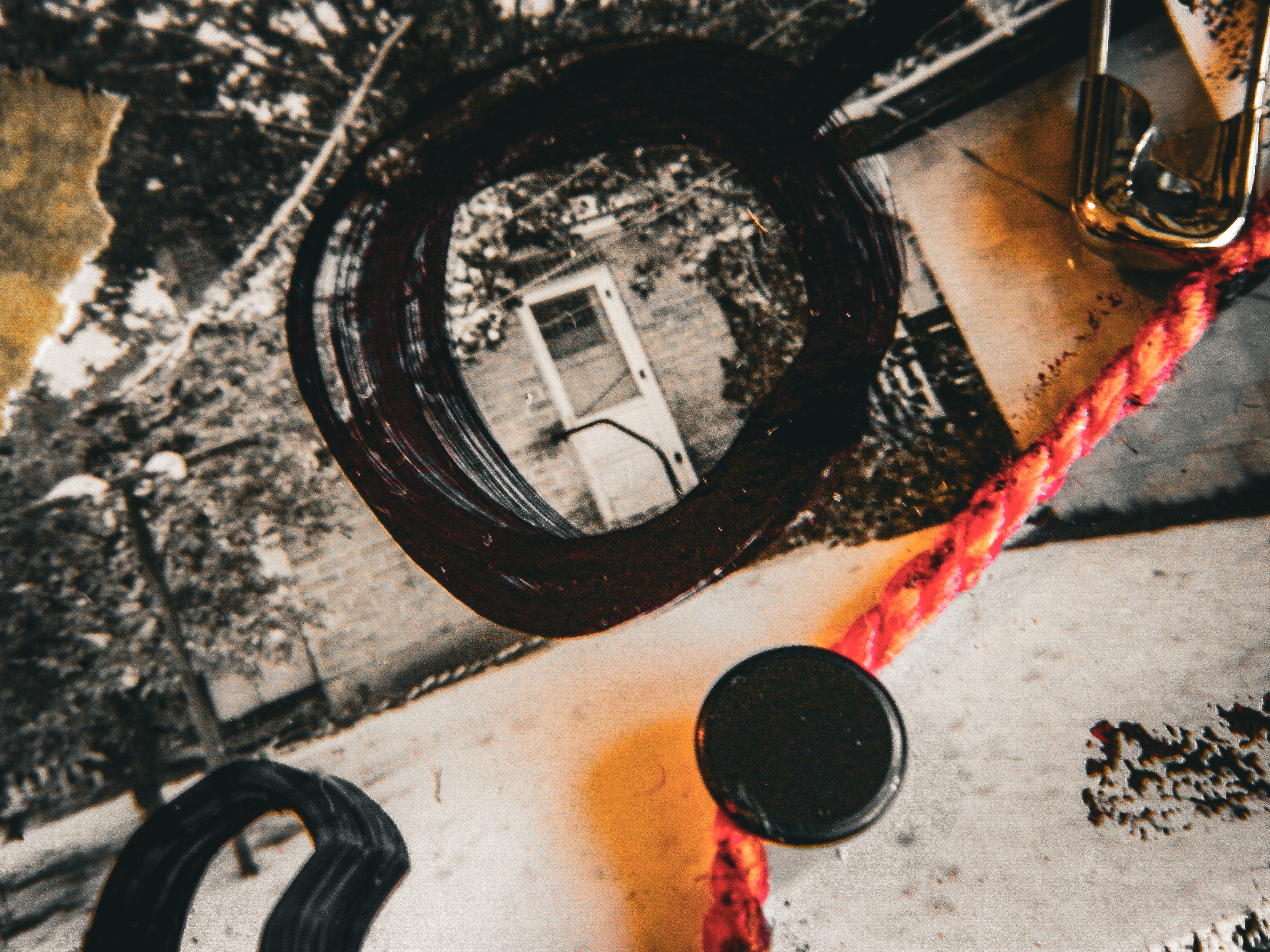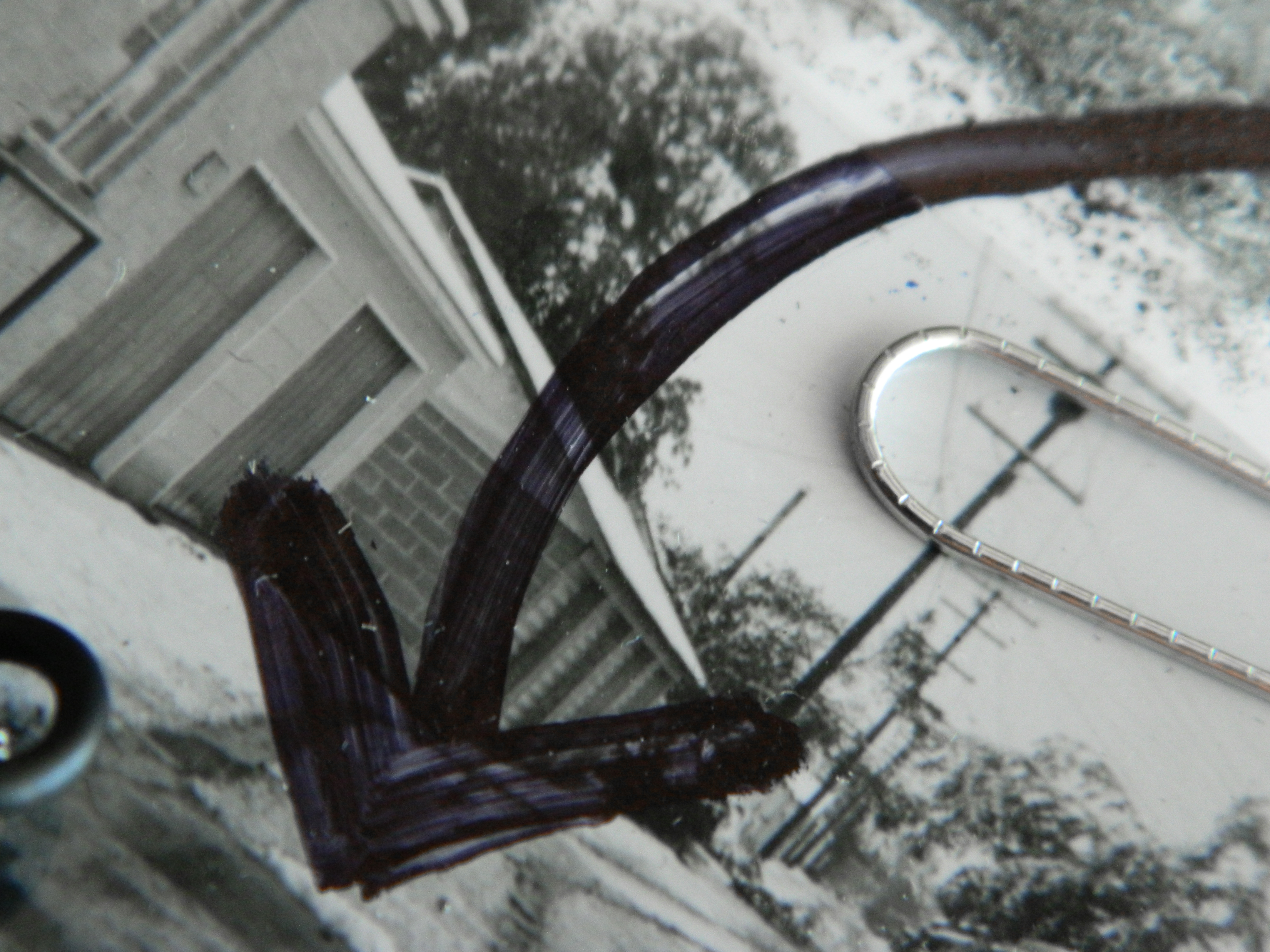 Acrylic, ink, string, duct tape, office supplies, and antique photos on cardboard.