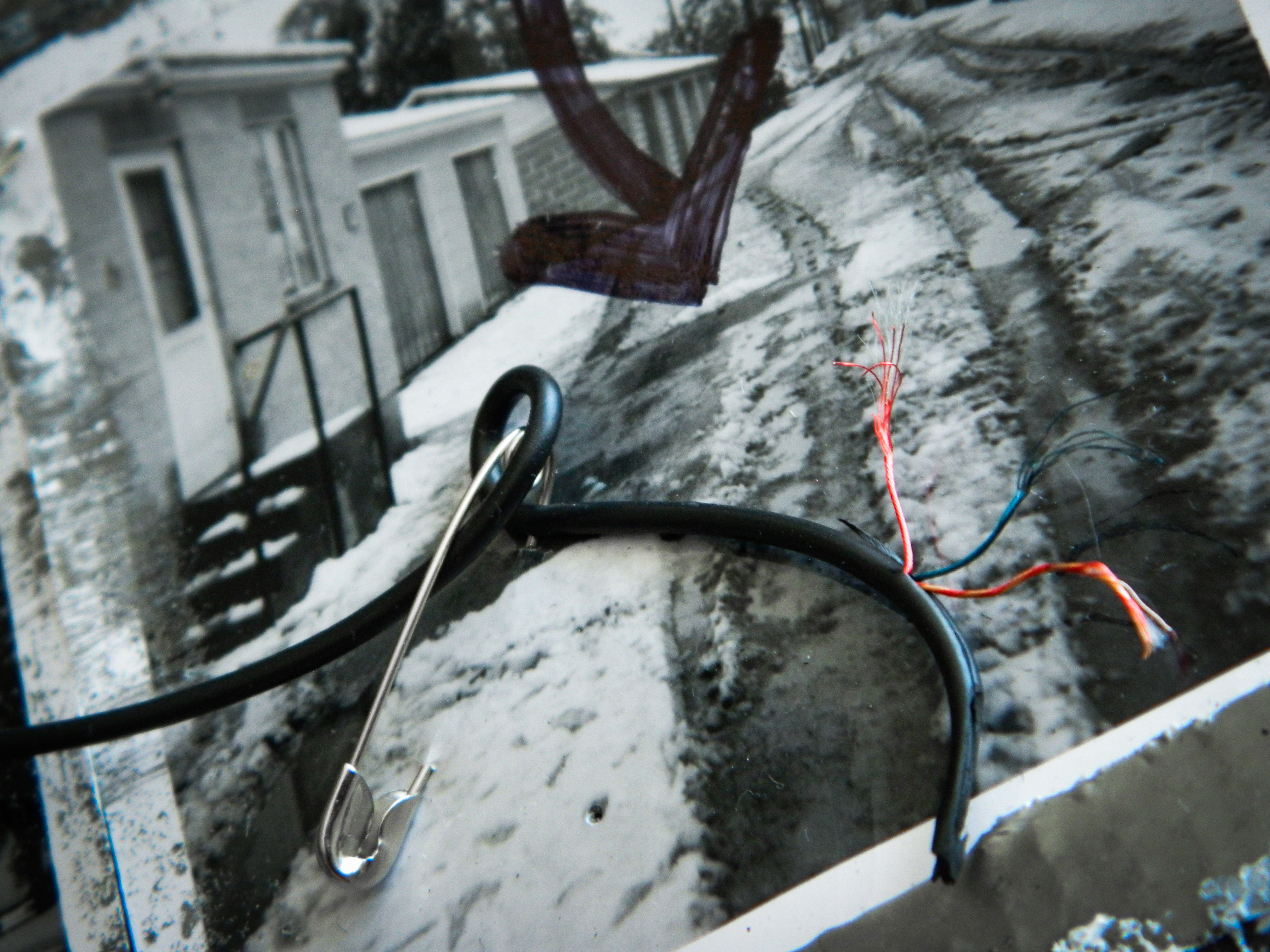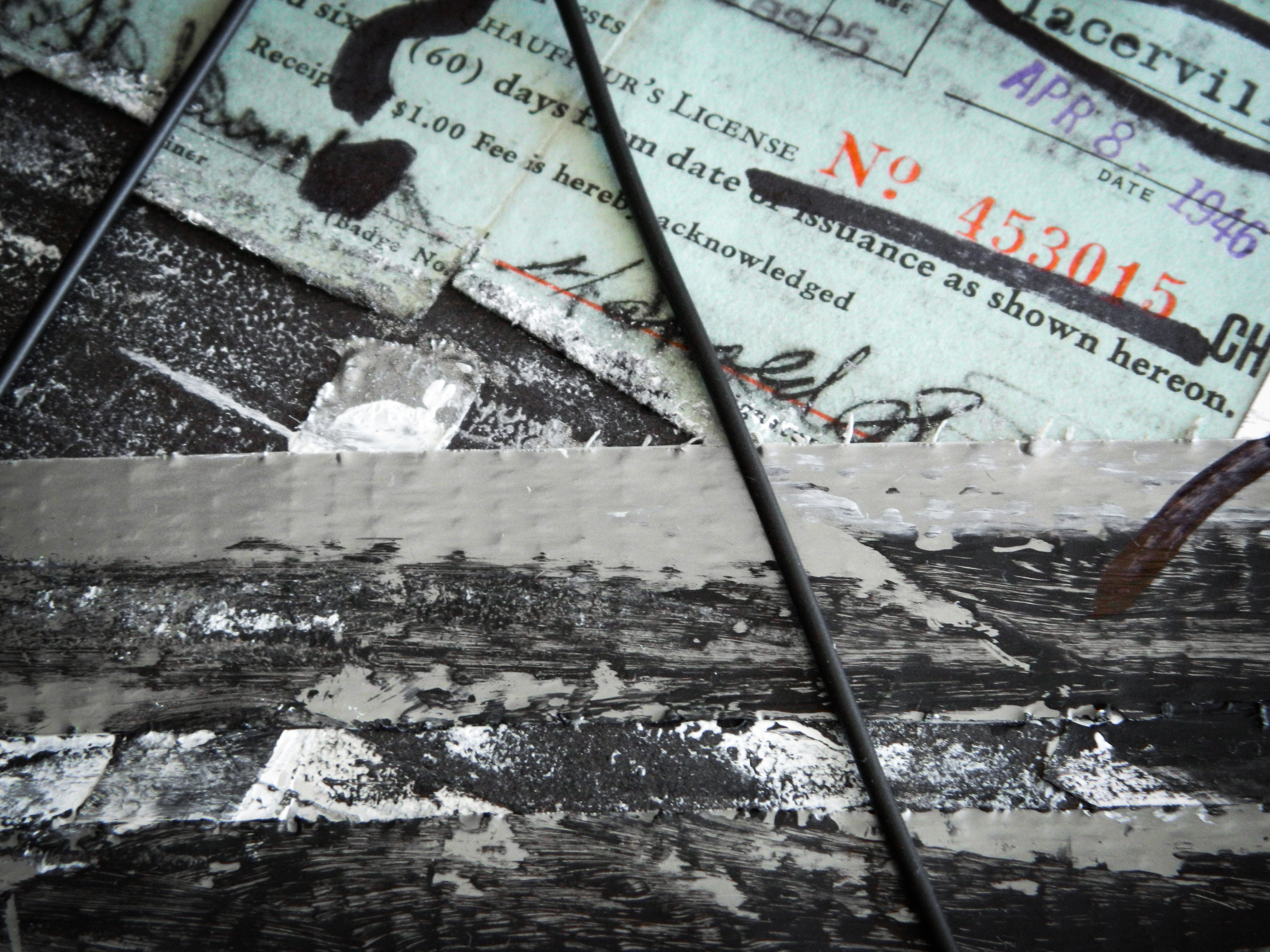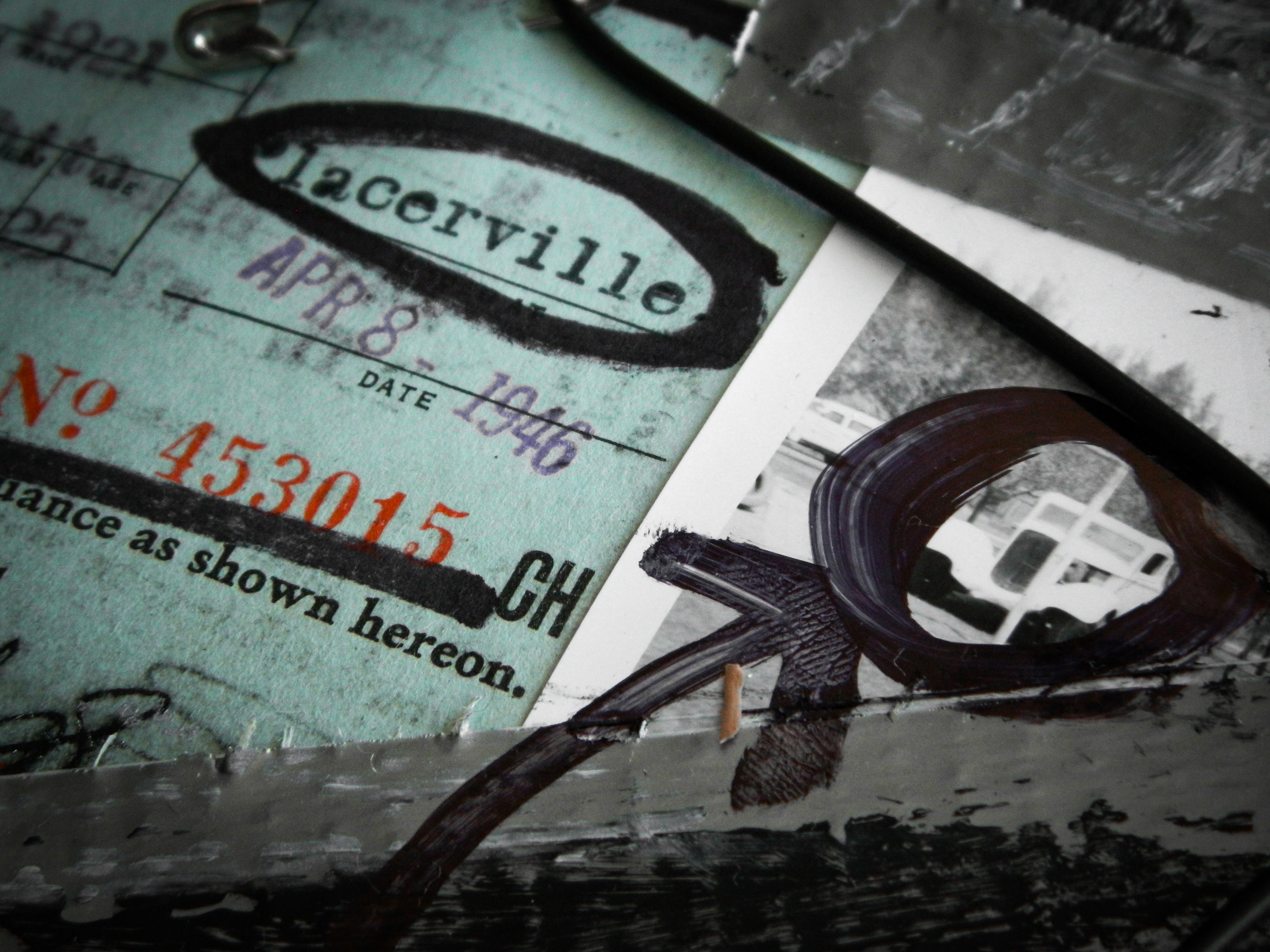 Acrylic, ink, duct tape, electrical wire, aluminum form wire, office supplies, and antique documents/photographs on paper/cardboard.