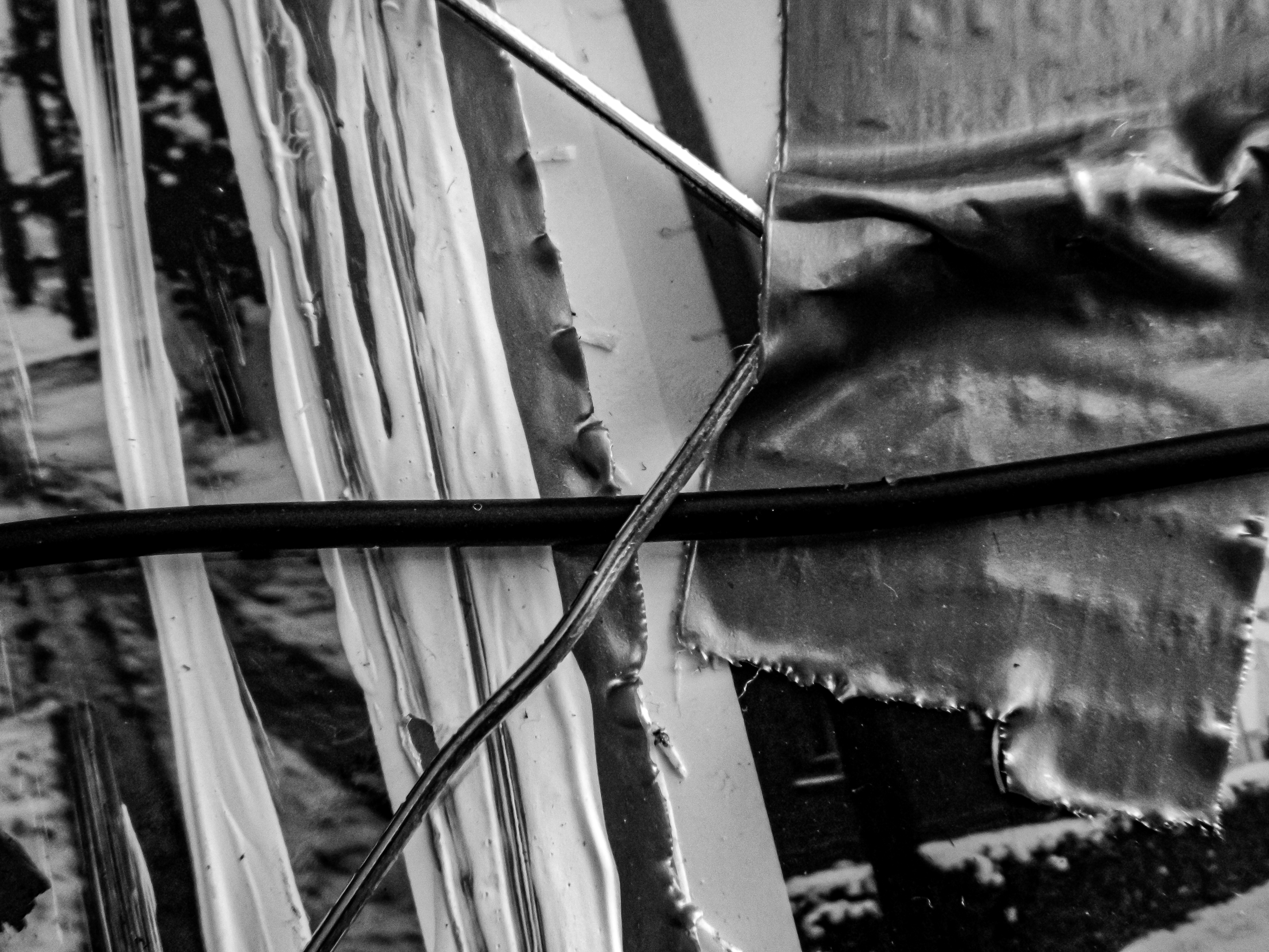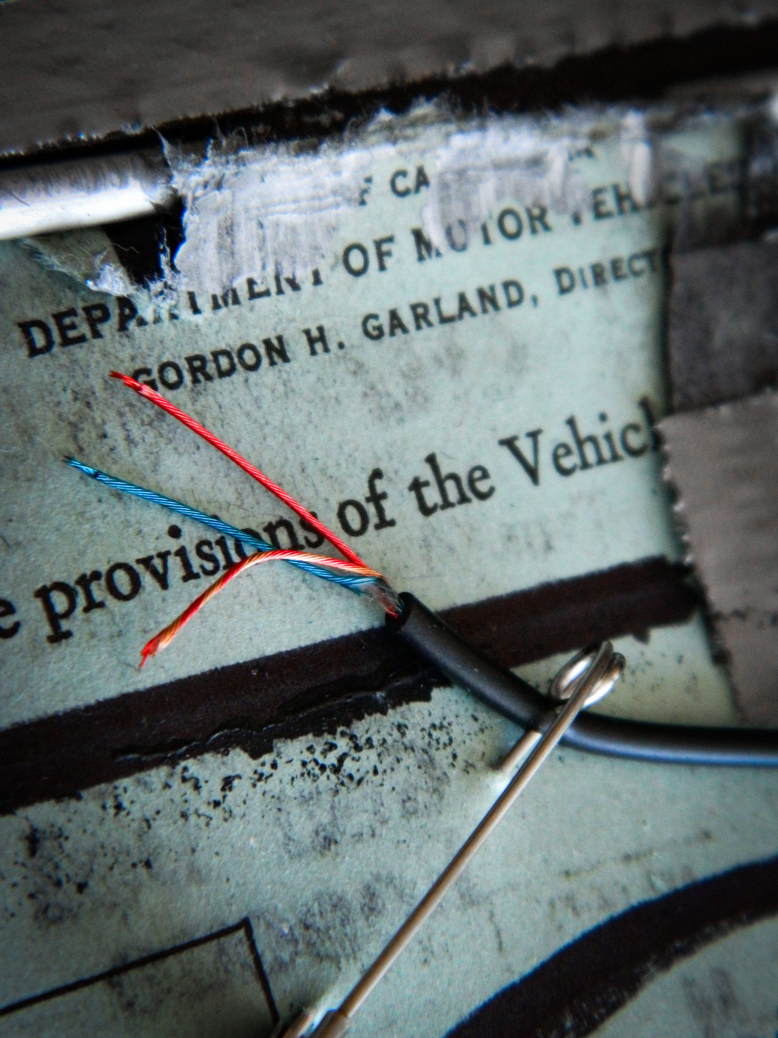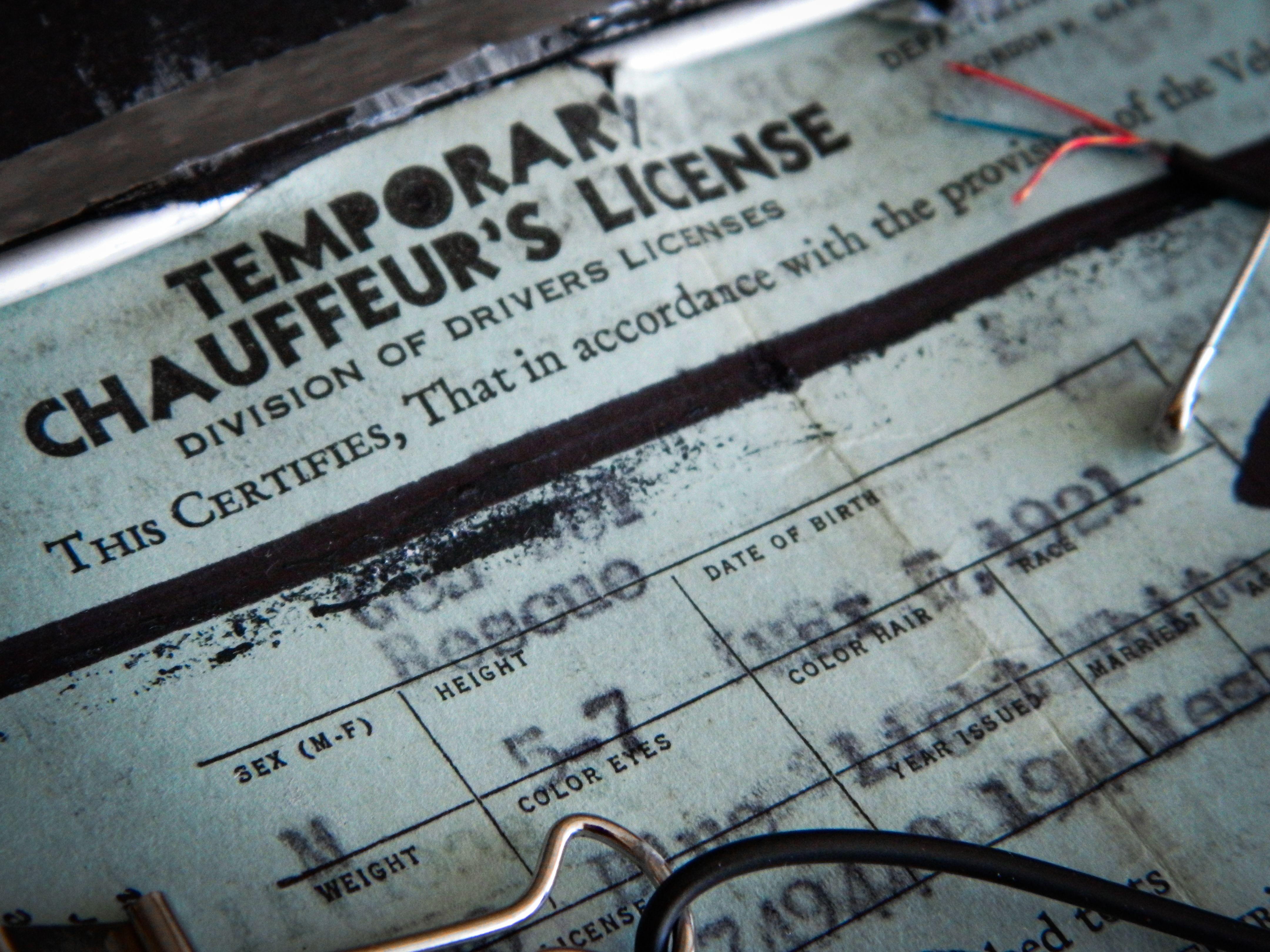 Acrylic, ink, duct tape, electrical wire, aluminum form wire, office supplies, and antique documents/photographs on paper/cardboard.