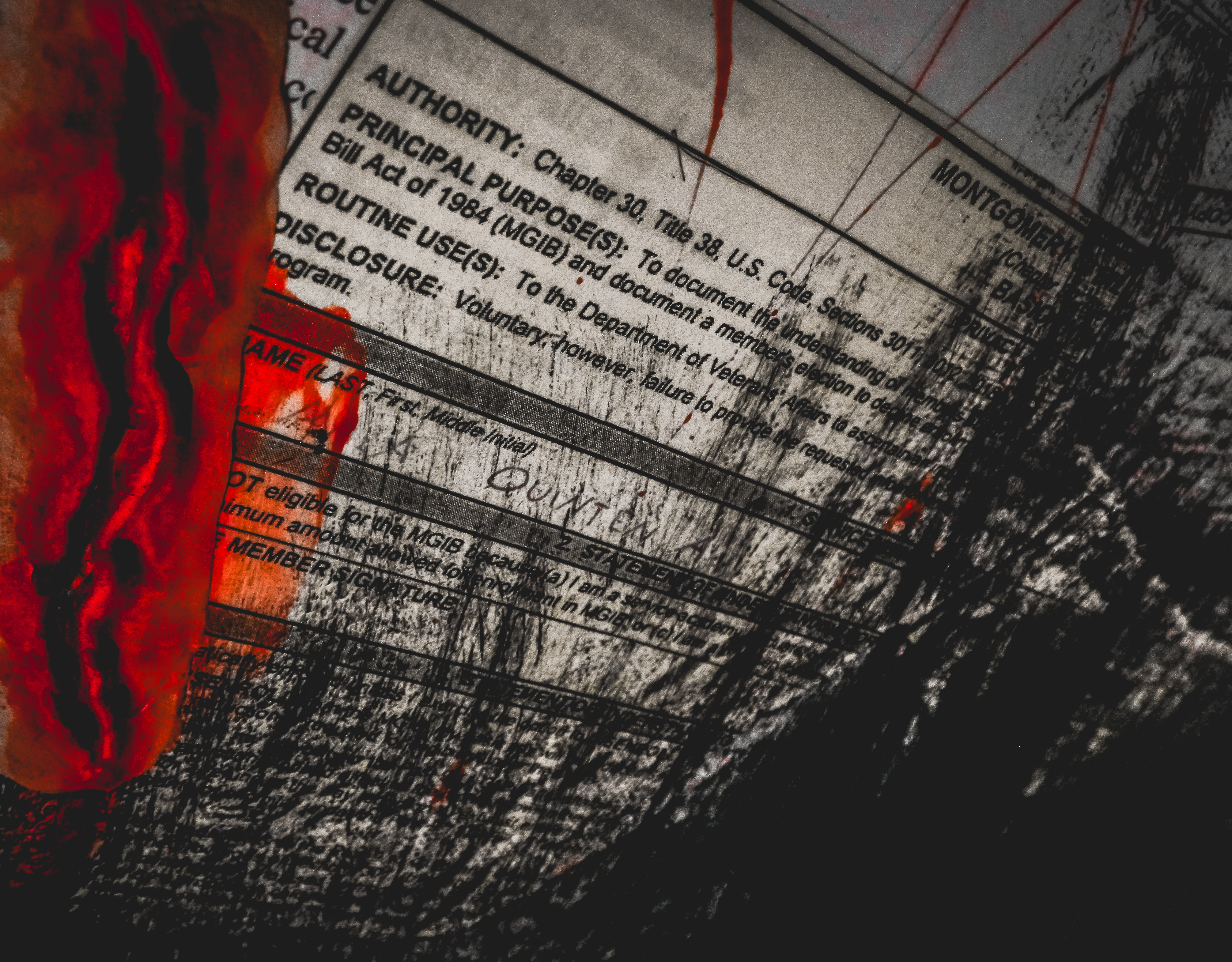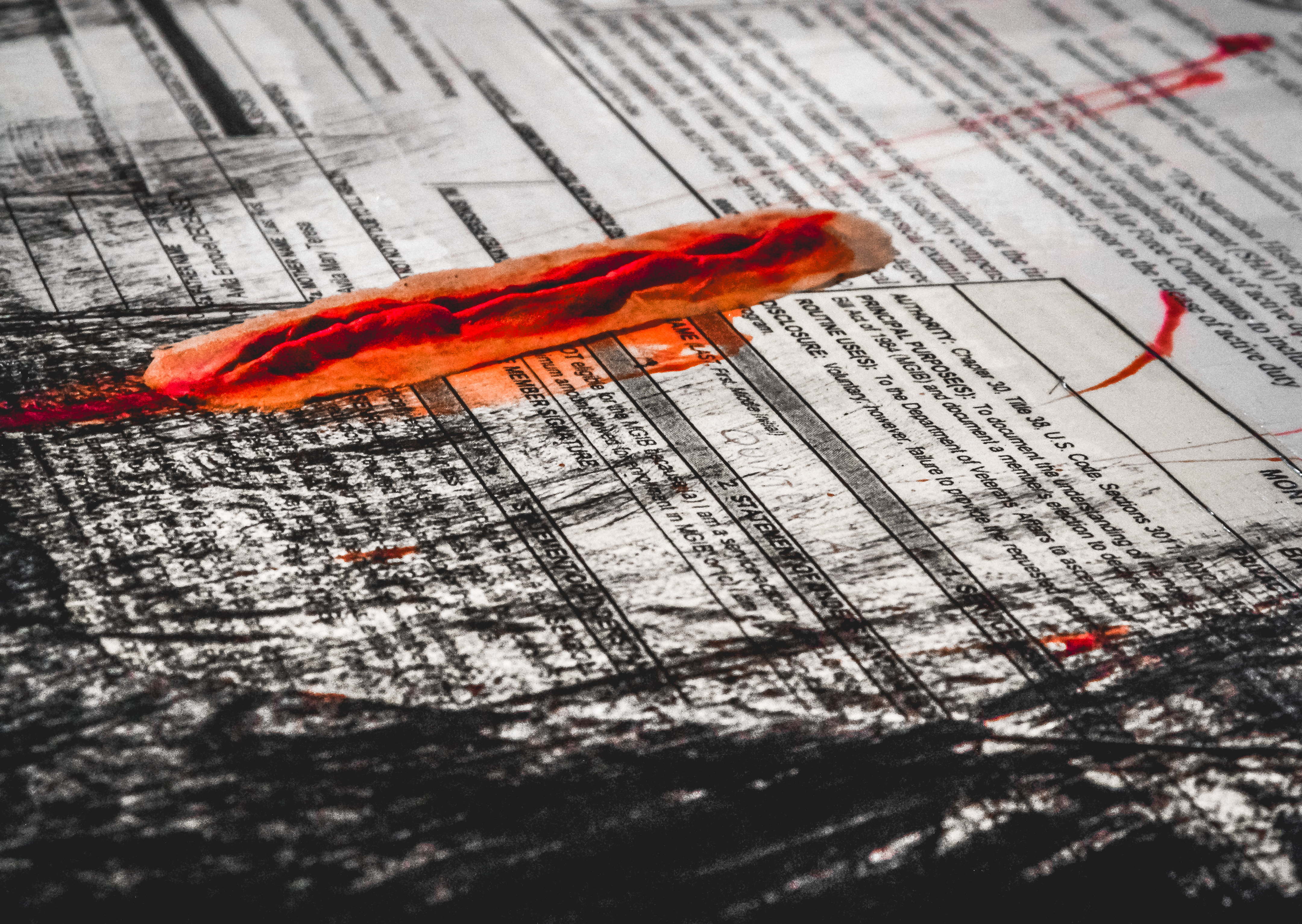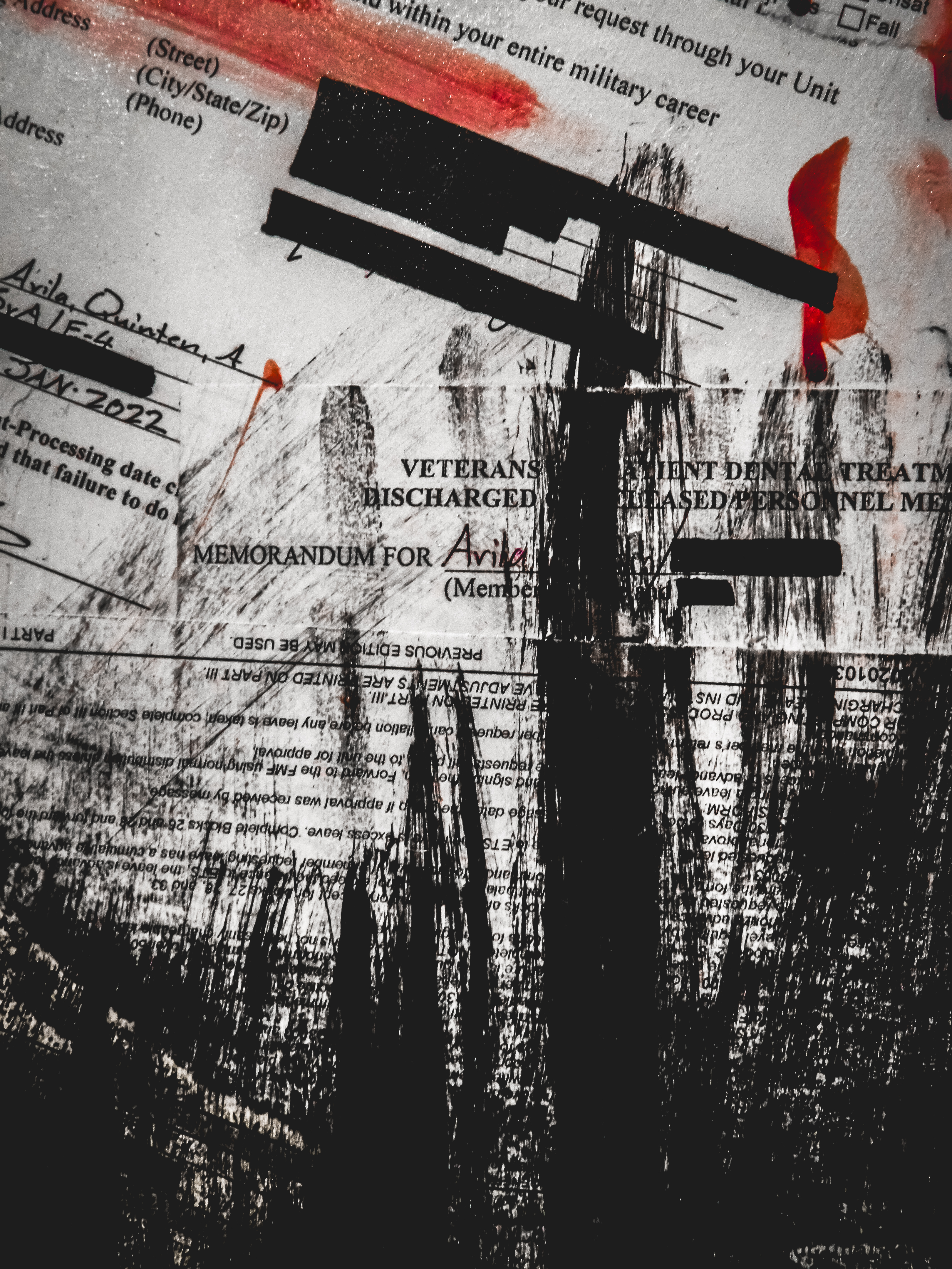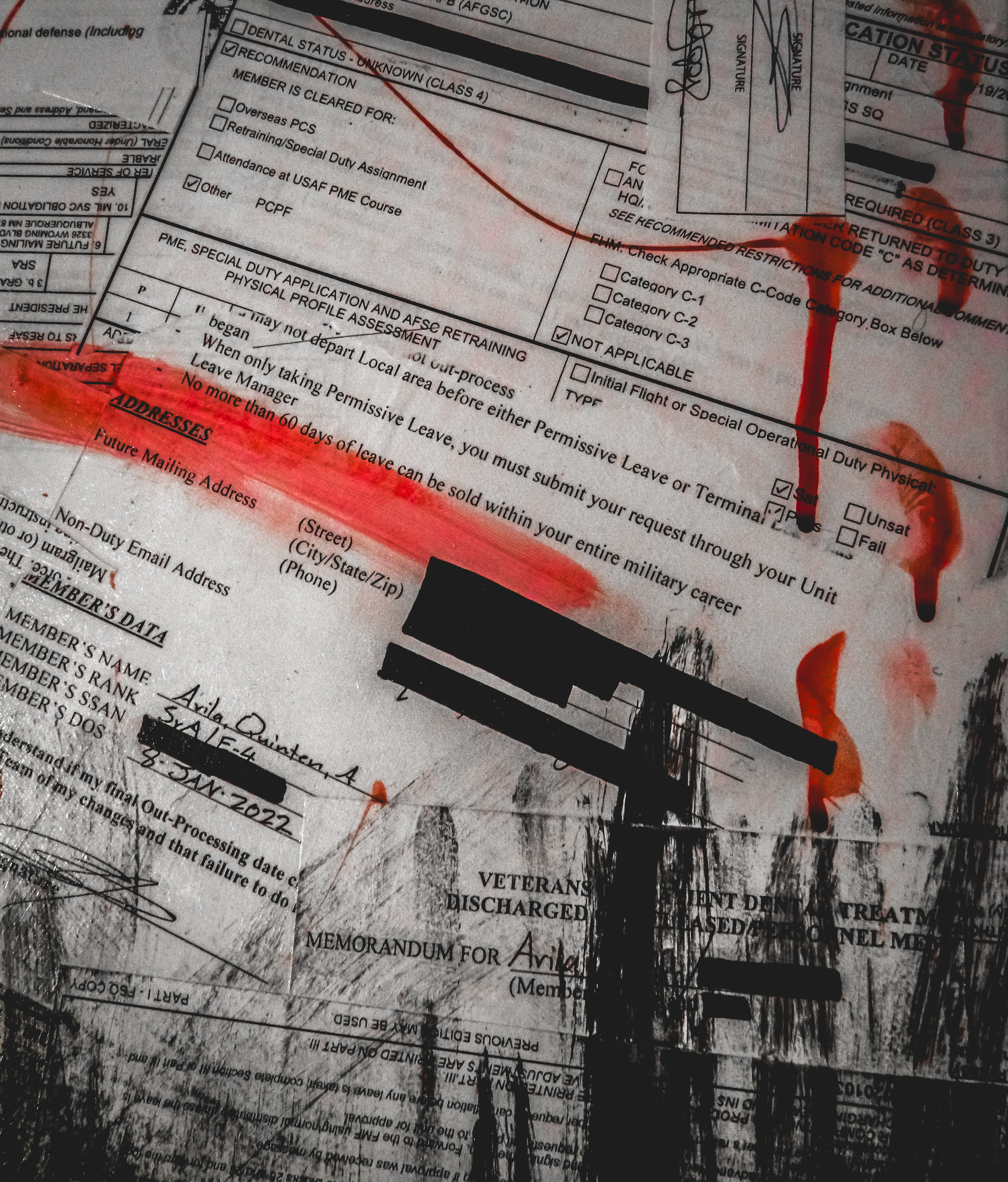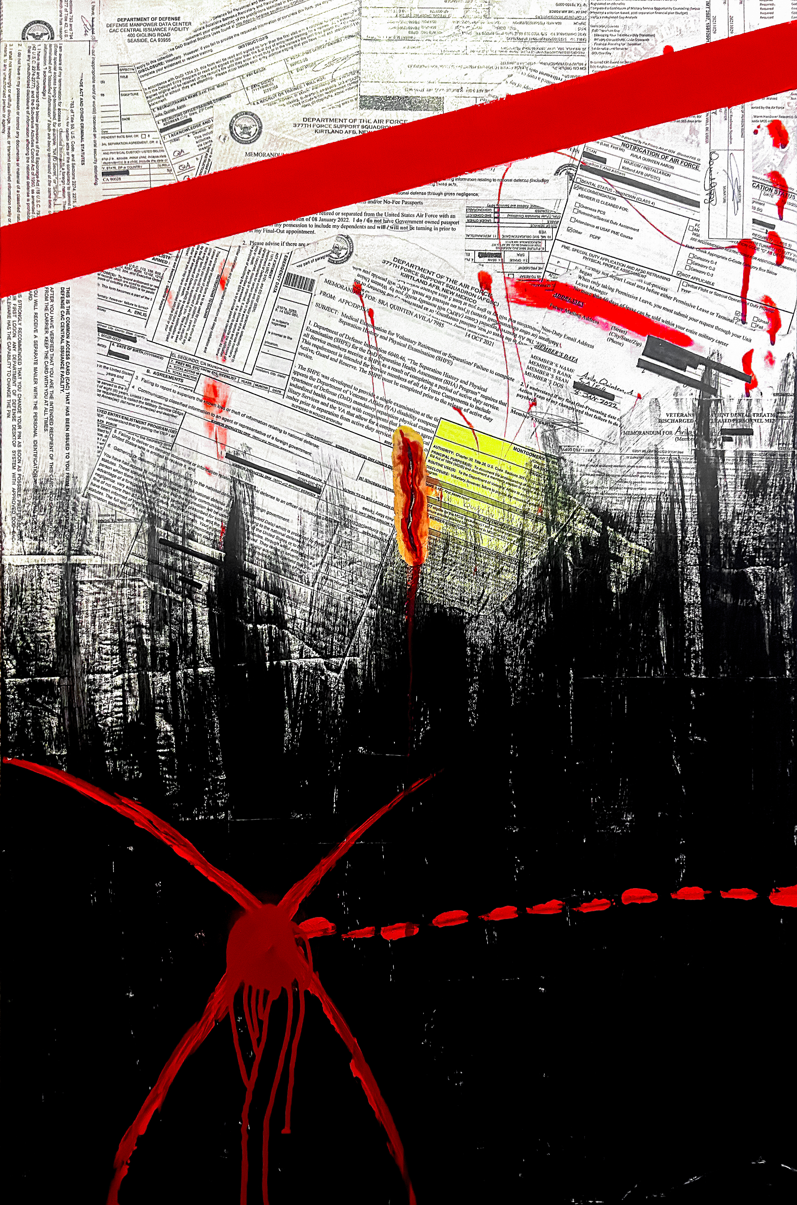 Acrylic, duct tape, fake blood, wound effect, and military contract documents on canvas.