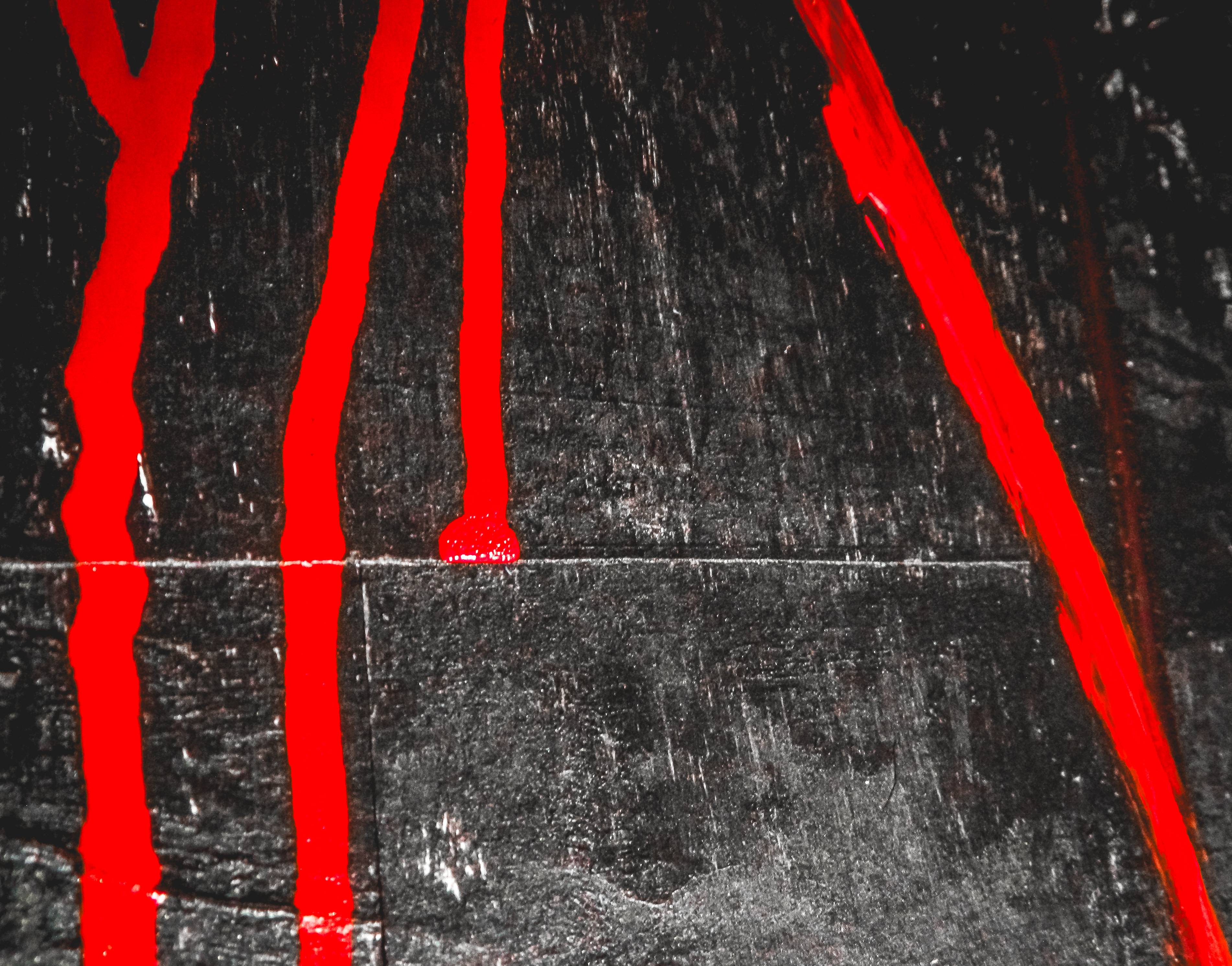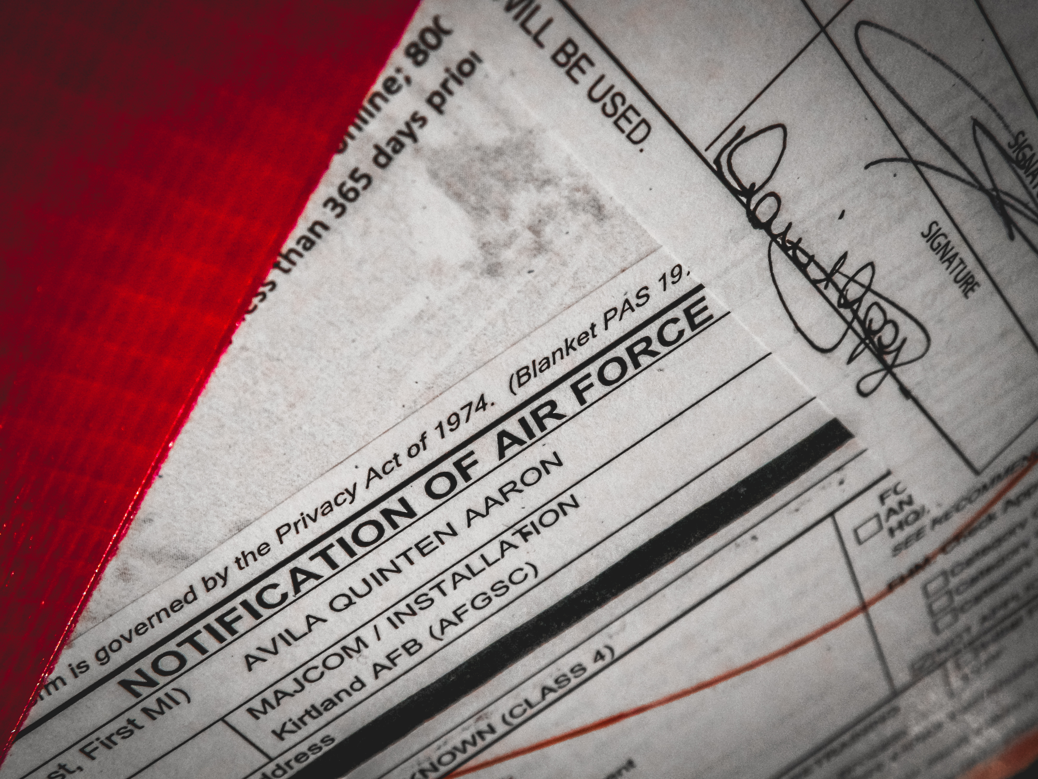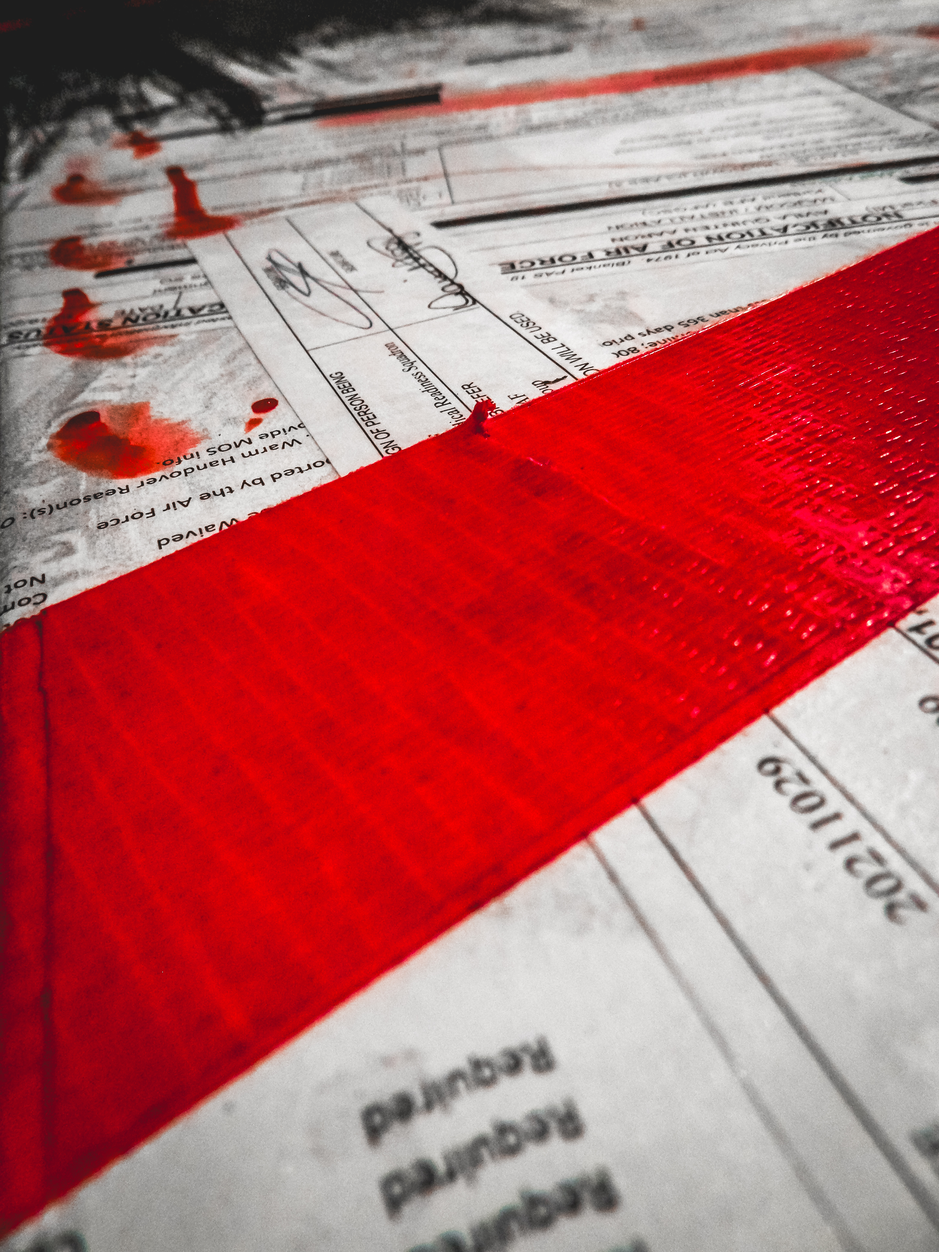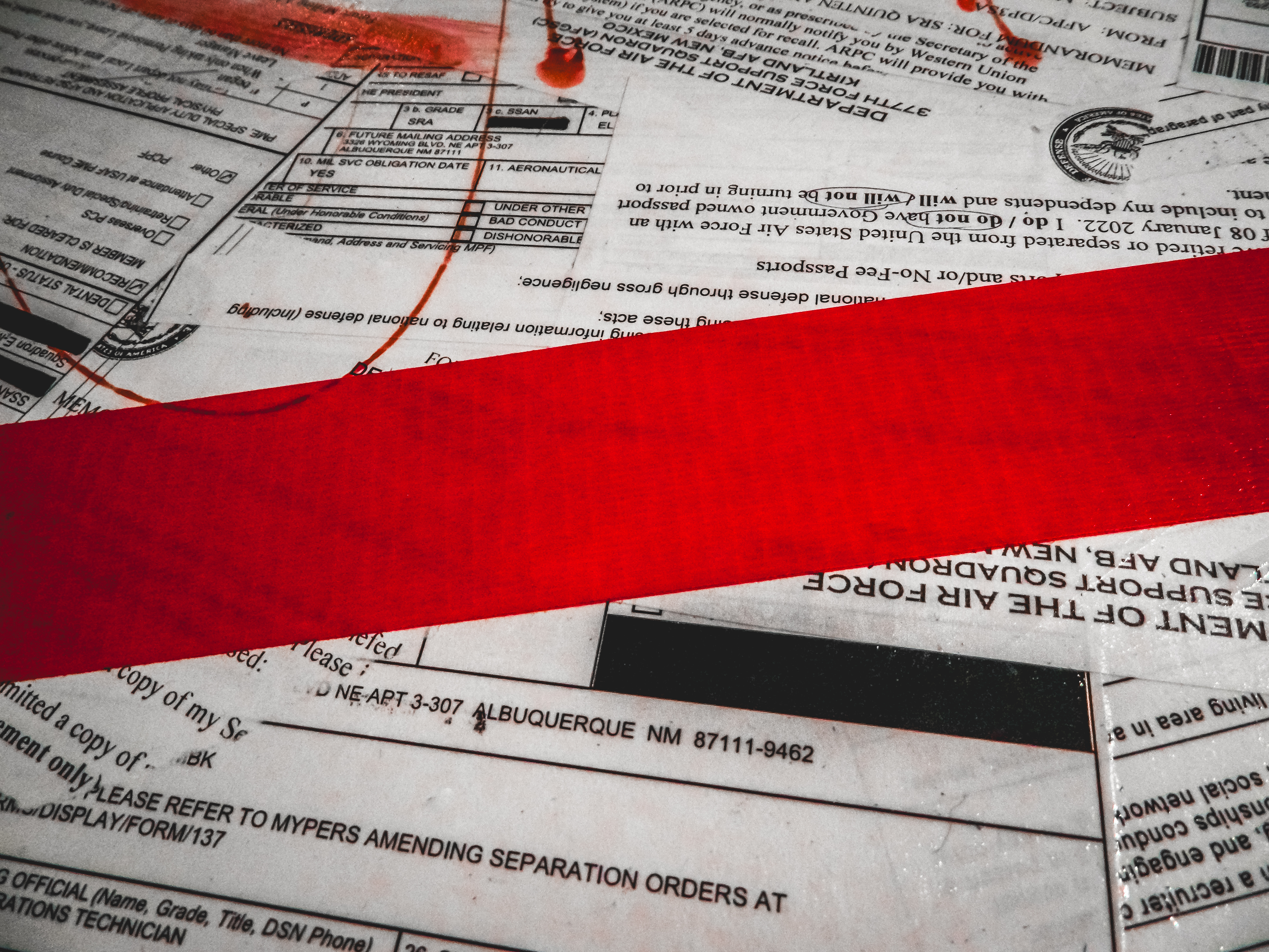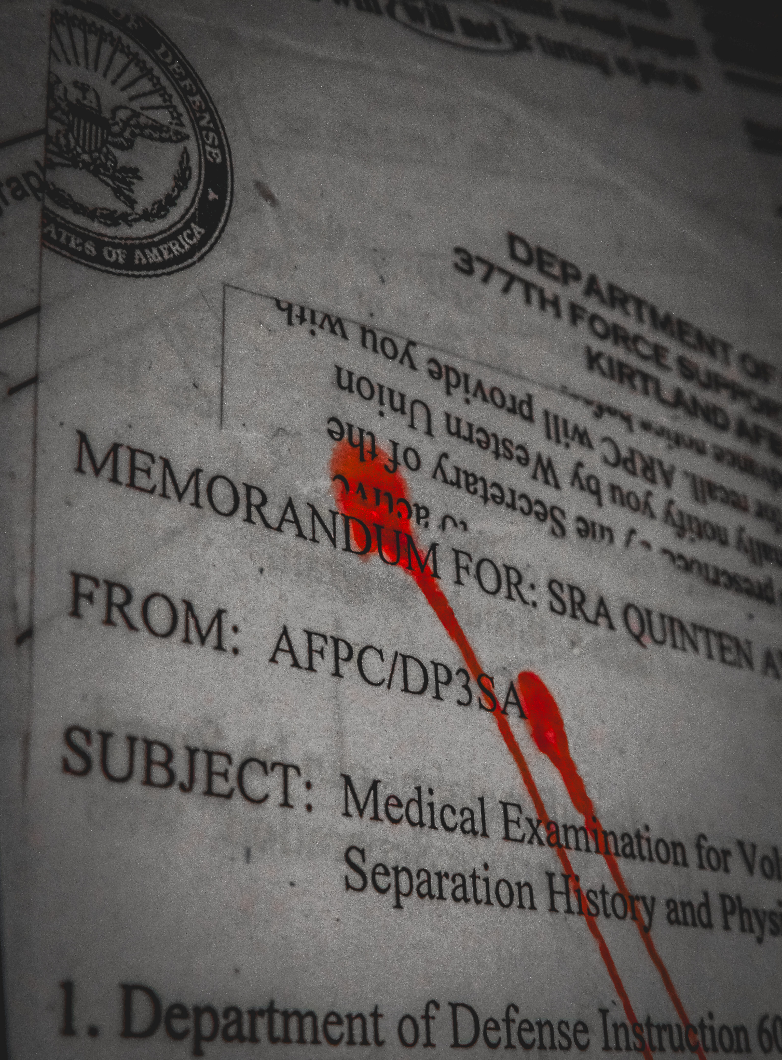 Acrylic, duct tape, fake blood, wound effect, and military contract documents on canvas.