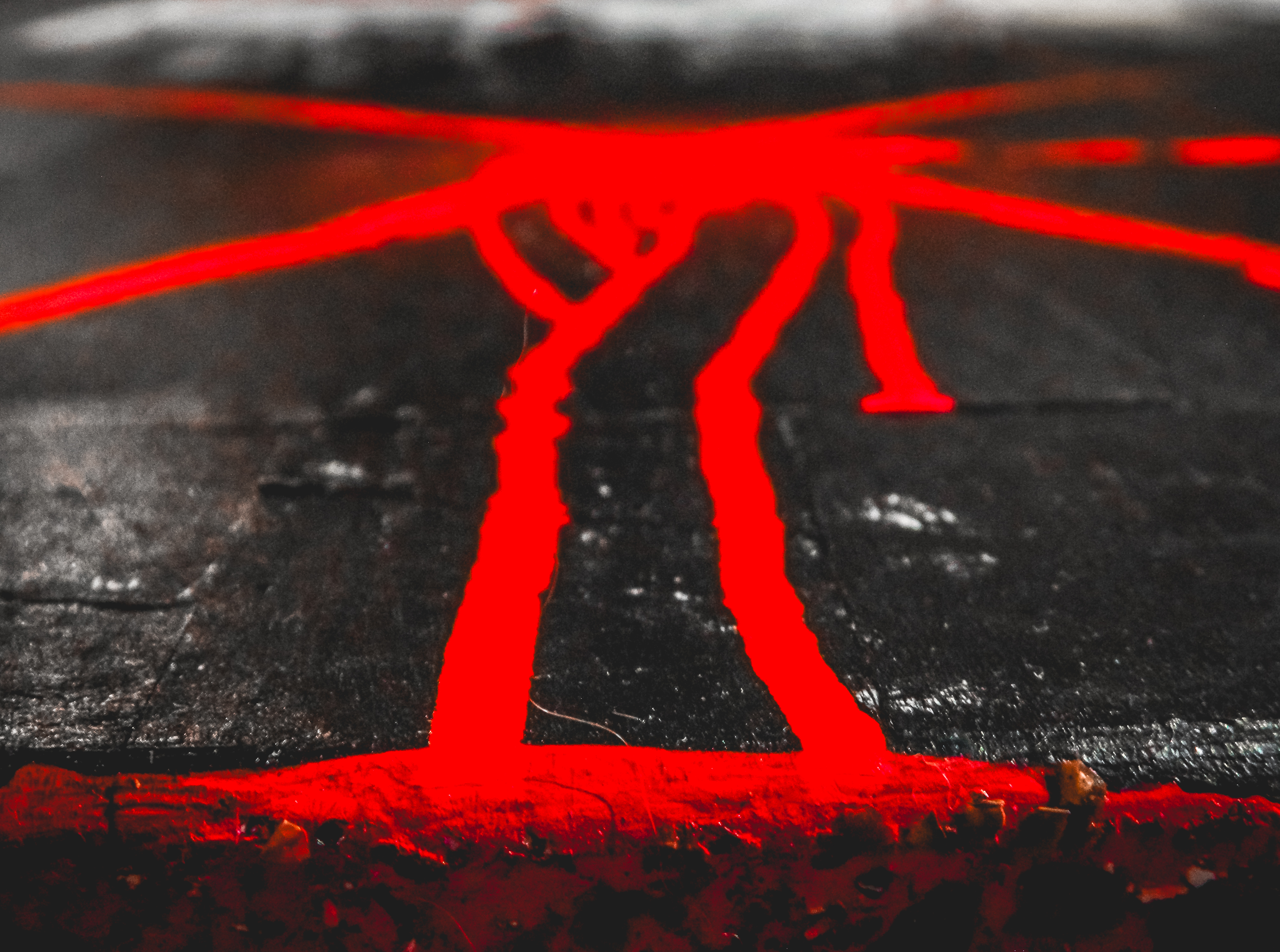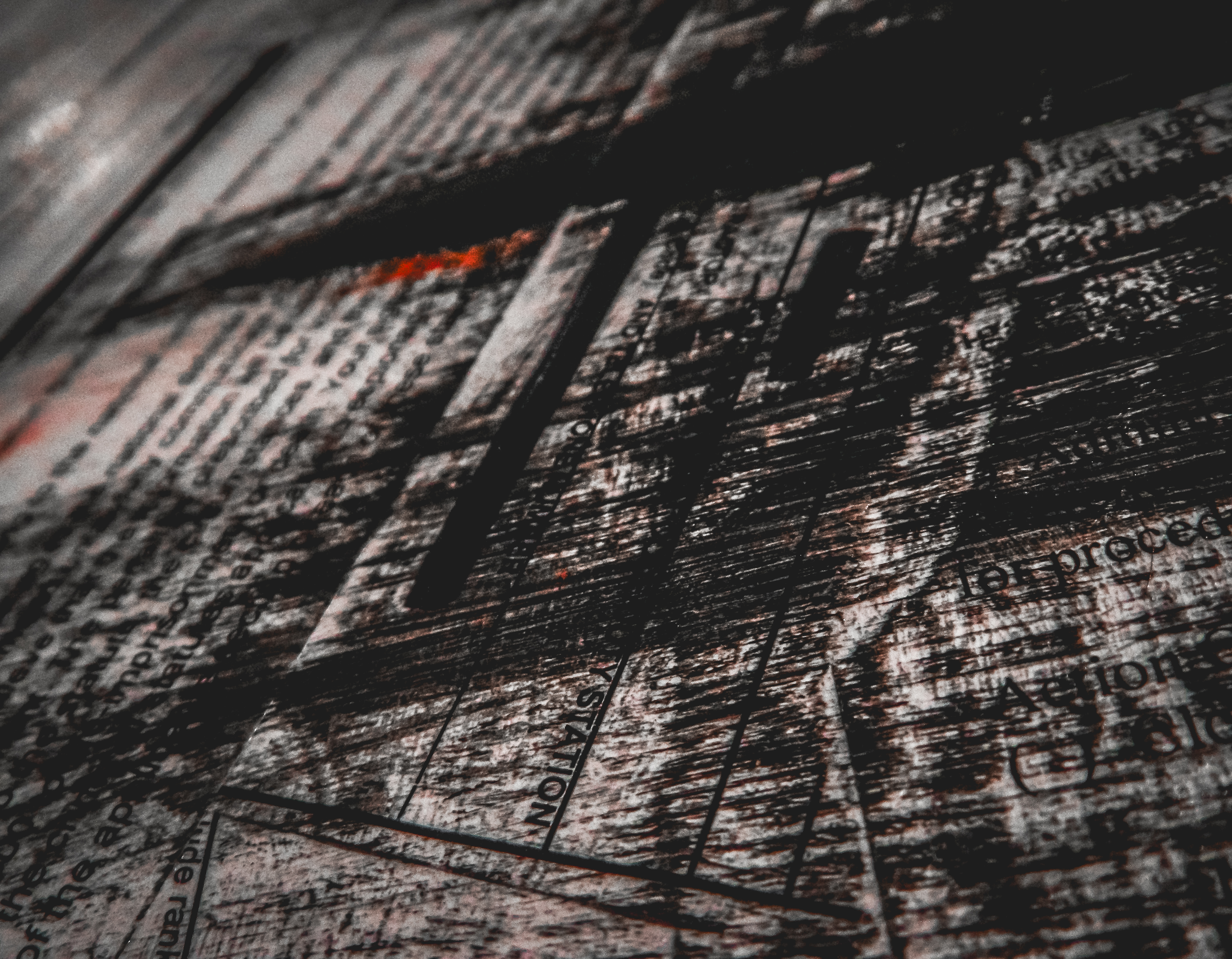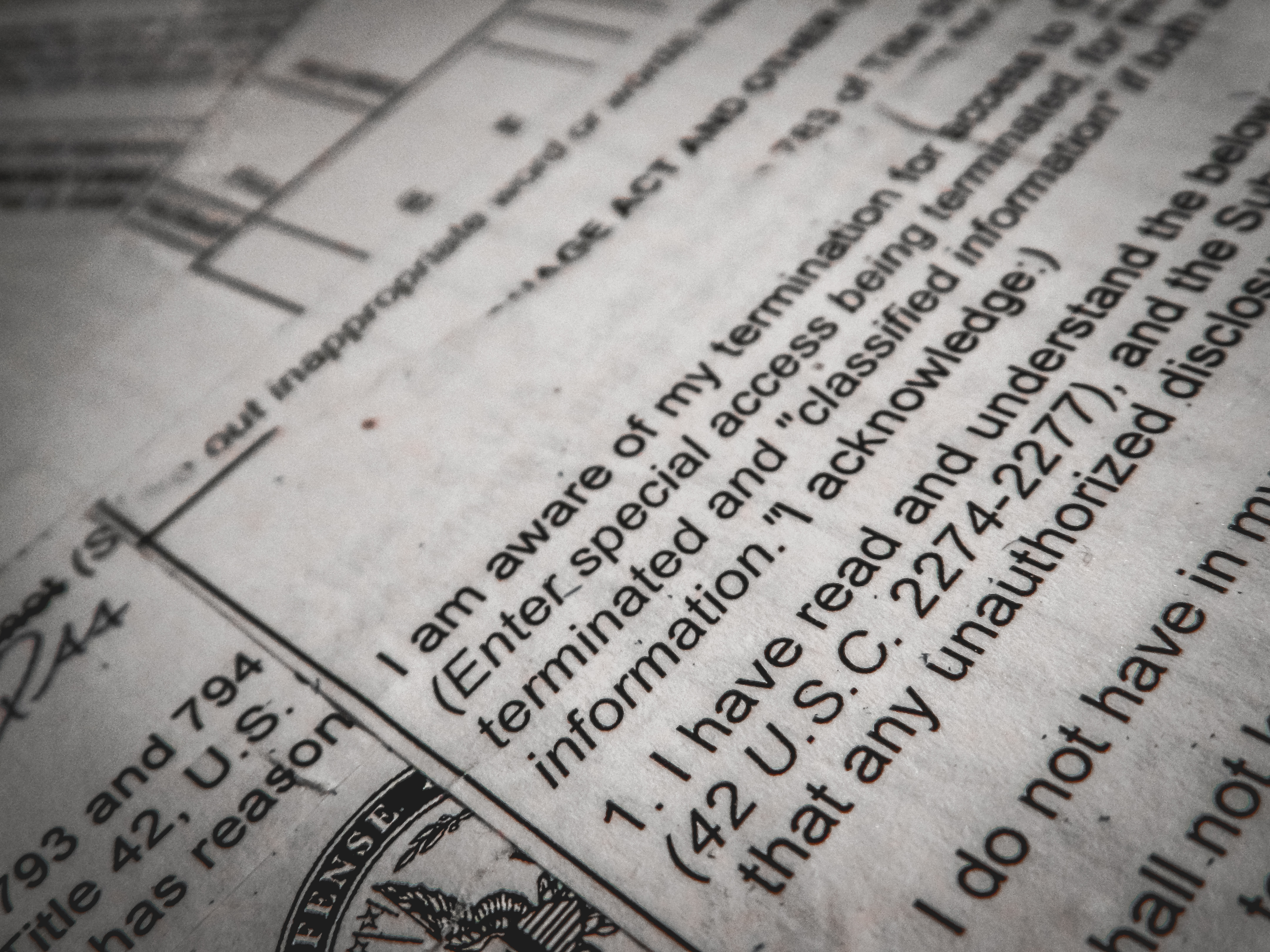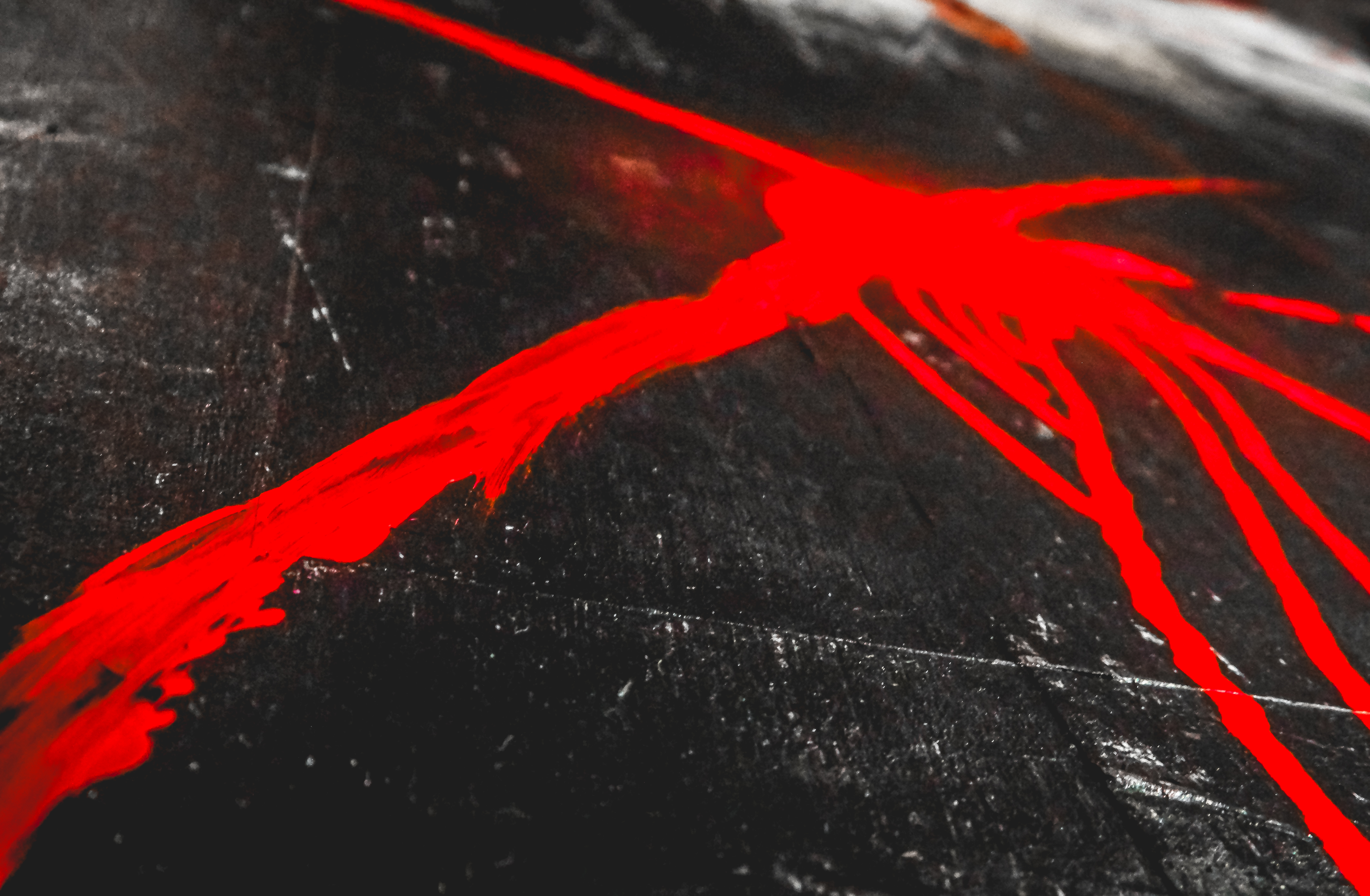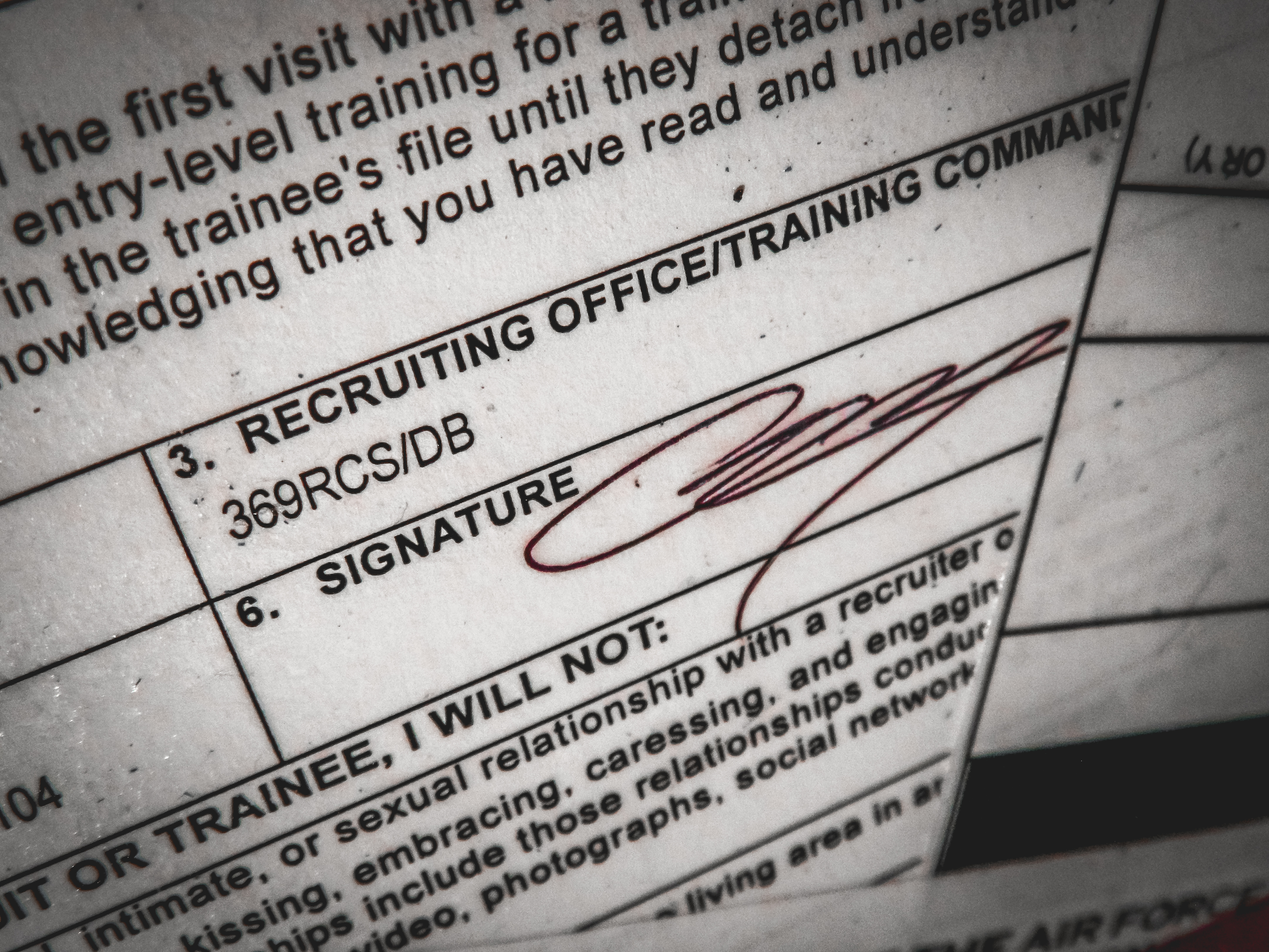 Acrylic, duct tape, fake blood, wound effect, and military contract documents on canvas.